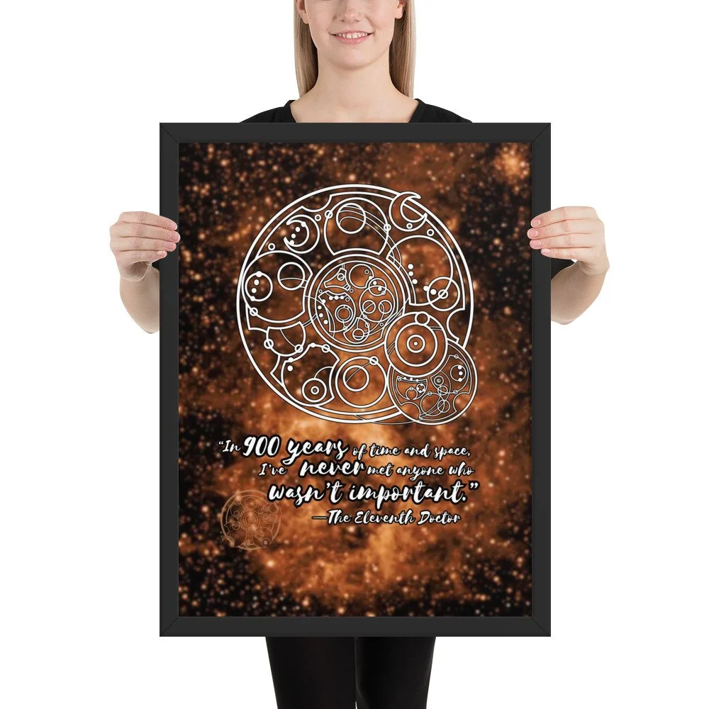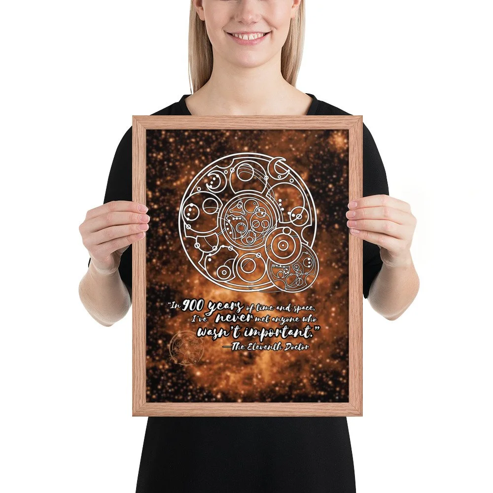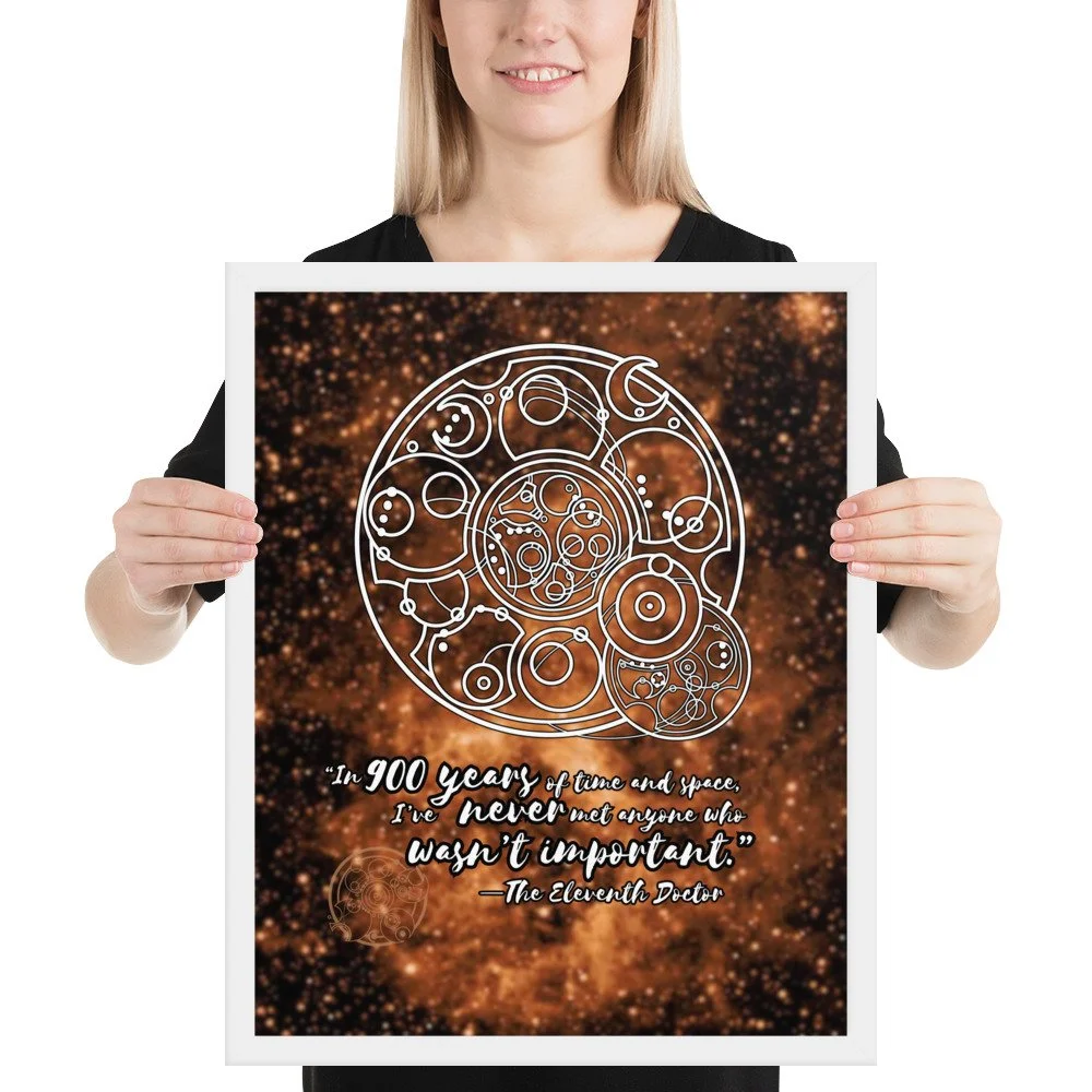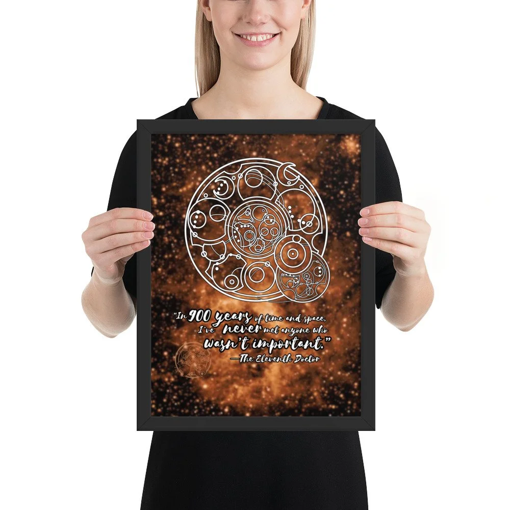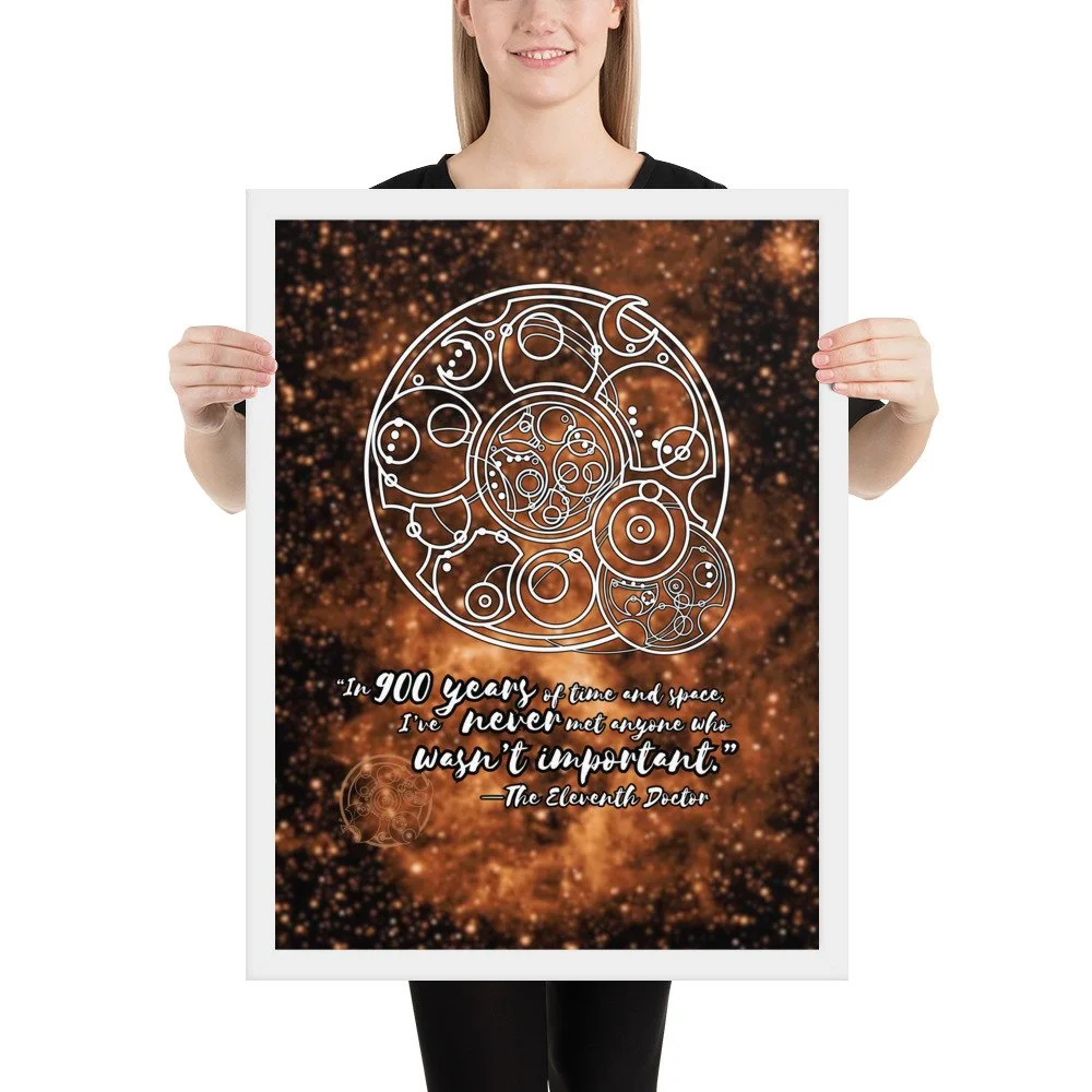 Bring home the wisdom and compassion of the 11th Doctor with this iconic quote from the special "A Christmas Carol," written in Circular Gallifreyan over a starfield background. "In 900 years of time and space, I've never met anyone who wasn't important."