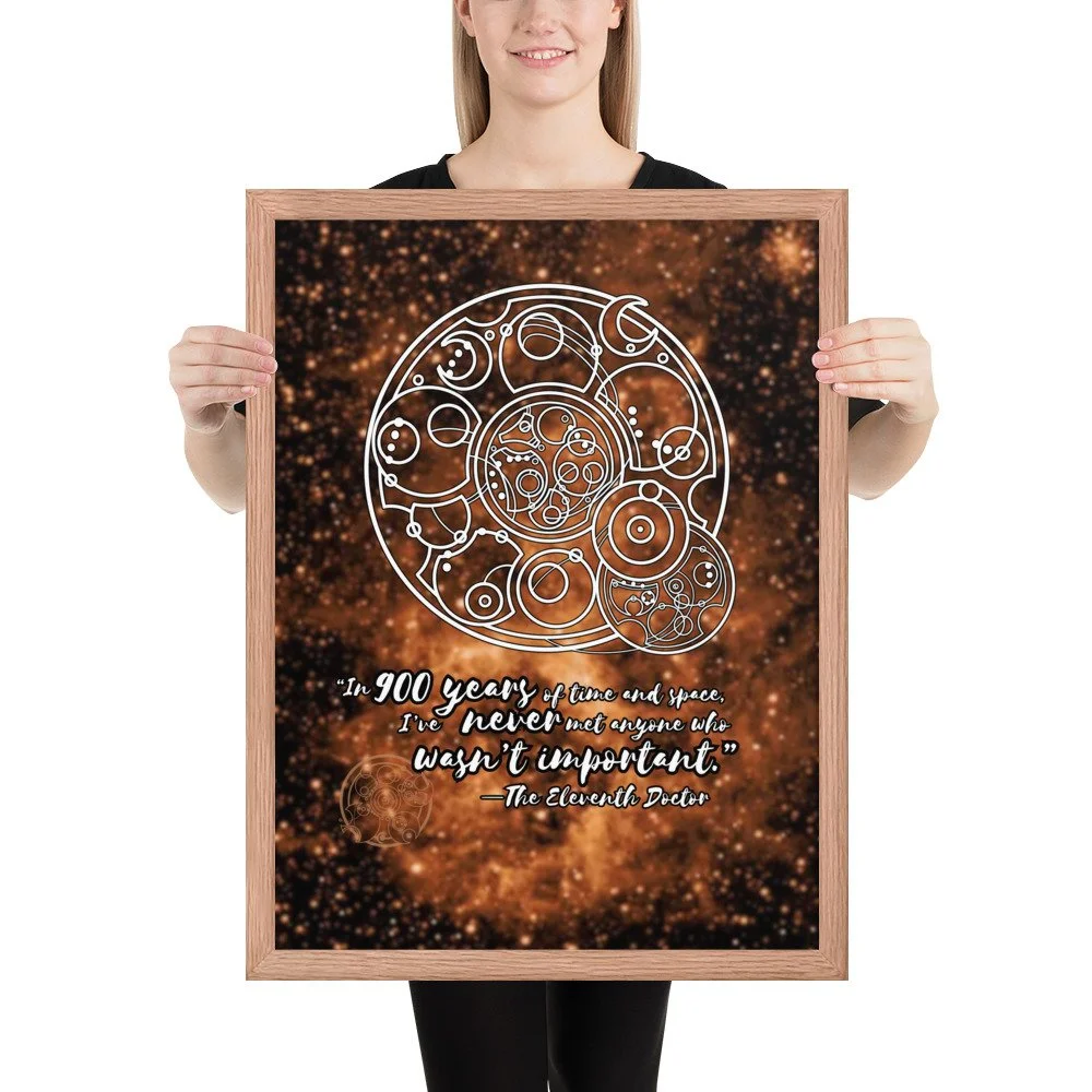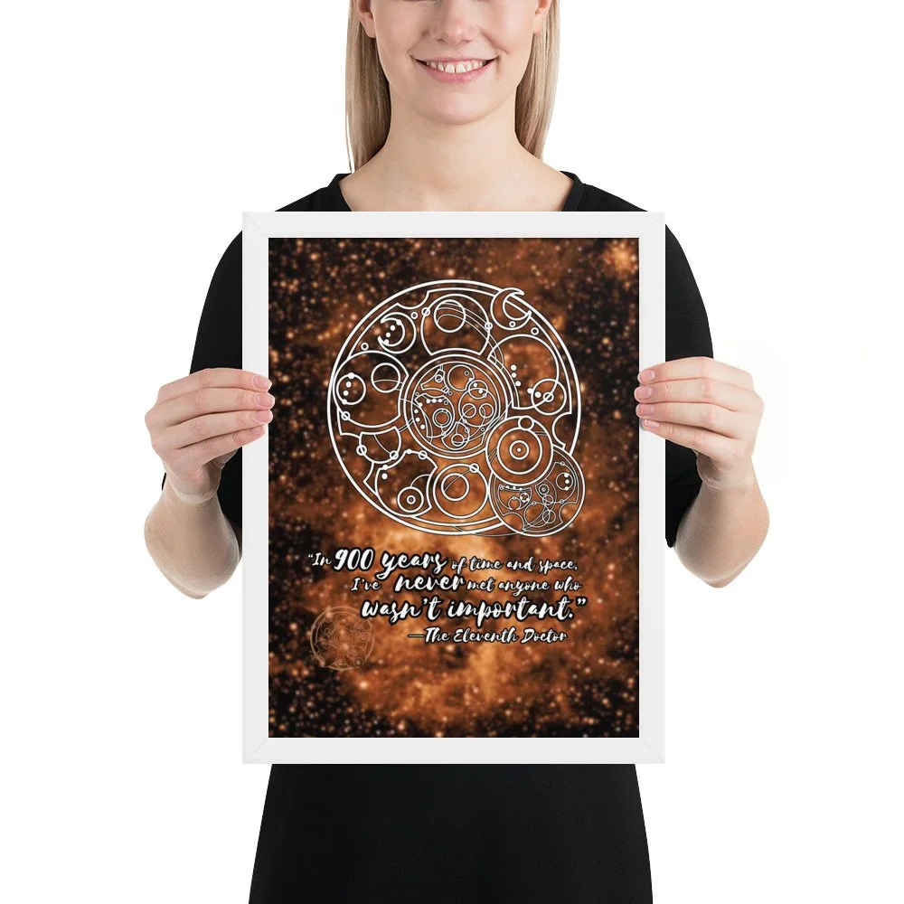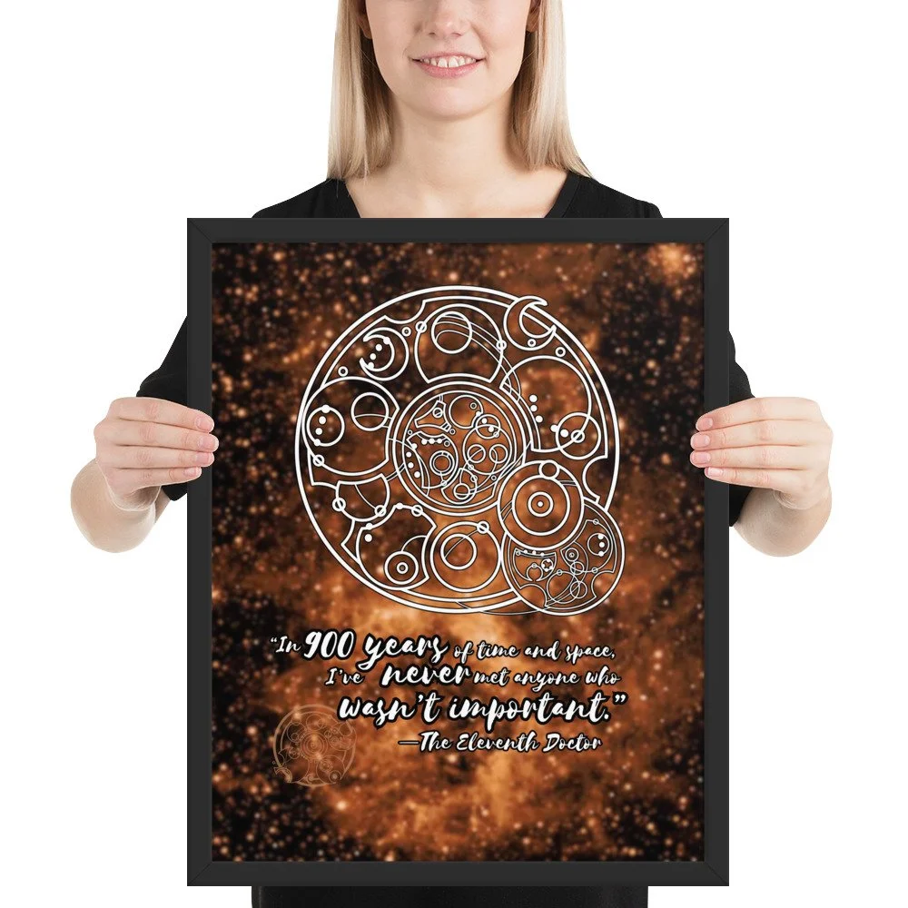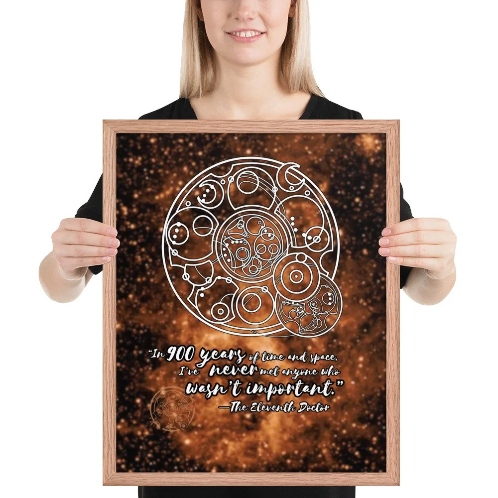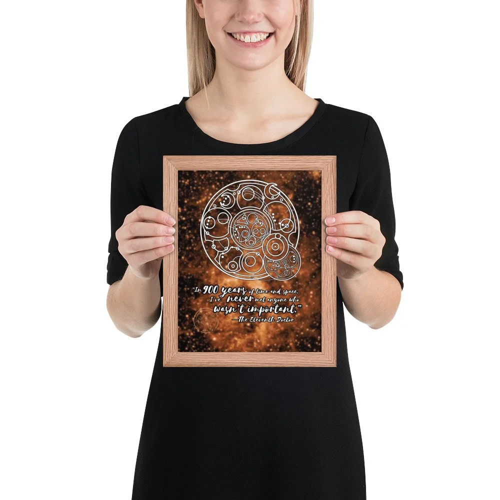 Bring home the wisdom and compassion of the 11th Doctor with this iconic quote from the special "A Christmas Carol," written in Circular Gallifreyan over a starfield background. "In 900 years of time and space, I've never met anyone who wasn't important."