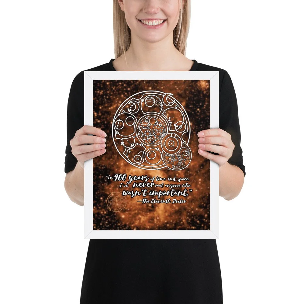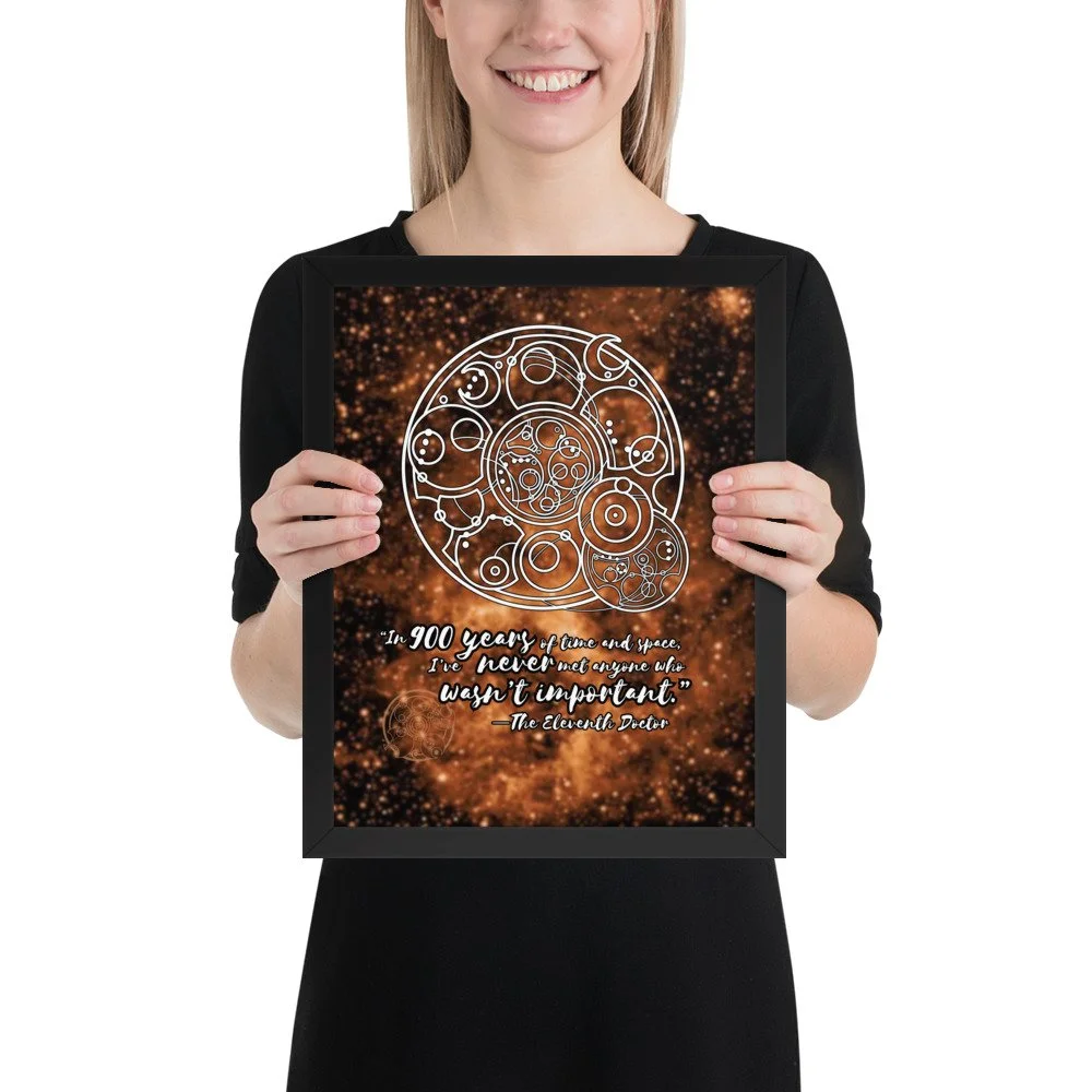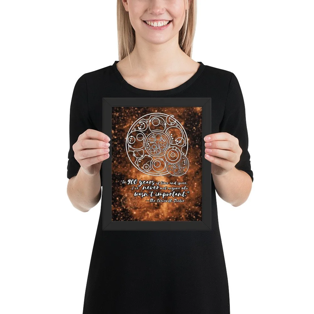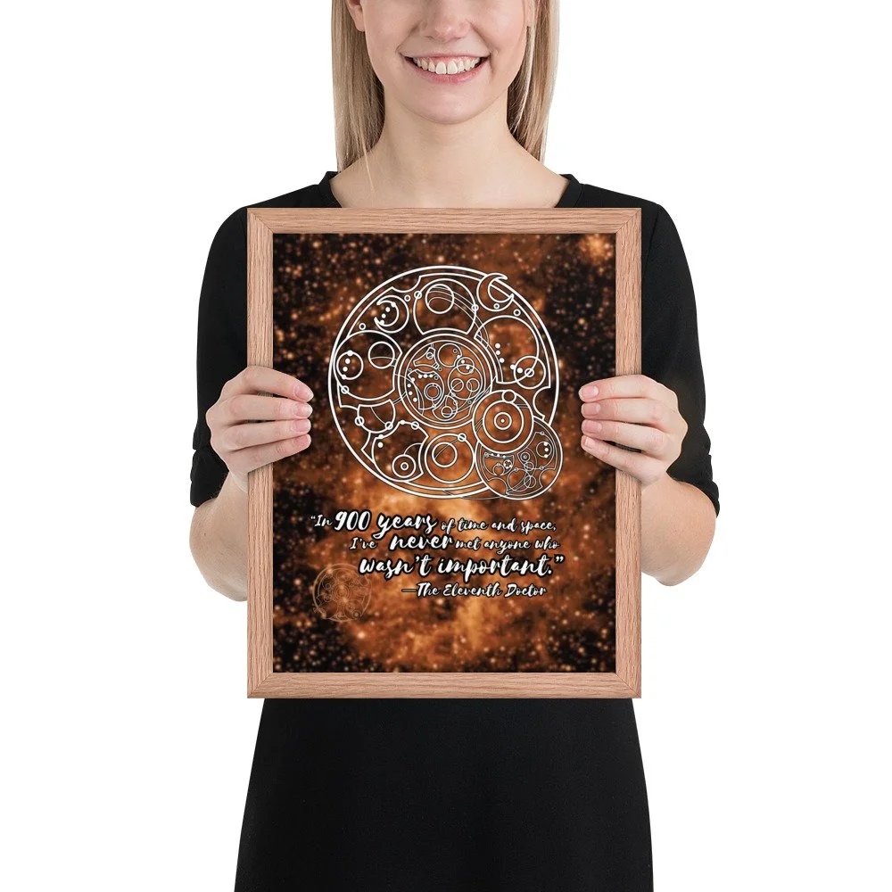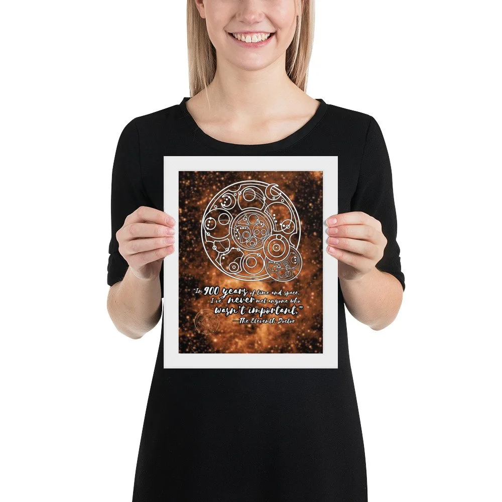 Bring home the wisdom and compassion of the 11th Doctor with this iconic quote from the special "A Christmas Carol," written in Circular Gallifreyan over a starfield background. "In 900 years of time and space, I've never met anyone who wasn't important."
