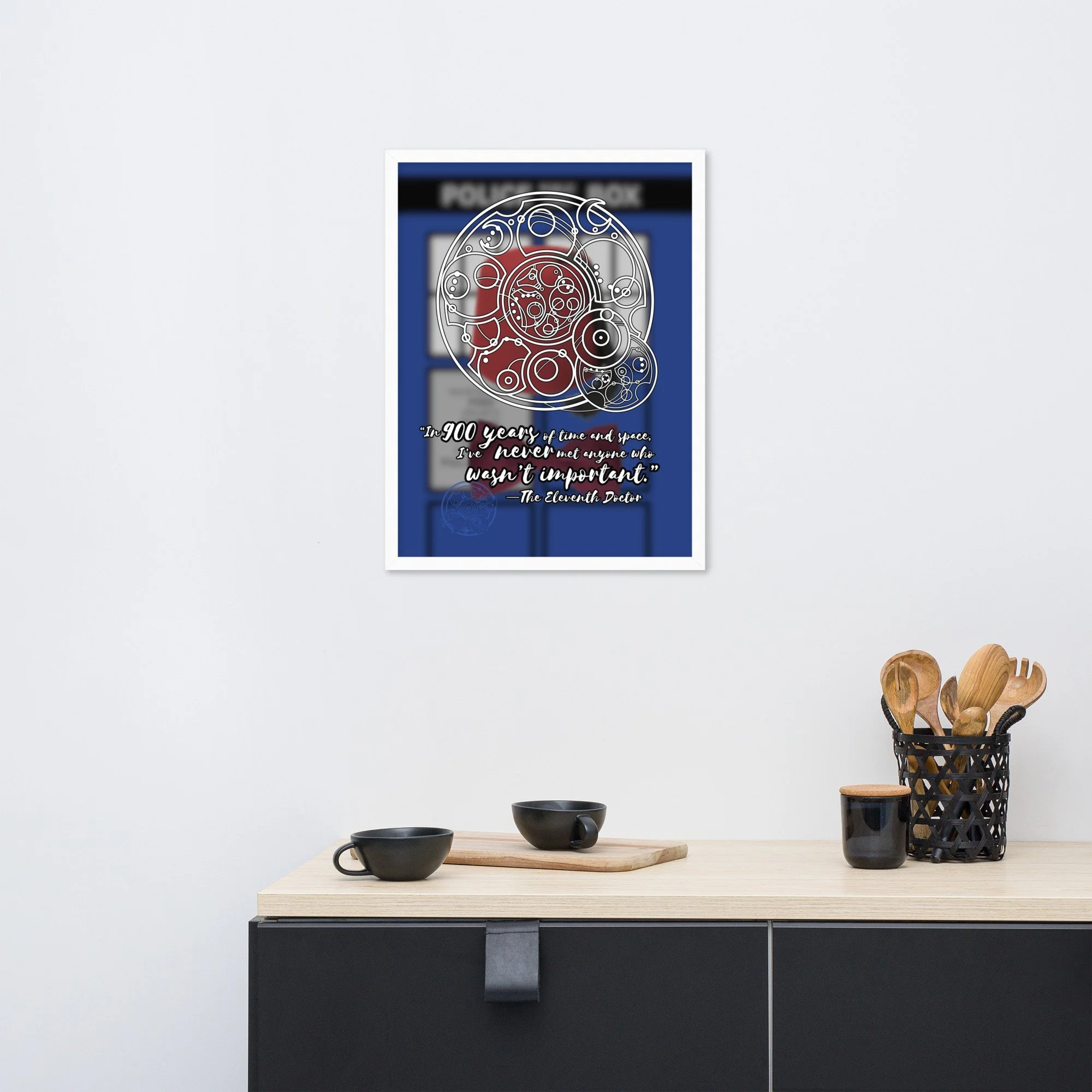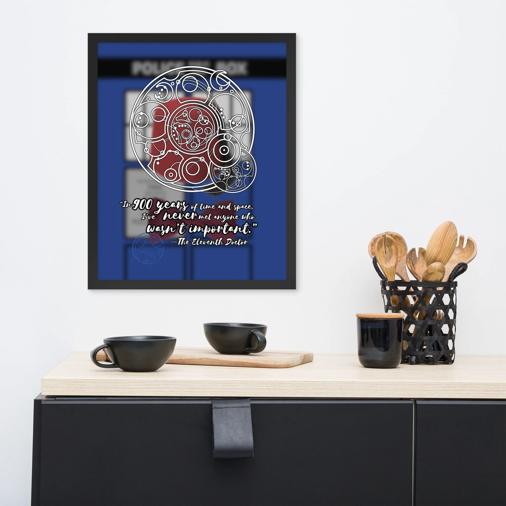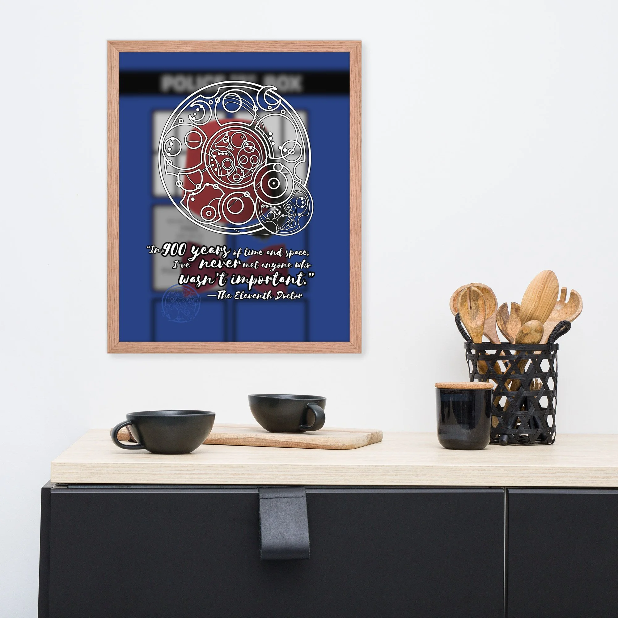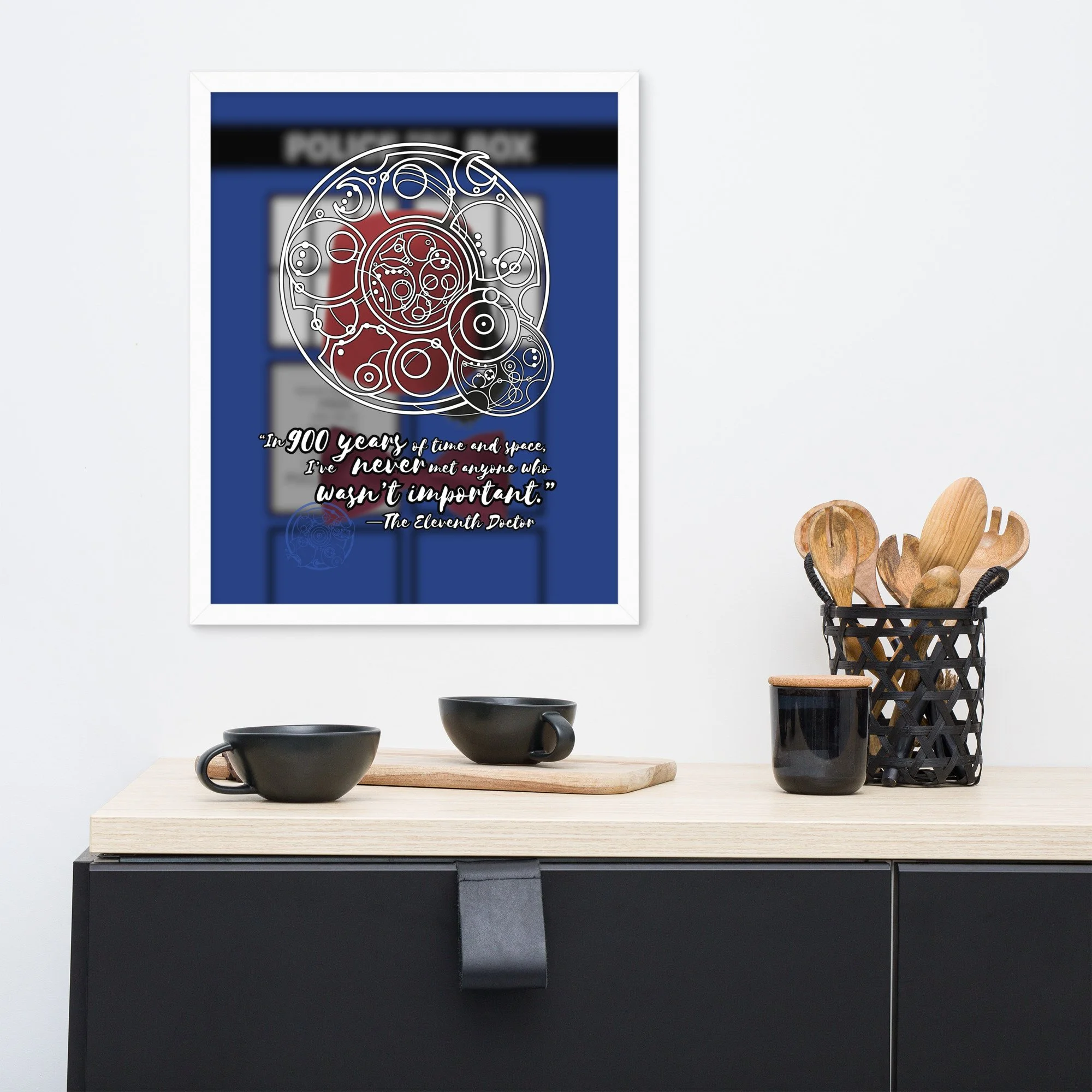 Bring the wisdom of the 11th Doctor into your home with this iconic quote from the special "A Christmas Carol," written in Circular Gallifreyan. "In 900 years of time and space, I've never met anyone who wasn't important." Printed on a background featuring the TARDIS, and the 11th Doctor's signature fez and bow tie.