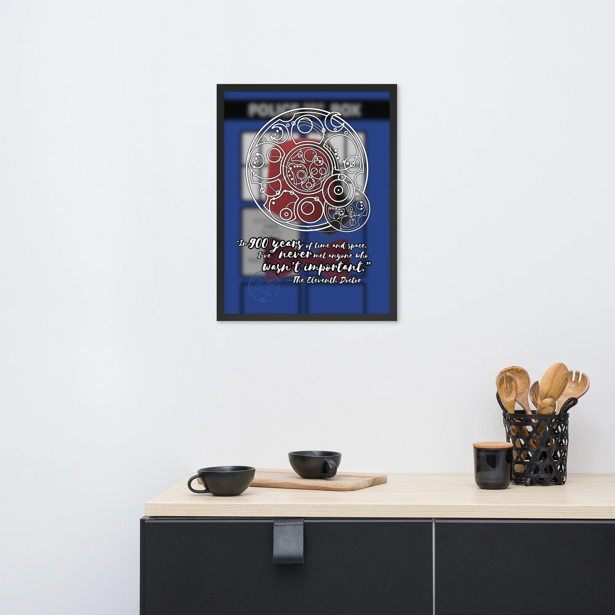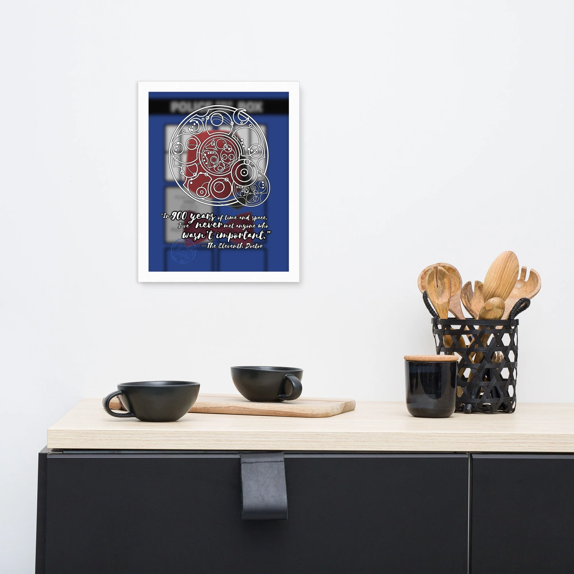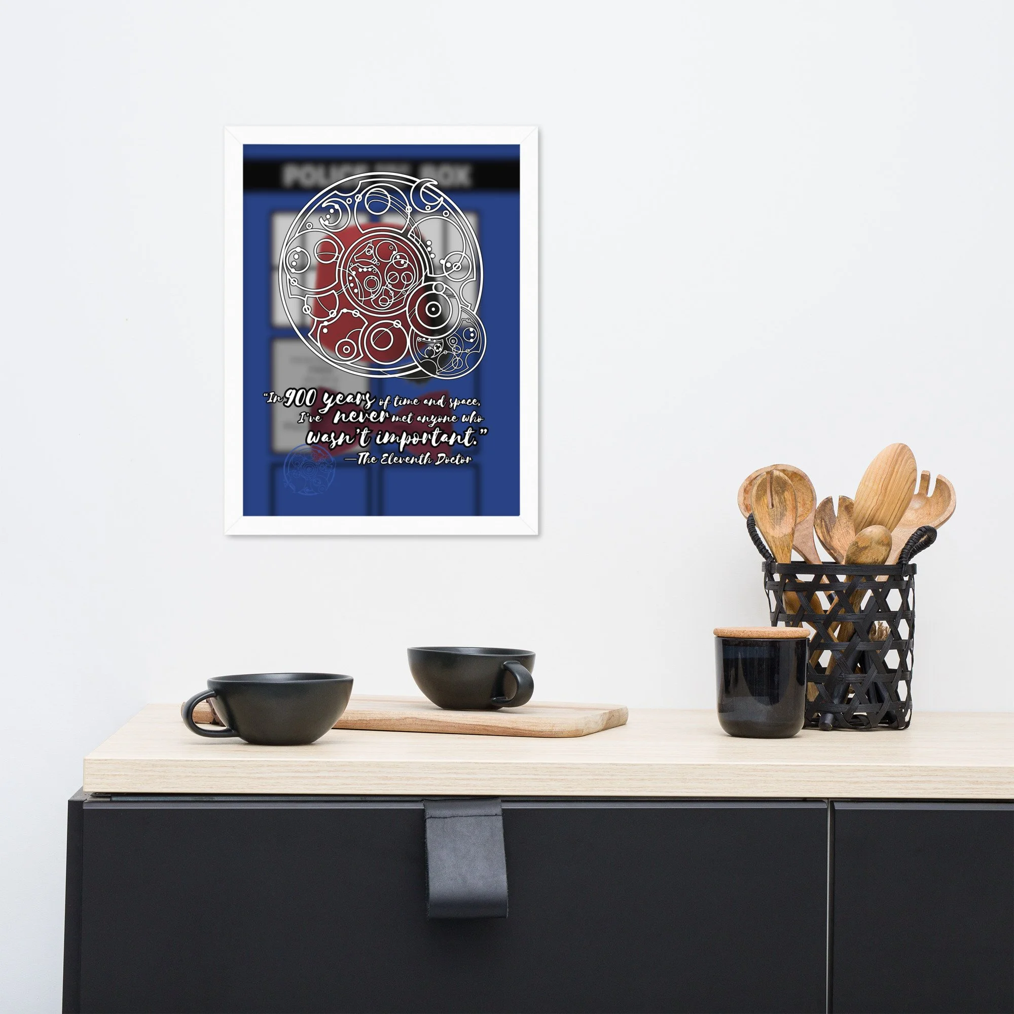 Bring the wisdom of the 11th Doctor into your home with this iconic quote from the special "A Christmas Carol," written in Circular Gallifreyan. "In 900 years of time and space, I've never met anyone who wasn't important." Printed on a background featuring the TARDIS, and the 11th Doctor's signature fez and bow tie.