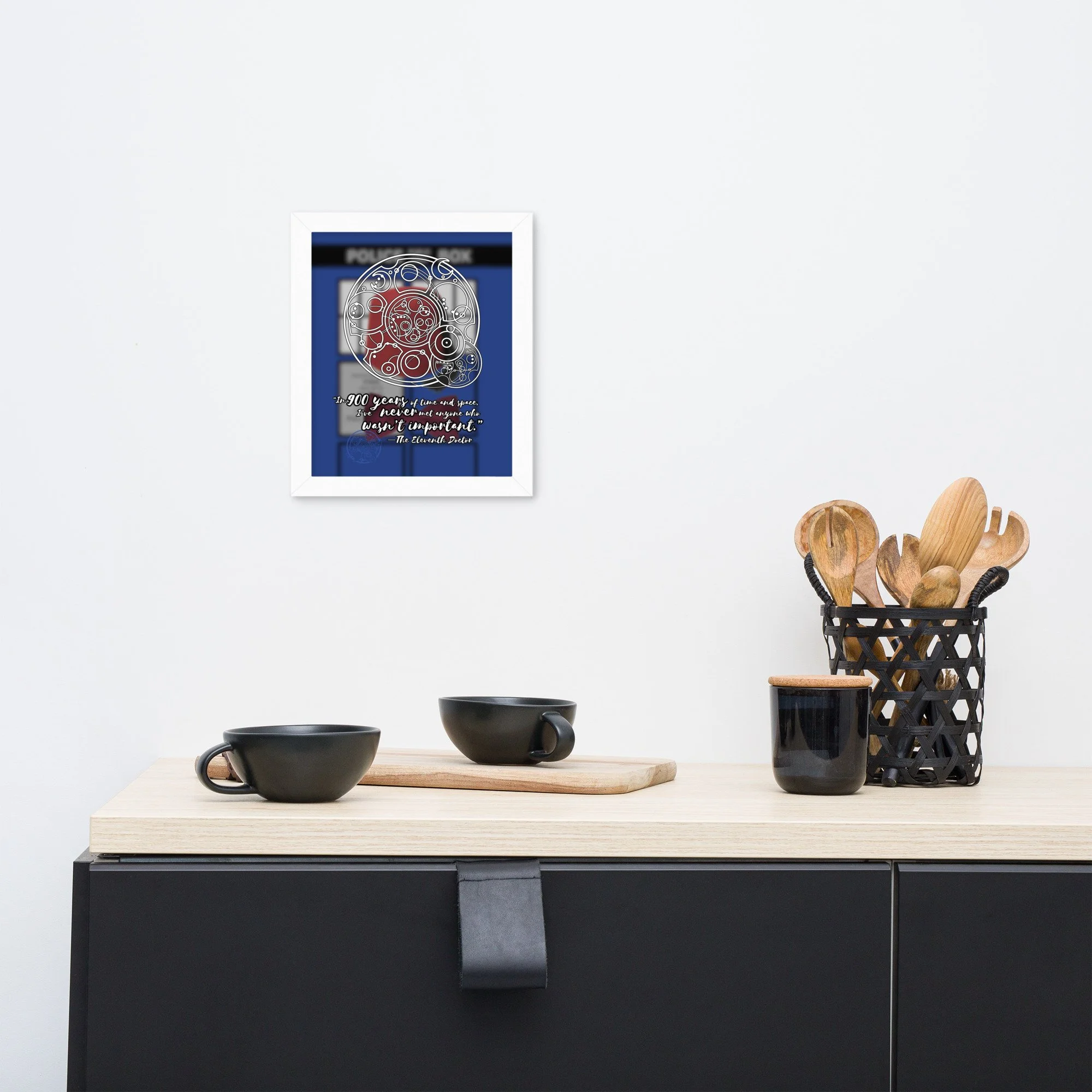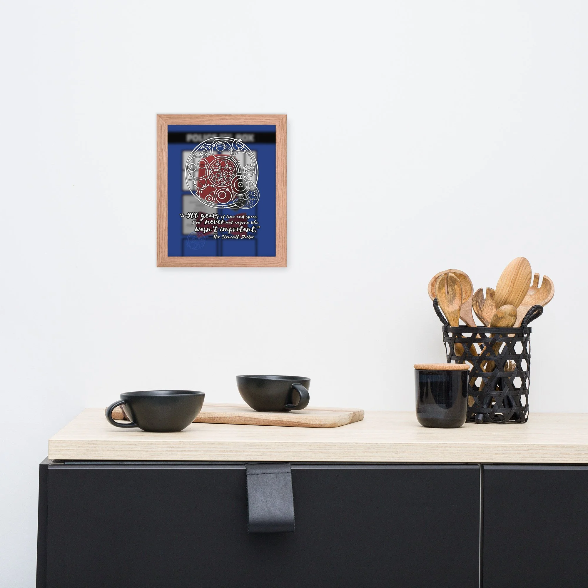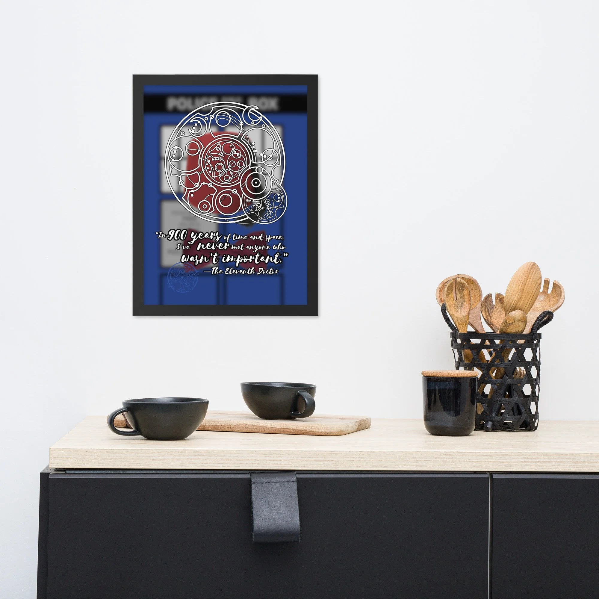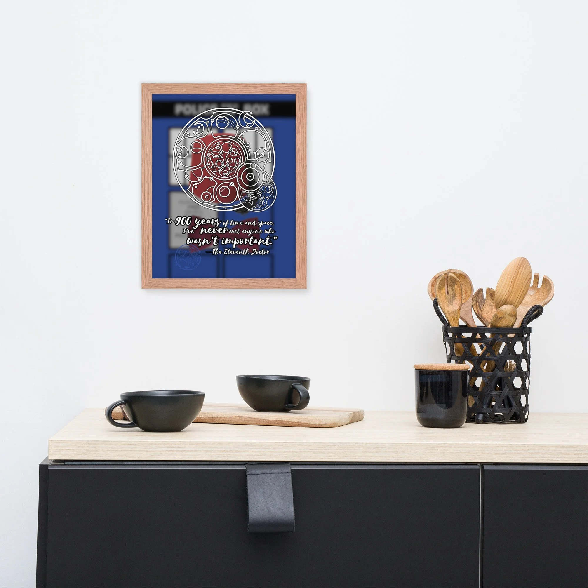 Bring the wisdom of the 11th Doctor into your home with this iconic quote from the special "A Christmas Carol," written in Circular Gallifreyan. "In 900 years of time and space, I've never met anyone who wasn't important." Printed on a background featuring the TARDIS, and the 11th Doctor's signature fez and bow tie.
