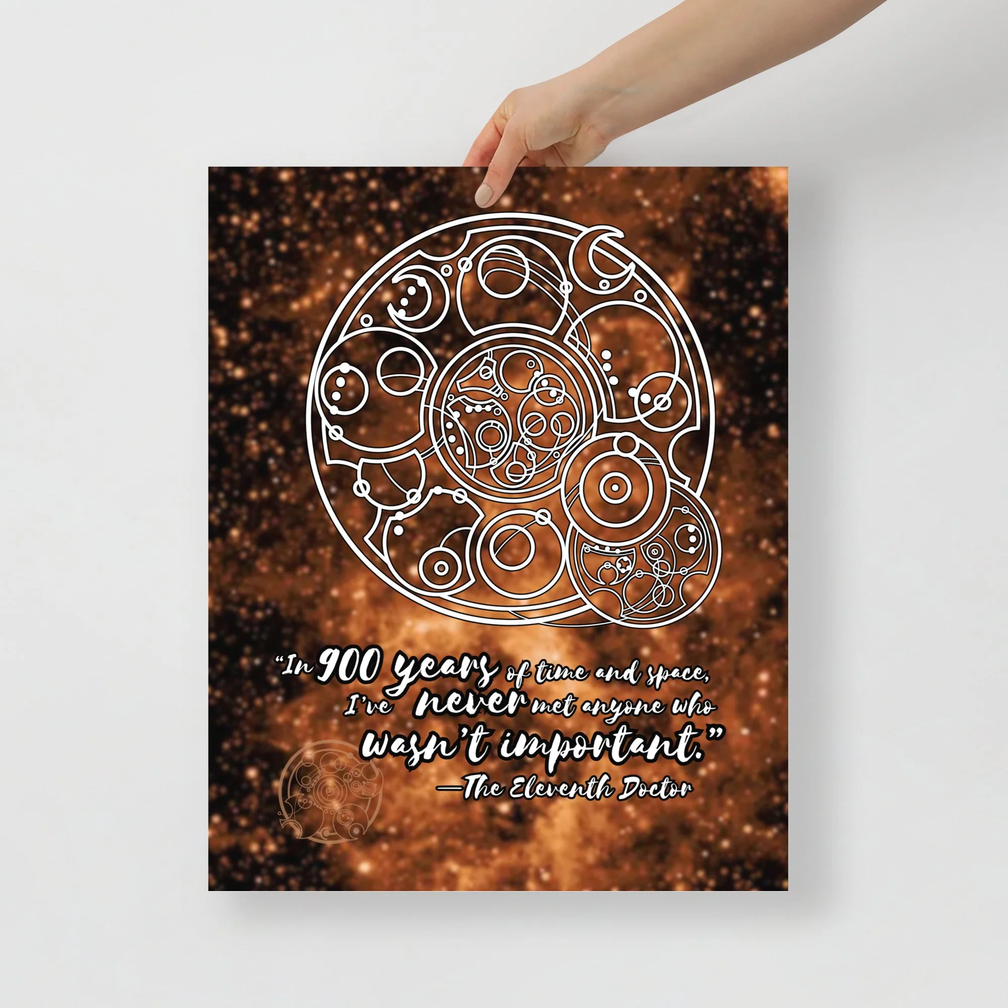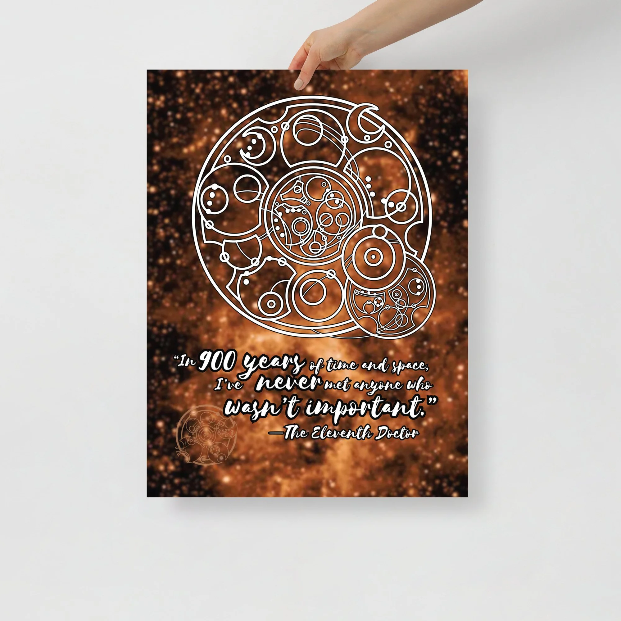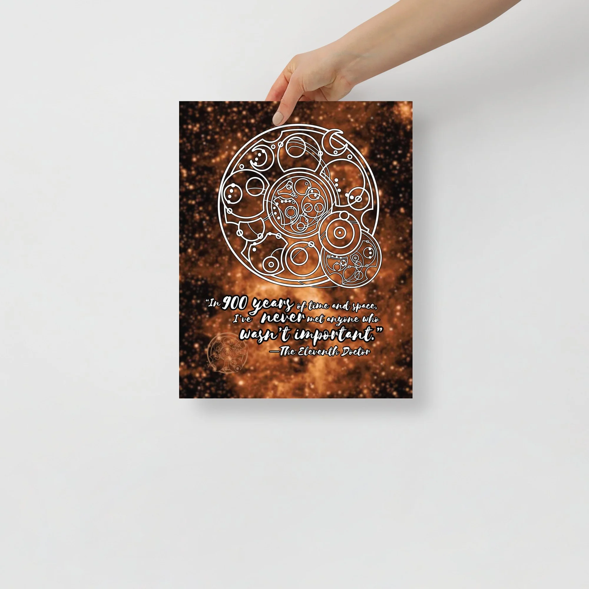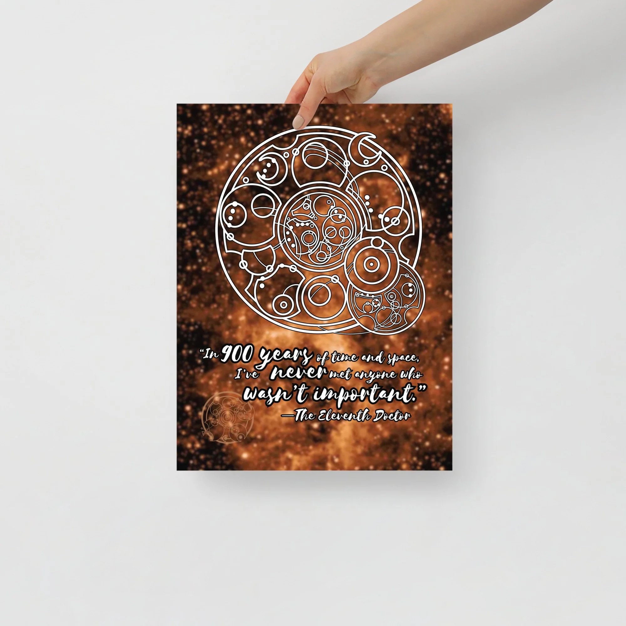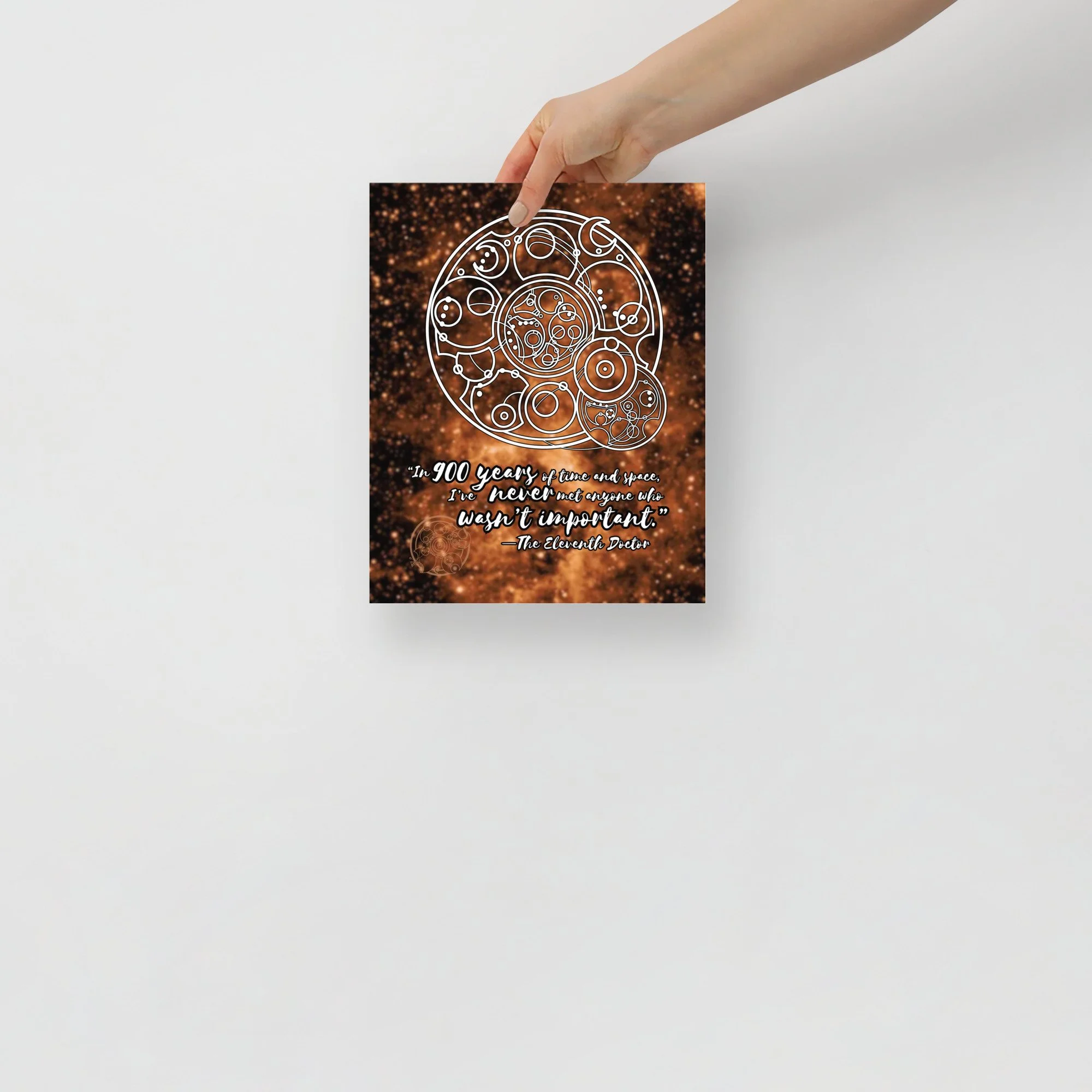 Doctor Who 11th Doctor Quote in Circular Gallifreyan Poster, outer space background Poster - "In 900 years of time and space, I've never met anyone who wasn't important."