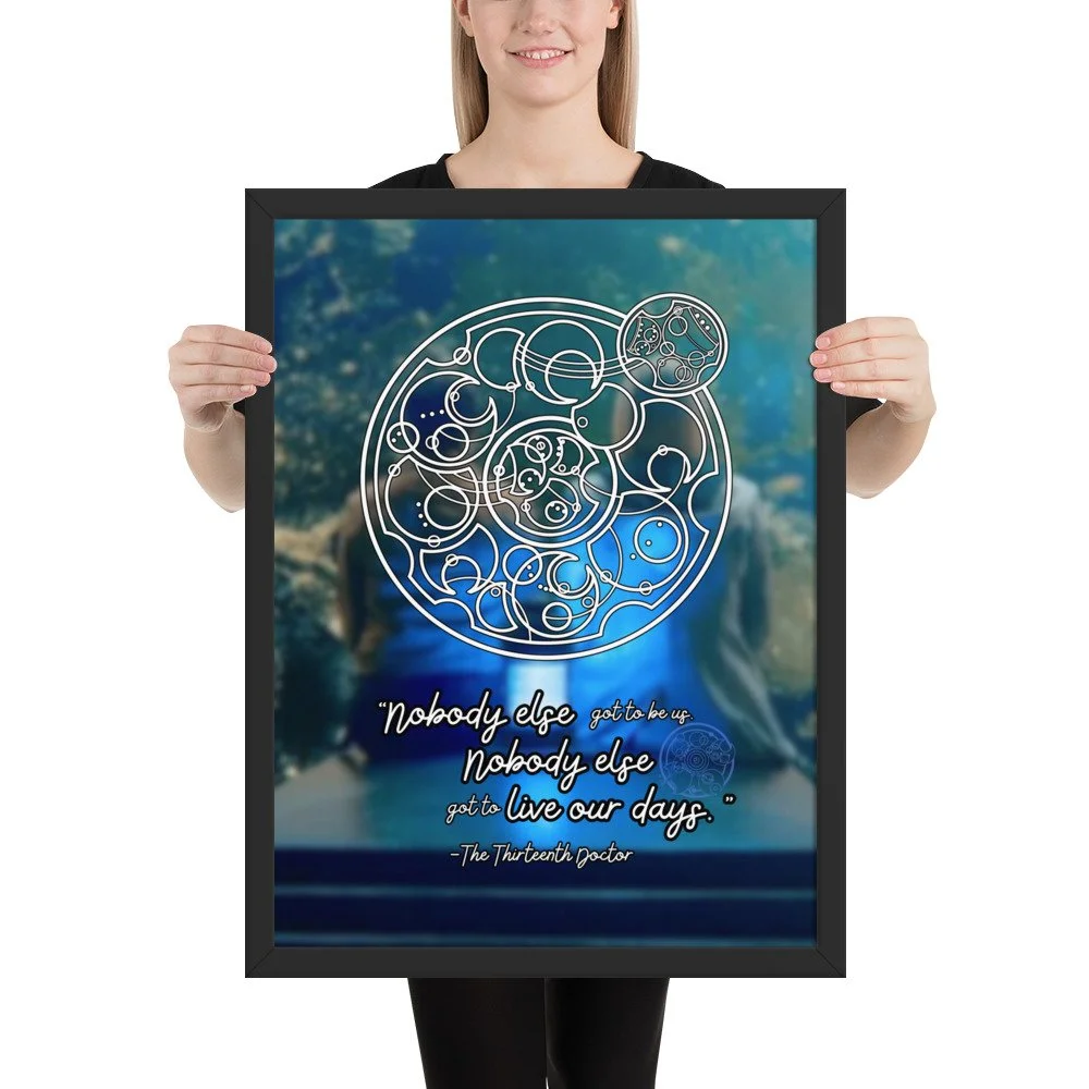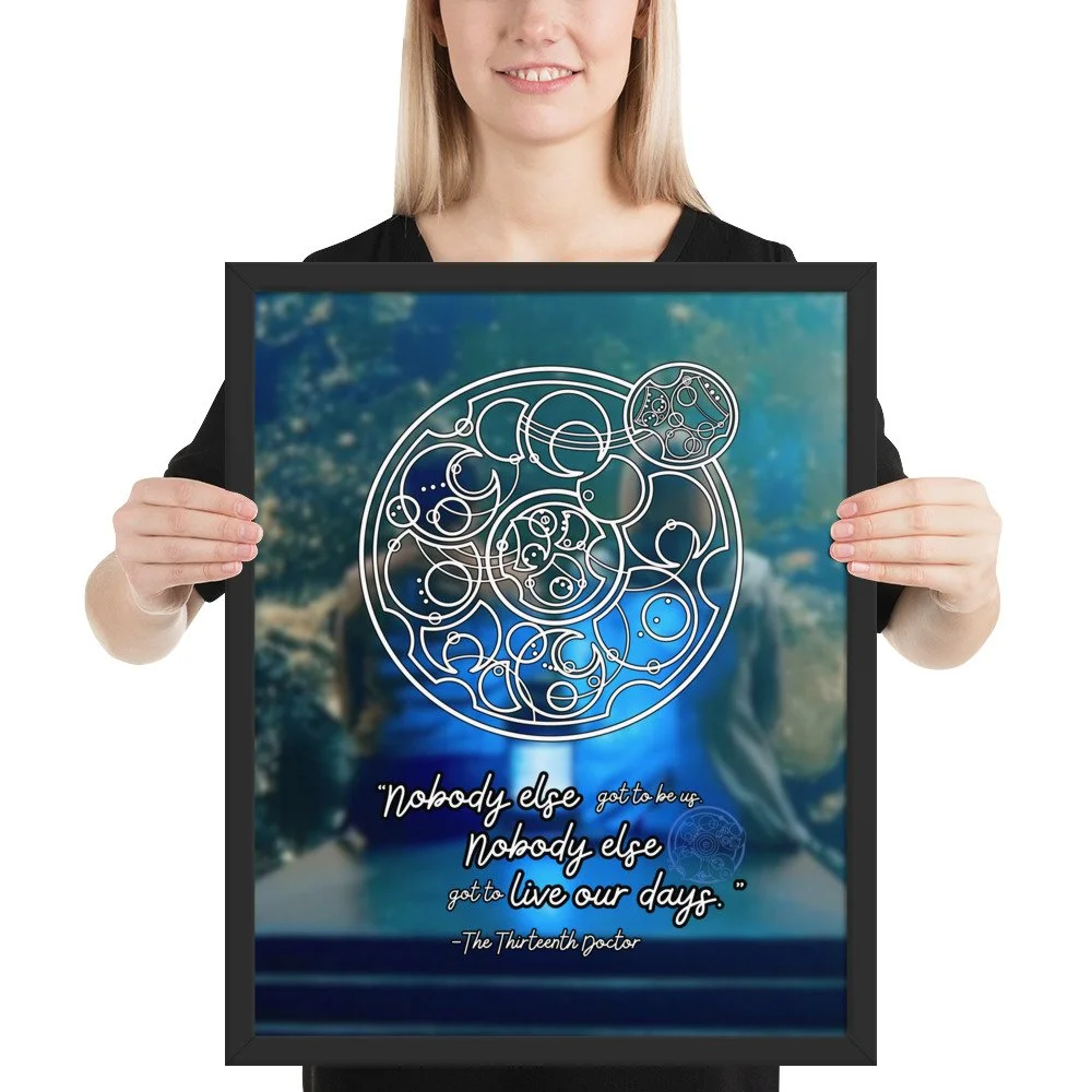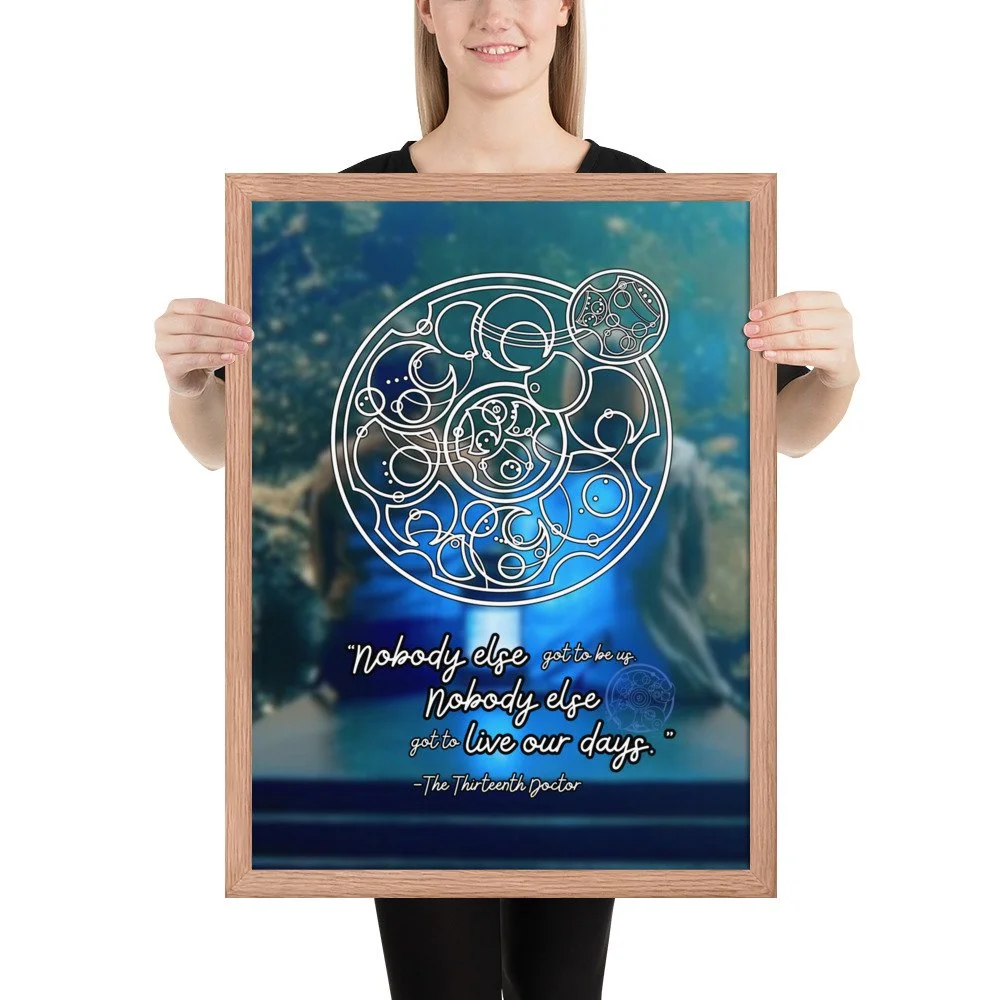 Doctor Who 13th Doctor Quote in Circular Gallifreyan Framed Poster - 13th Doctor and Yaz background - “Nobody else got to be us. Nobody else got to live our days.“