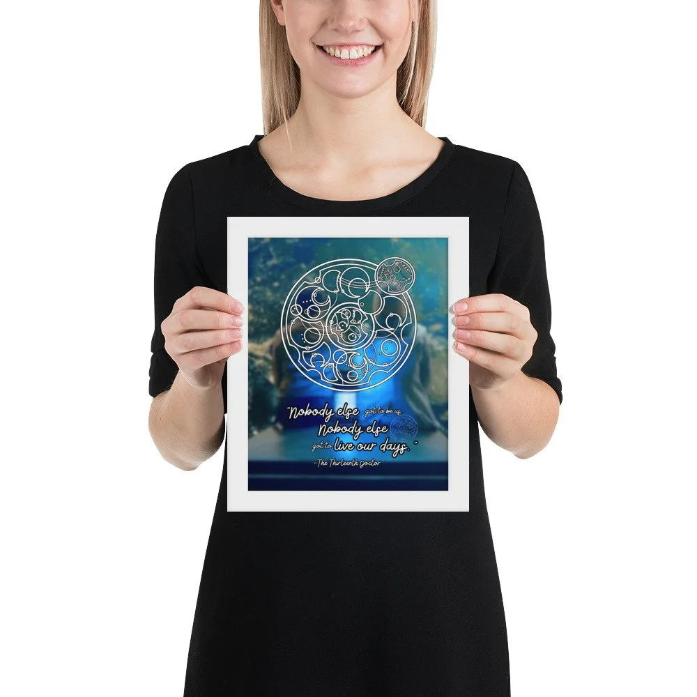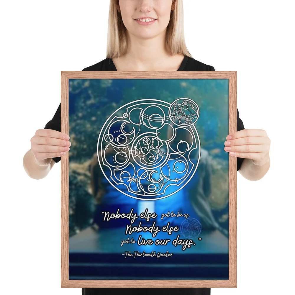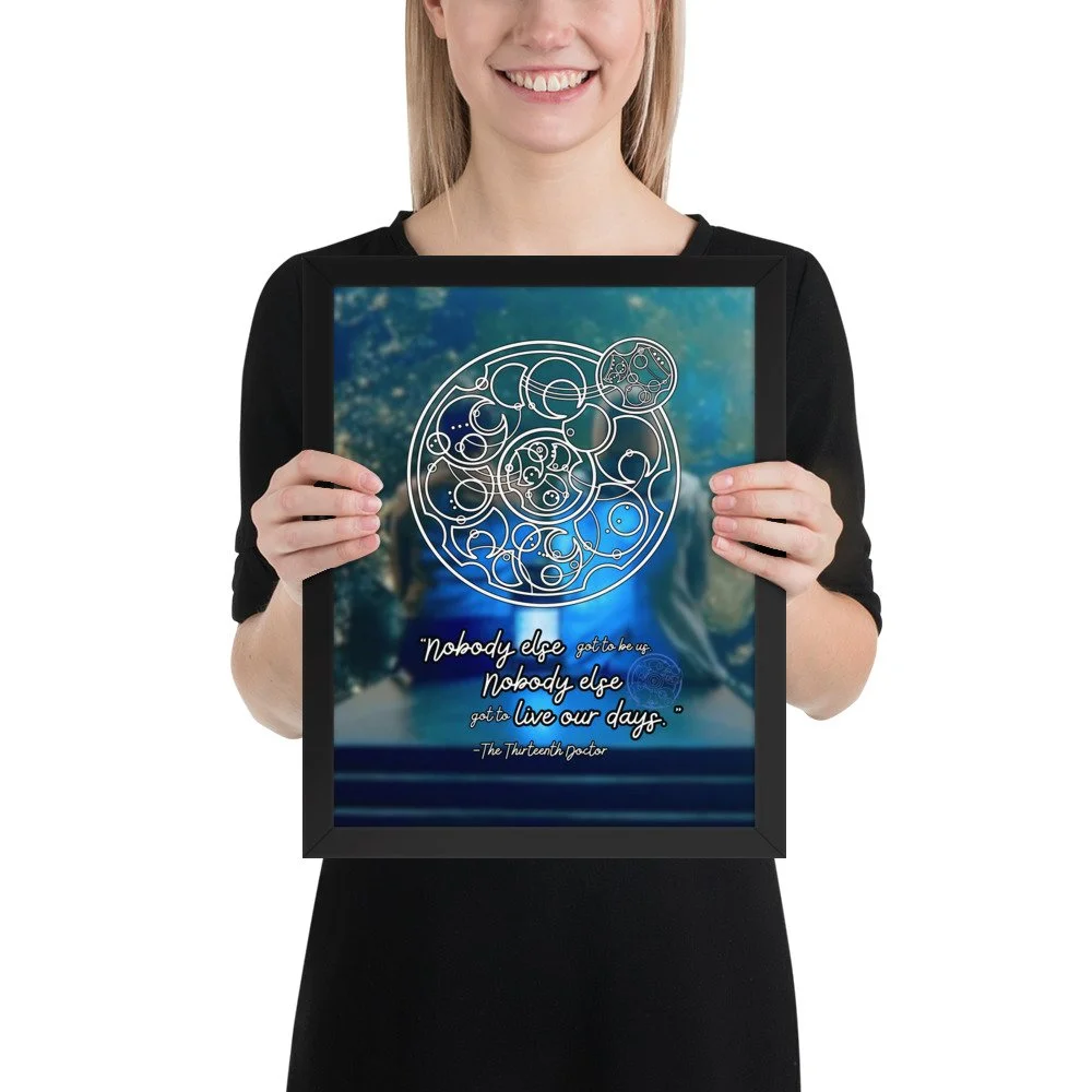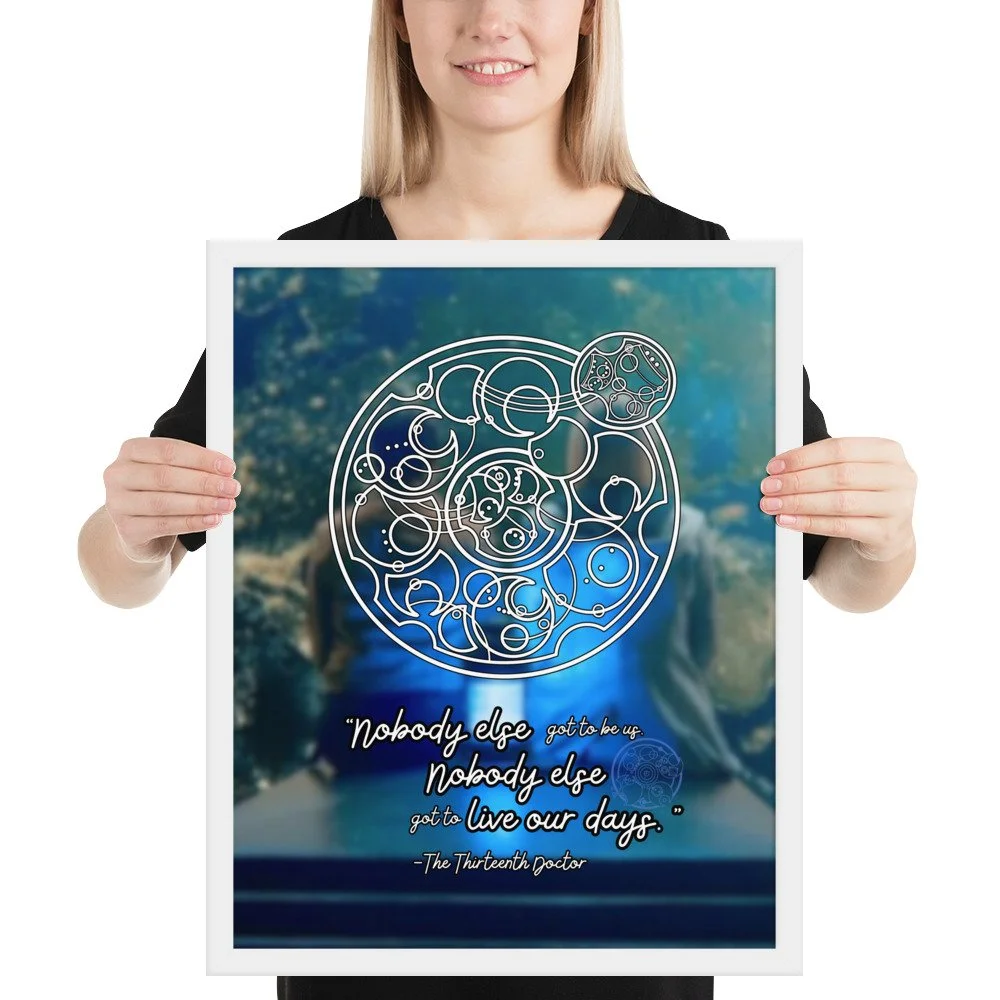 Doctor Who 13th Doctor Quote in Circular Gallifreyan Framed Poster - 13th Doctor and Yaz background - “Nobody else got to be us. Nobody else got to live our days.“