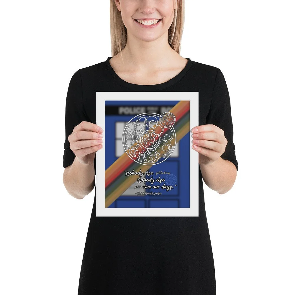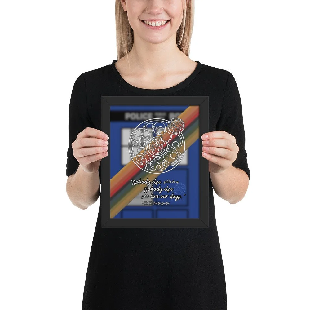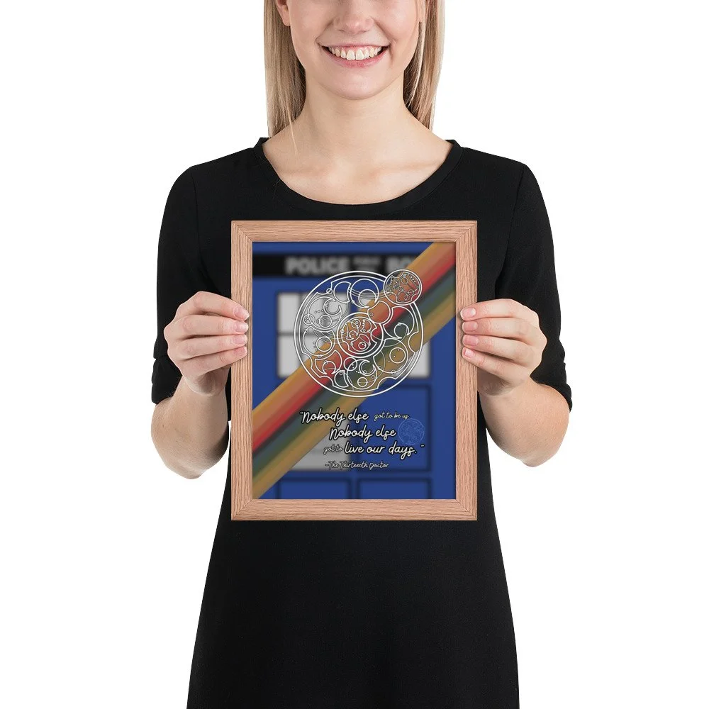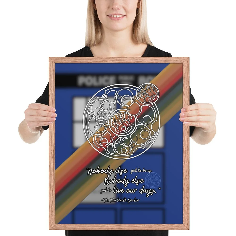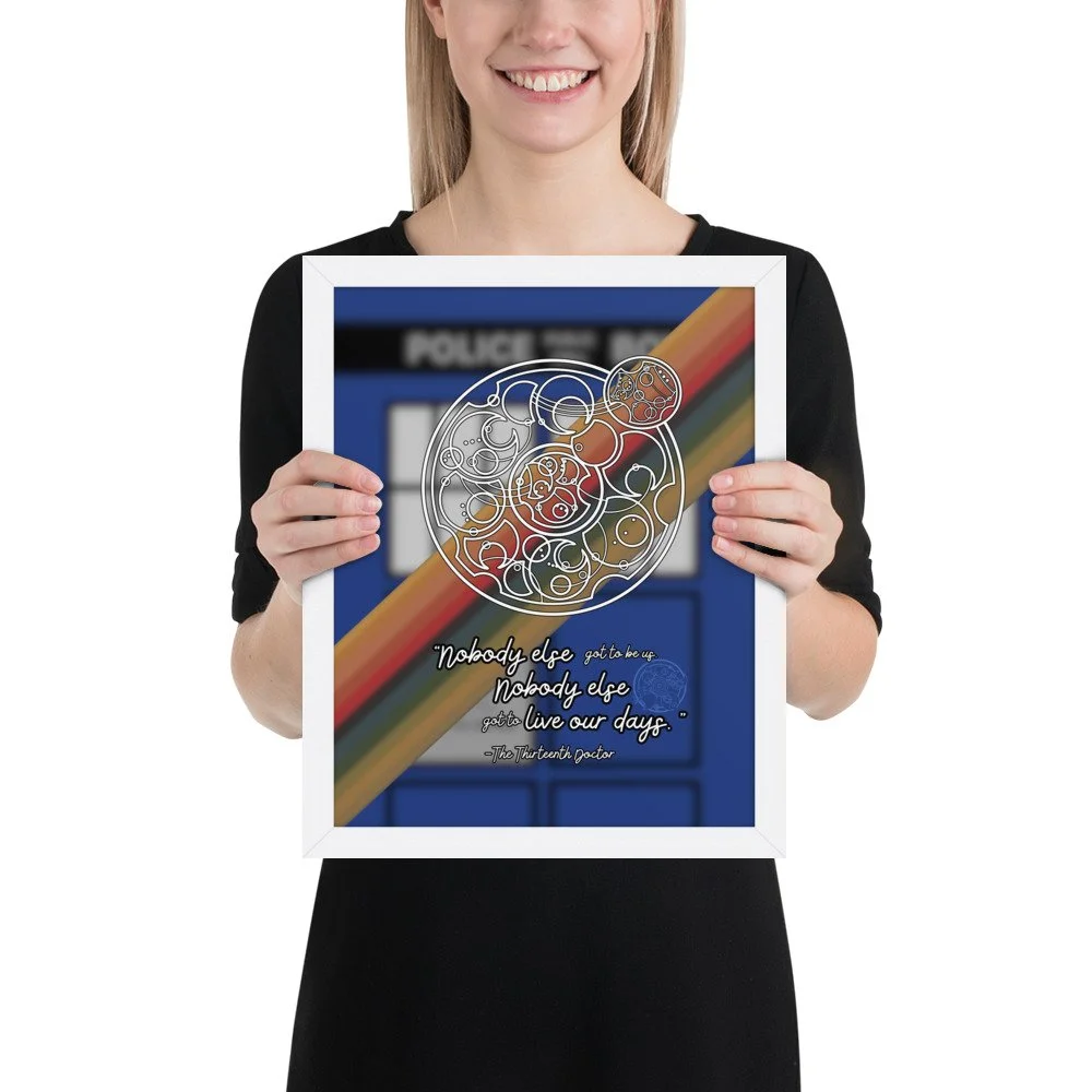 Doctor Who 13th Doctor Quote in Circular Gallifreyan Framed Poster - TARDIS and rainbow background - “Nobody else got to be us. Nobody else got to live our days.“