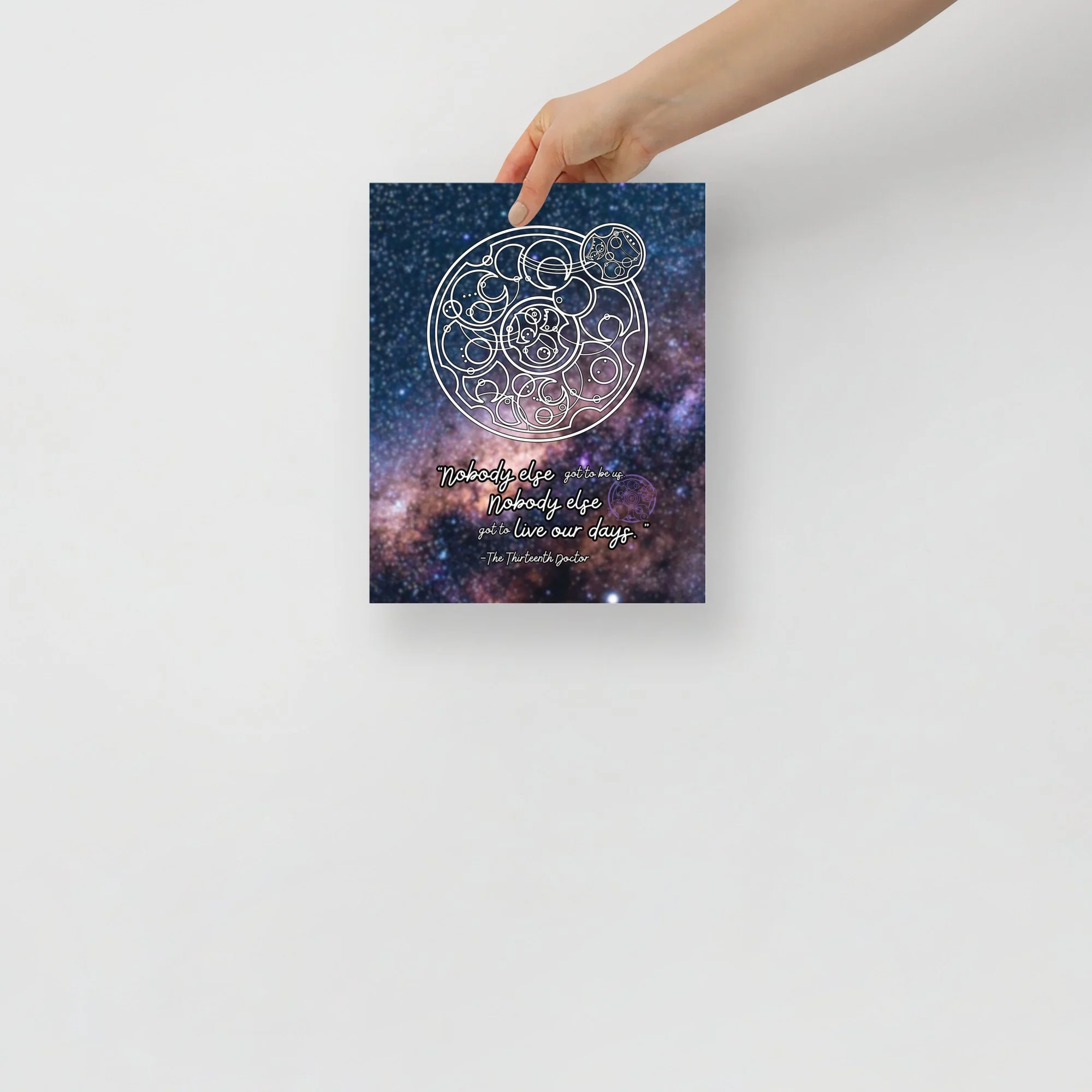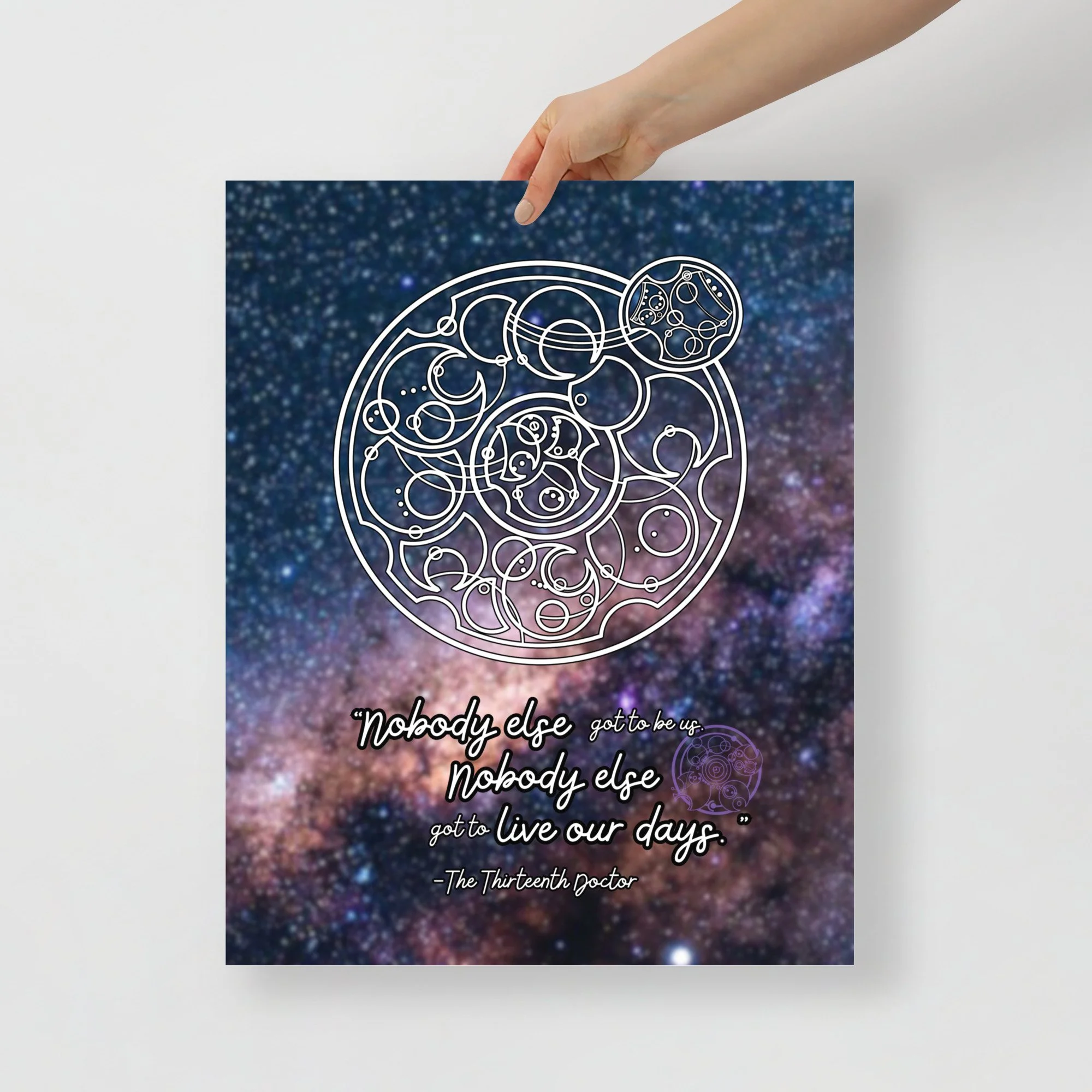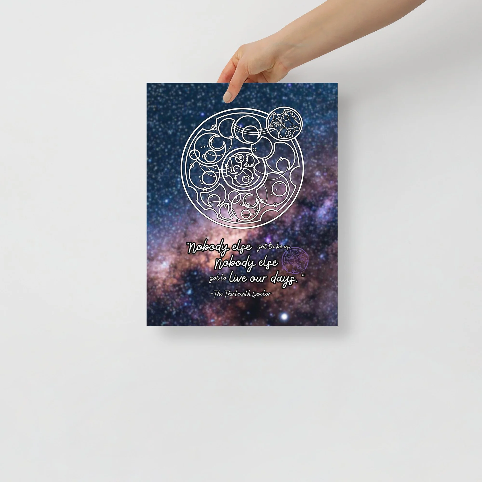Bring home the self-love of the 13th Doctor with some of her famous final lines to Yaz from “The Power of the Doctor.” This print features a starfield background. “Nobody else got to be us. Nobody else got to live our days.”