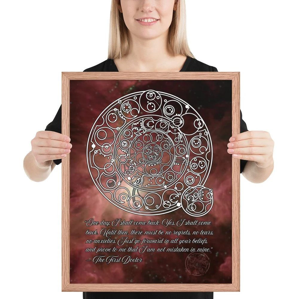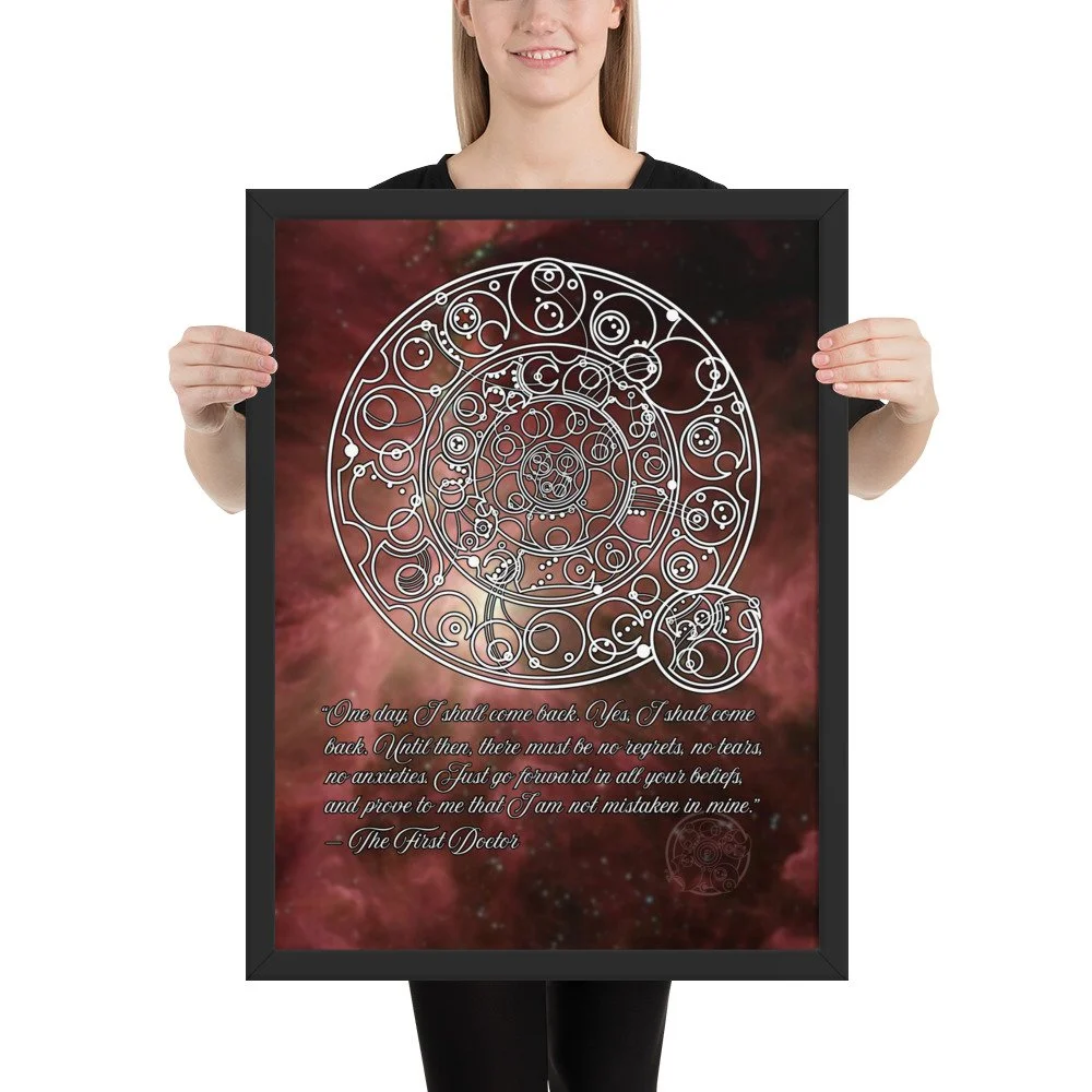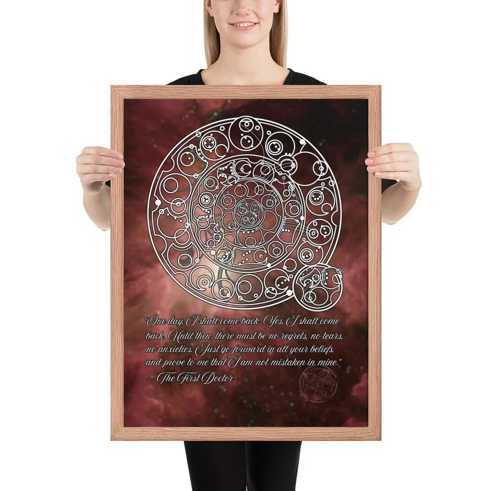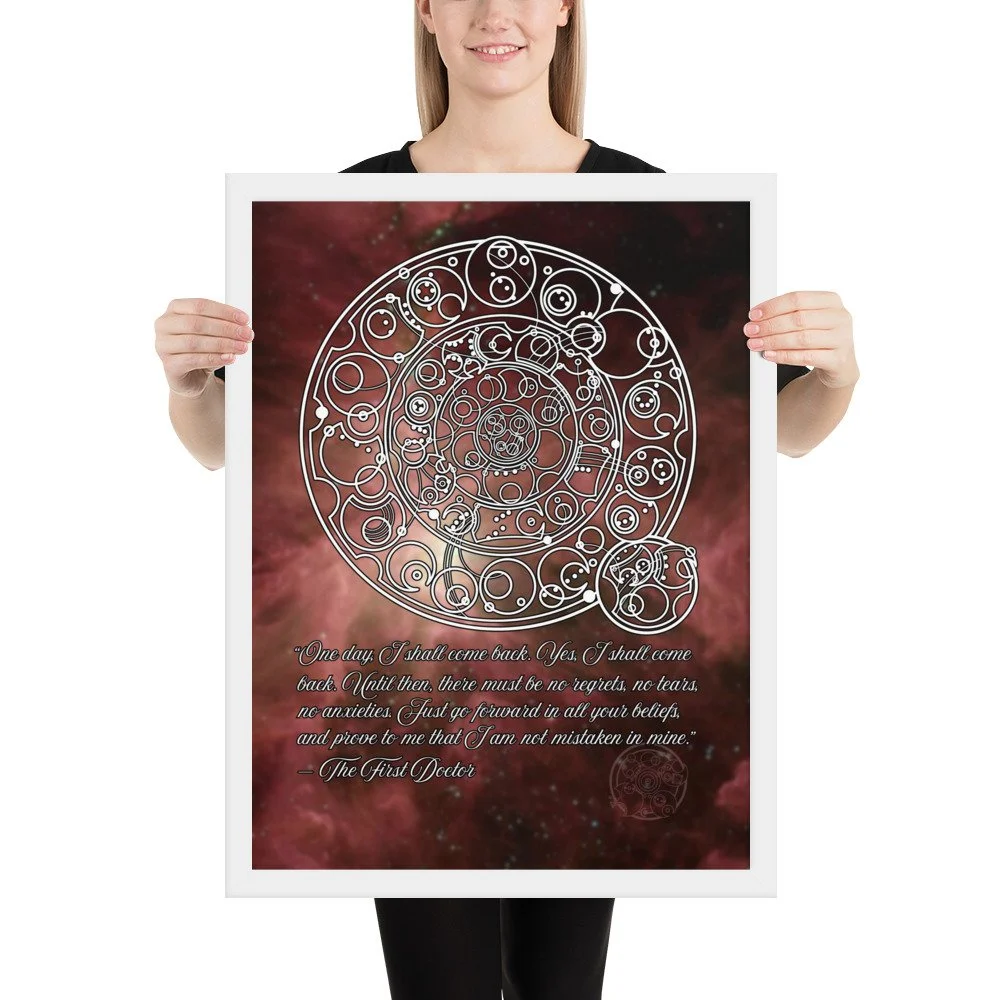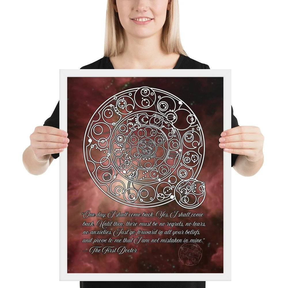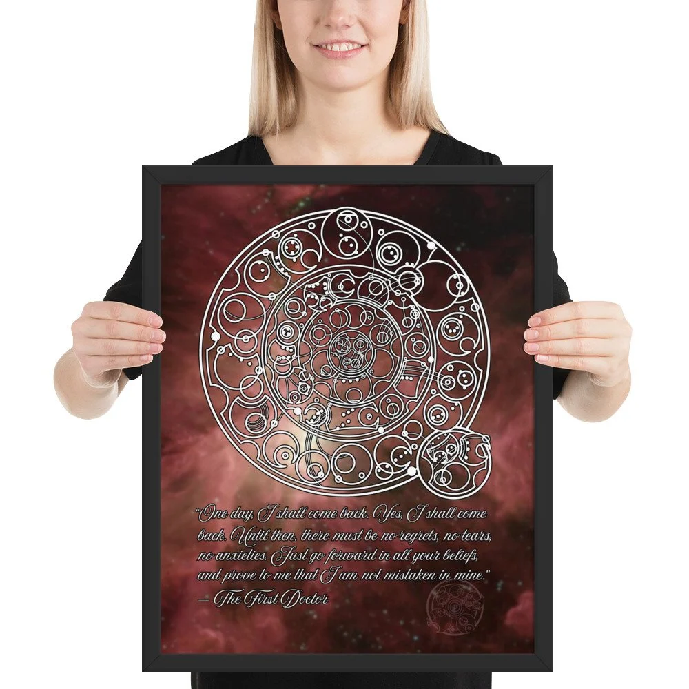 Bring home the sentiment of the 1st Doctor with his famous farewell monologue to his granddaughter Susan from "The Dalek Invasion of Earth," written in Circular Gallifreyan with a starfield background. "One day, I shall come back. Yes, I shall come back. Until then, there must be no regrets, no tears, no anxieties. Just go forward in all your beliefs, and prove to me that I am not mistaken in mine.”