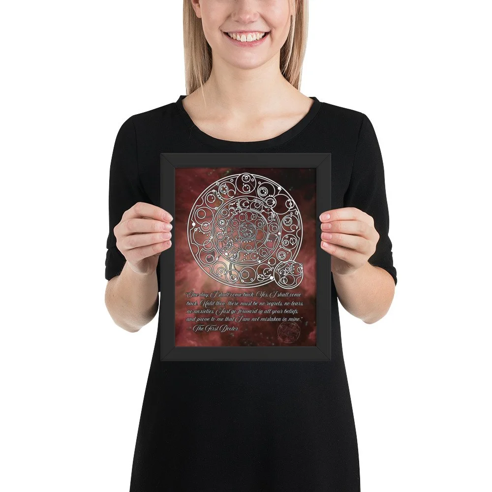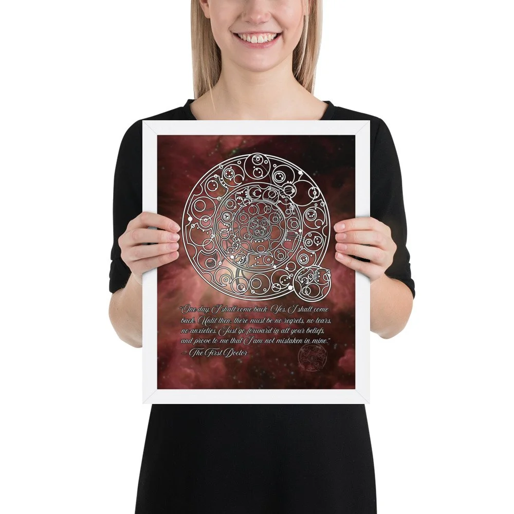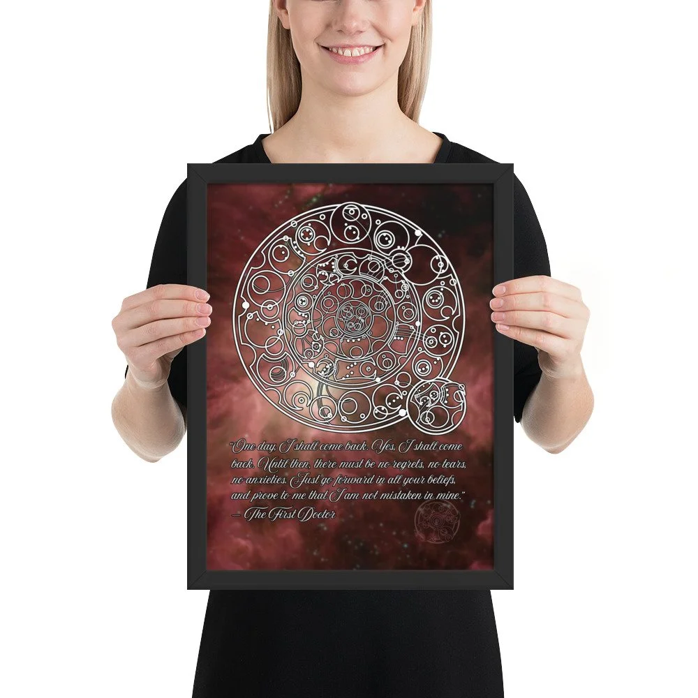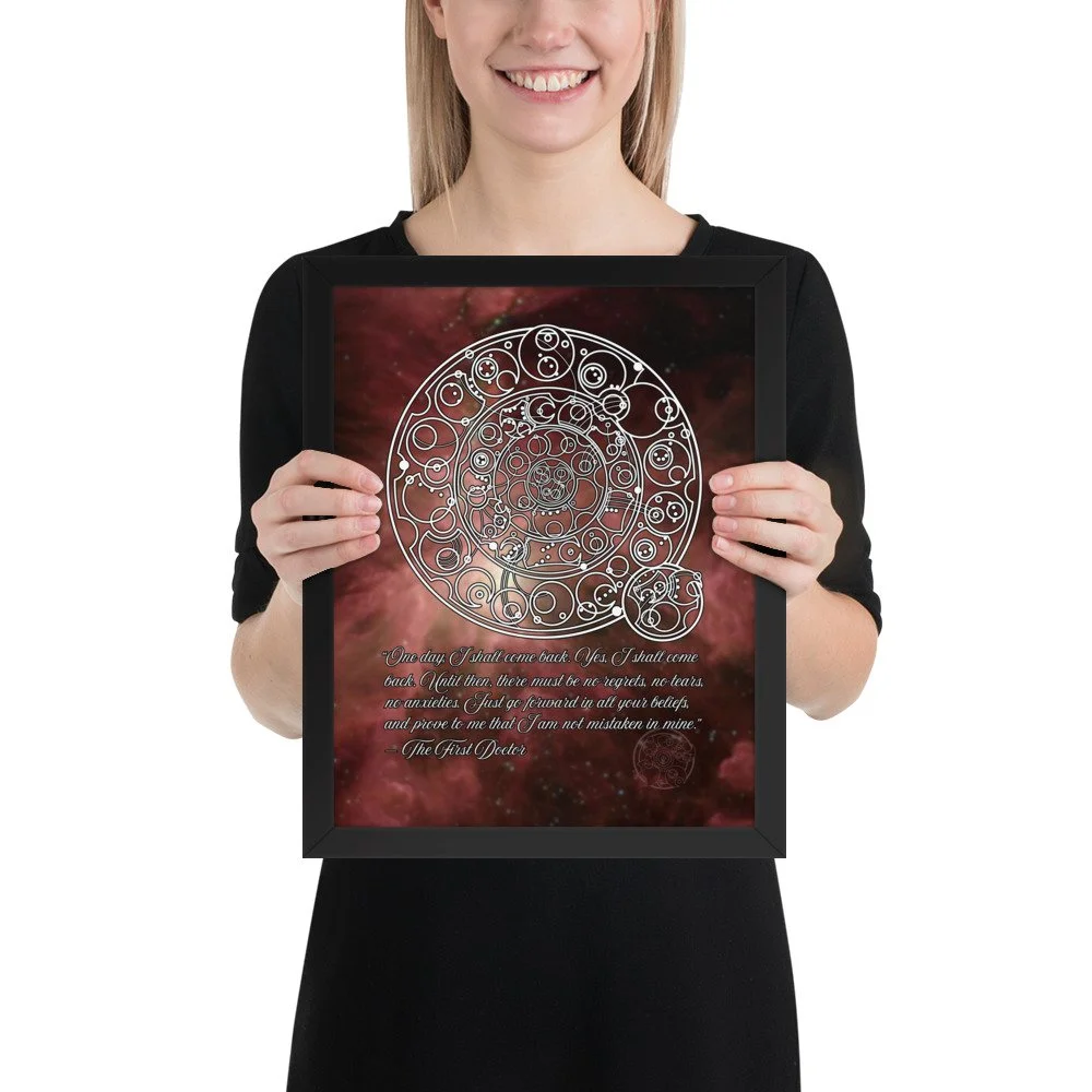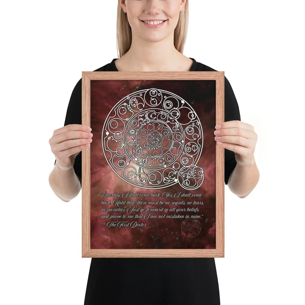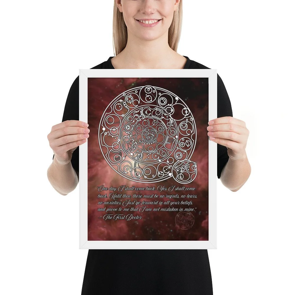 Bring home the sentiment of the 1st Doctor with his famous farewell monologue to his granddaughter Susan from "The Dalek Invasion of Earth," written in Circular Gallifreyan with a starfield background. "One day, I shall come back. Yes, I shall come back. Until then, there must be no regrets, no tears, no anxieties. Just go forward in all your beliefs, and prove to me that I am not mistaken in mine.”
