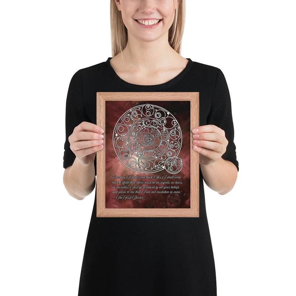 Doctor Who 1st Doctor William Hartnell Quote in Circular Gallifreyan, outer space background Framed Poster - "One day, I shall come back…"