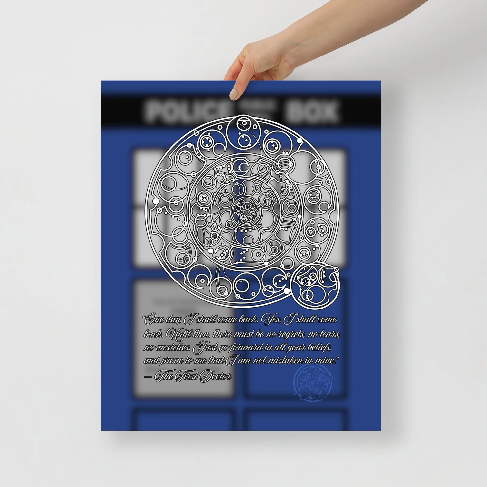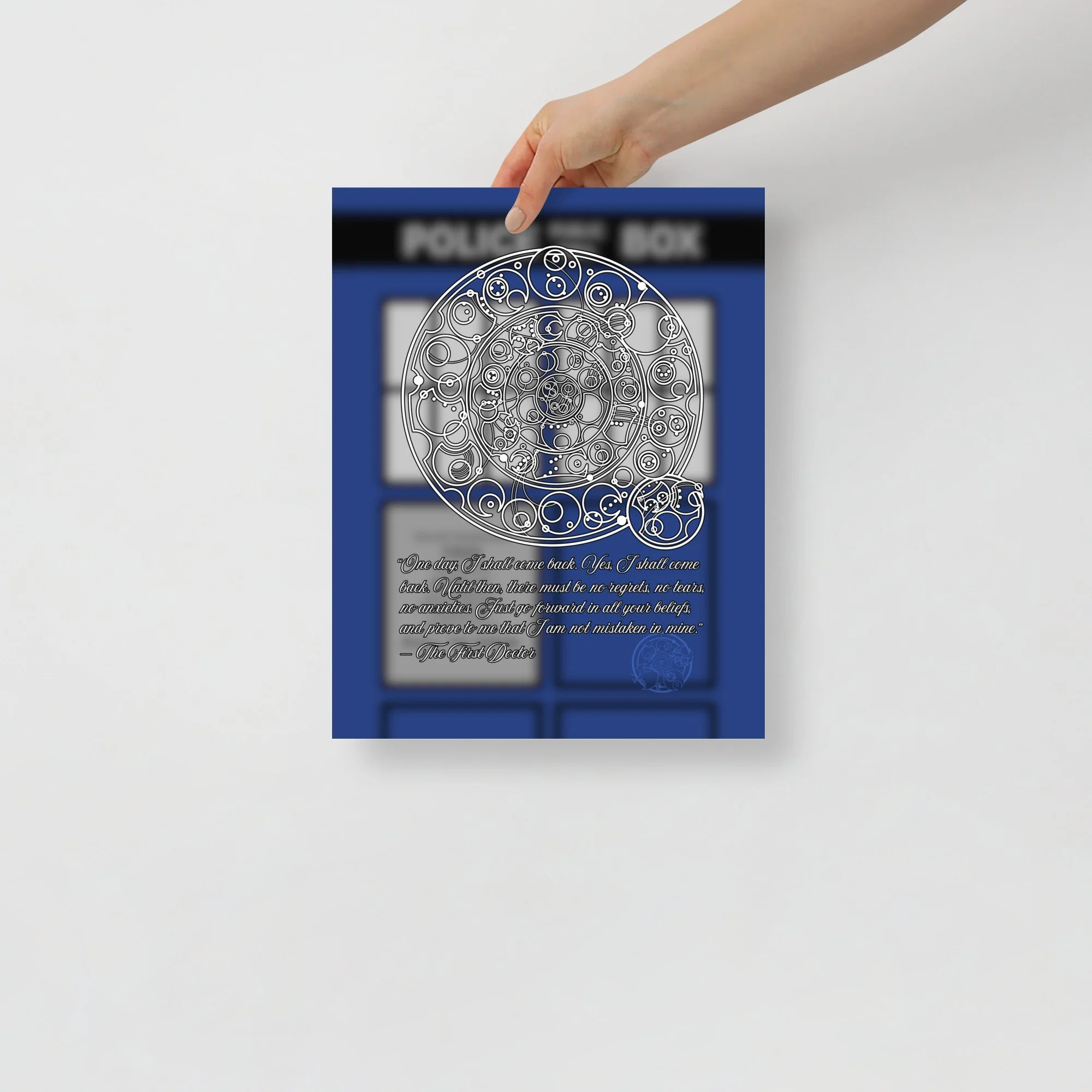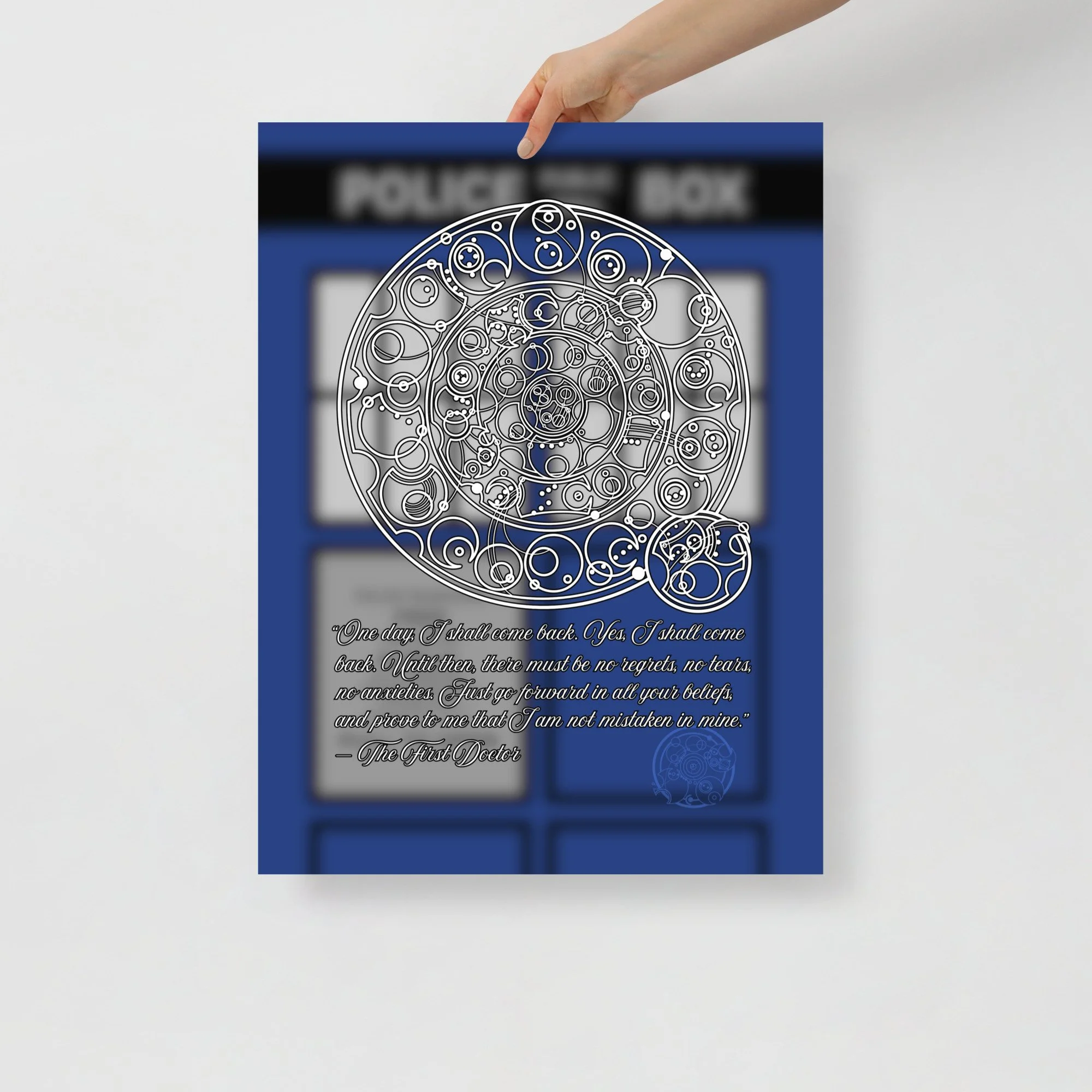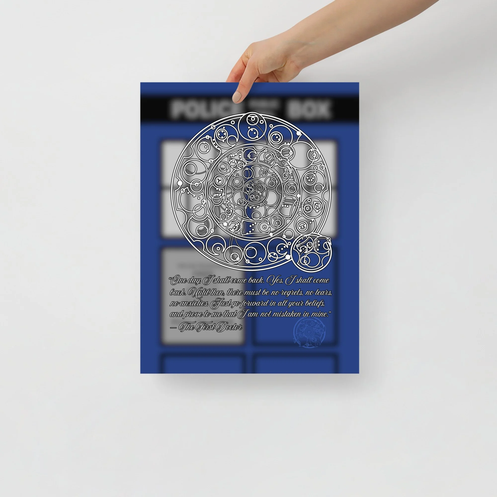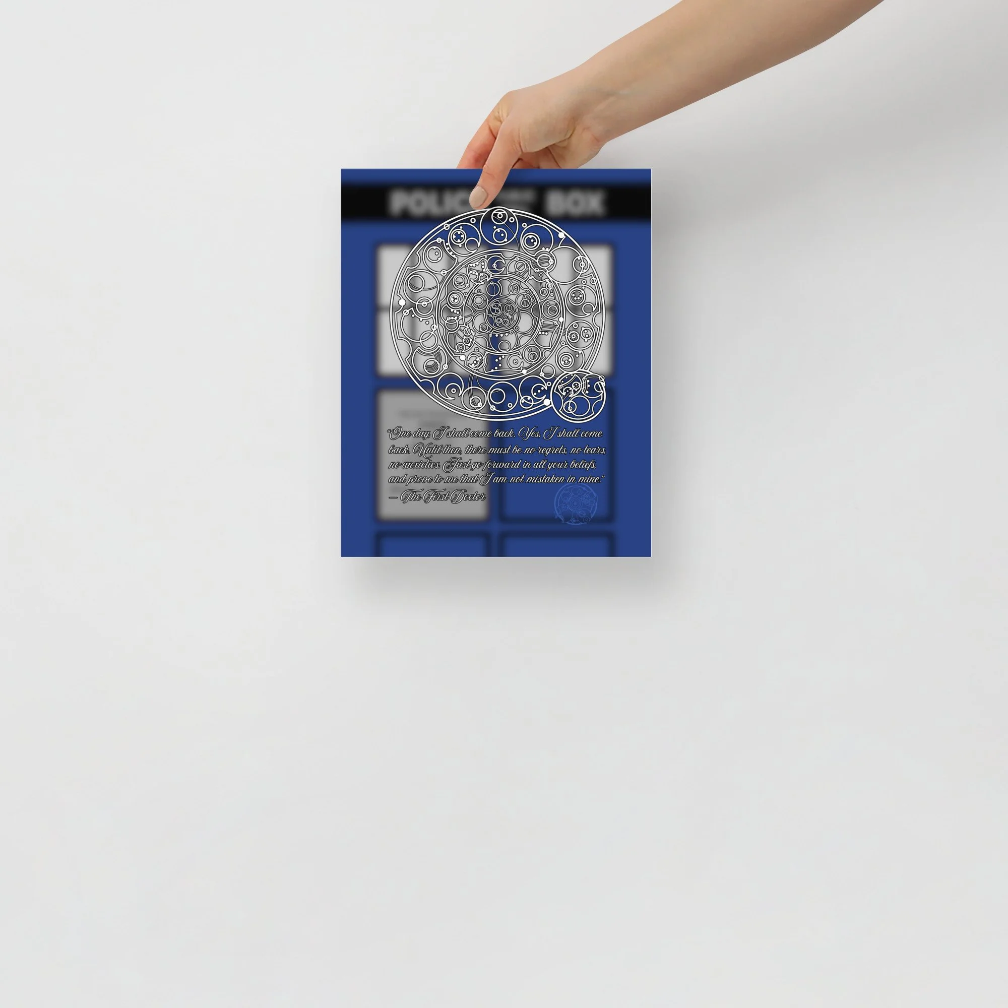 Bring home the sentiment of the 1st Doctor with his famous farewell monologue to his granddaughter Susan from "The Dalek Invasion of Earth," written in Circular Gallifreyan with a TARDIS background. "One day, I shall come back. Yes, I shall come back. Until then, there must be no regrets, no tears, no anxieties. Just go forward in all your beliefs, and prove to me that I am not mistaken in mine.”