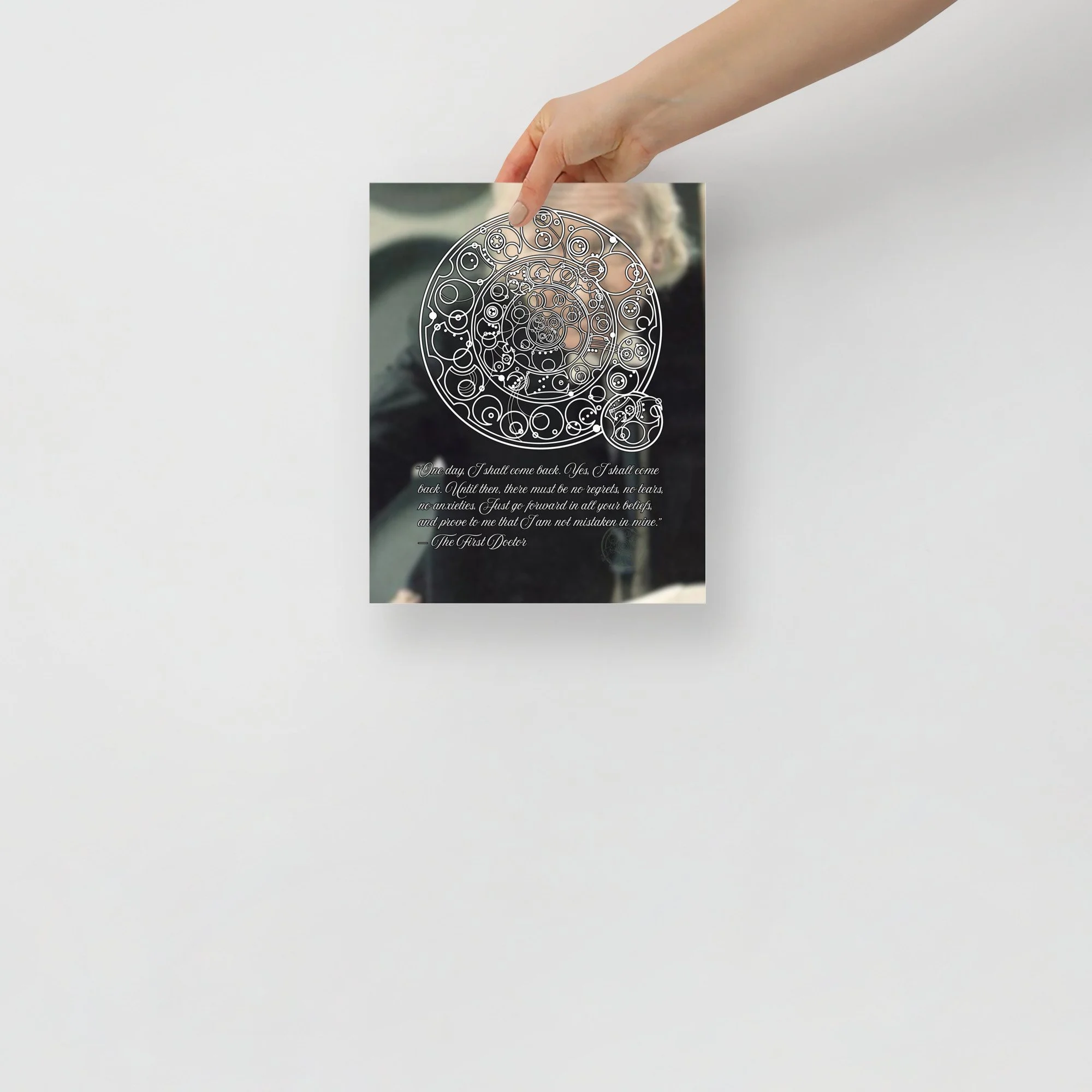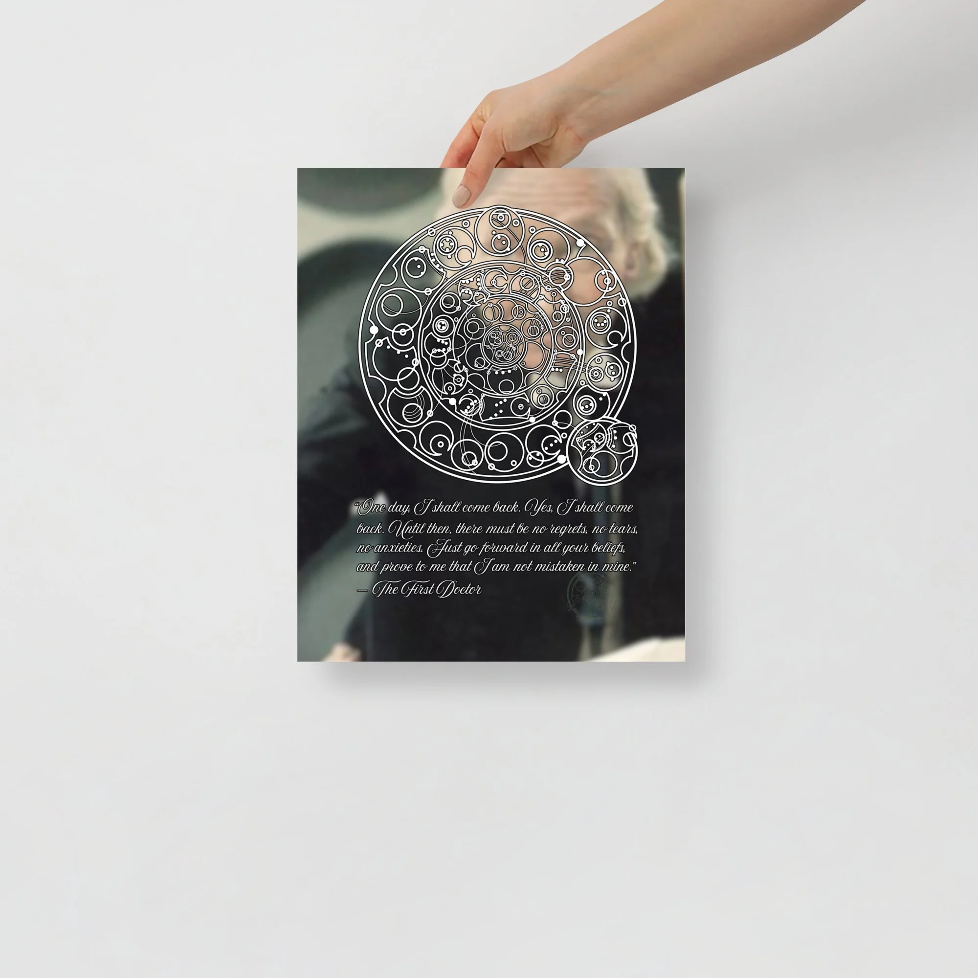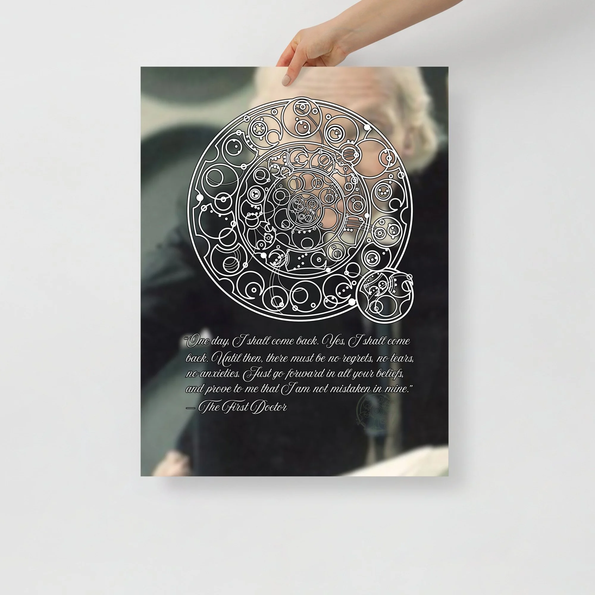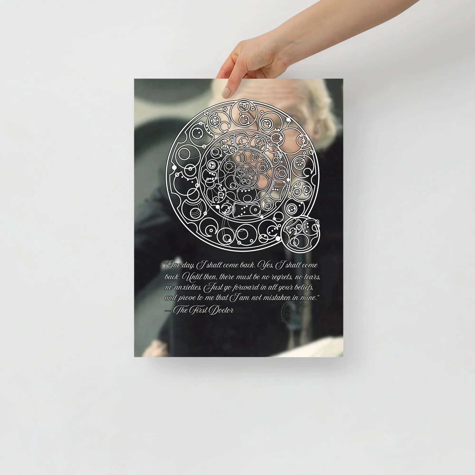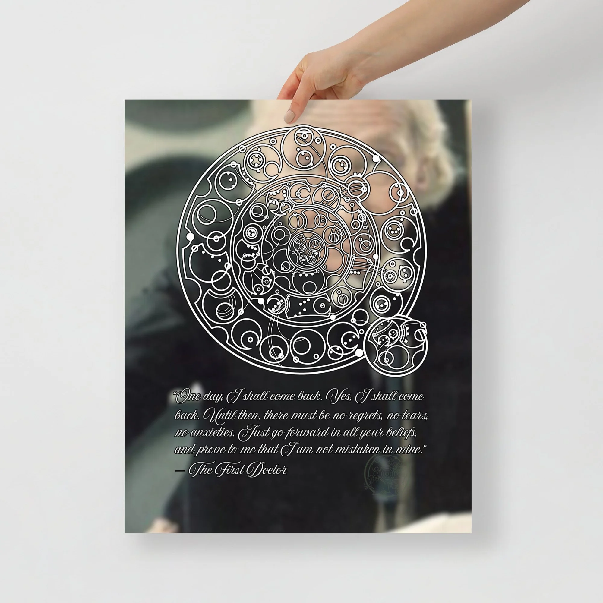 Bring home the sentiment of the 1st Doctor with his famous farewell monologue to his granddaughter Susan from "The Dalek Invasion of Earth," written in Circular Gallifreyan with a background featuring William Hartnell standing at the TARDIS console. "One day, I shall come back. Yes, I shall come back. Until then, there must be no regrets, no tears, no anxieties. Just go forward in all your beliefs, and prove to me that I am not mistaken in mine.”