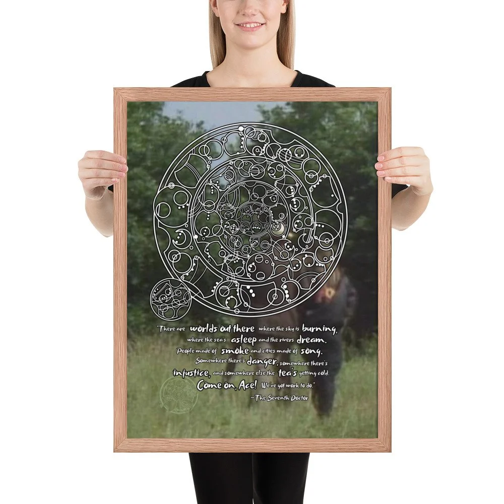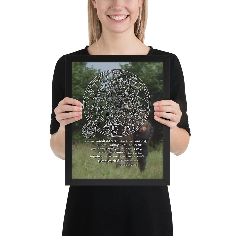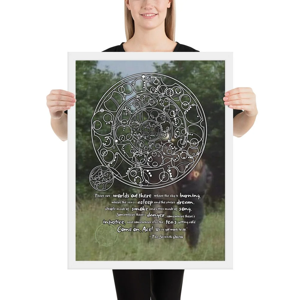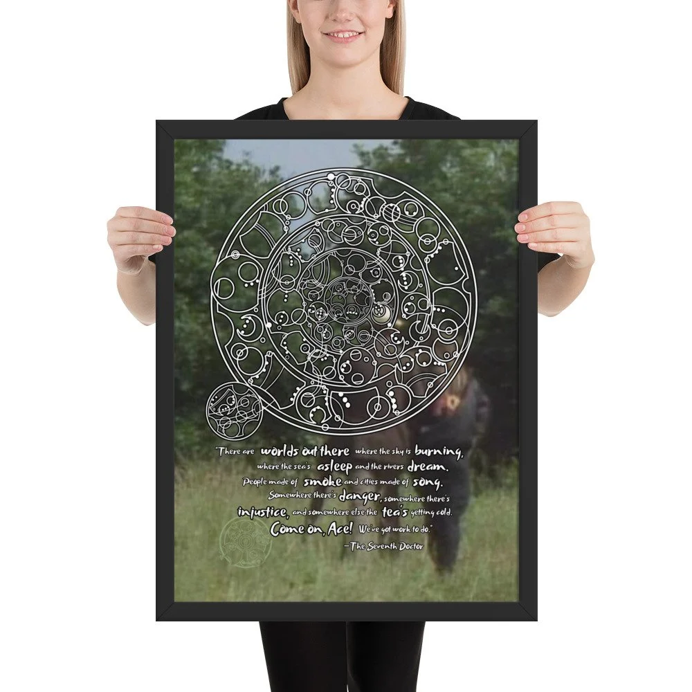 Bring home the 7th Doctor's spirit of adventure with his famous monologue from "Survival" - the final words spoken in the classic era of Doctor Who. This print features Sylvester McCoy and Sophie Aldred walking into the background. "There are worlds out there where the sky is burning, where the sea's asleep, and the rivers dream. People made of smoke and cities made of song. Somewhere there's danger, somewhere there's injustice, and somewhere else the tea's getting cold. Come on, Ace! We've got work to do."