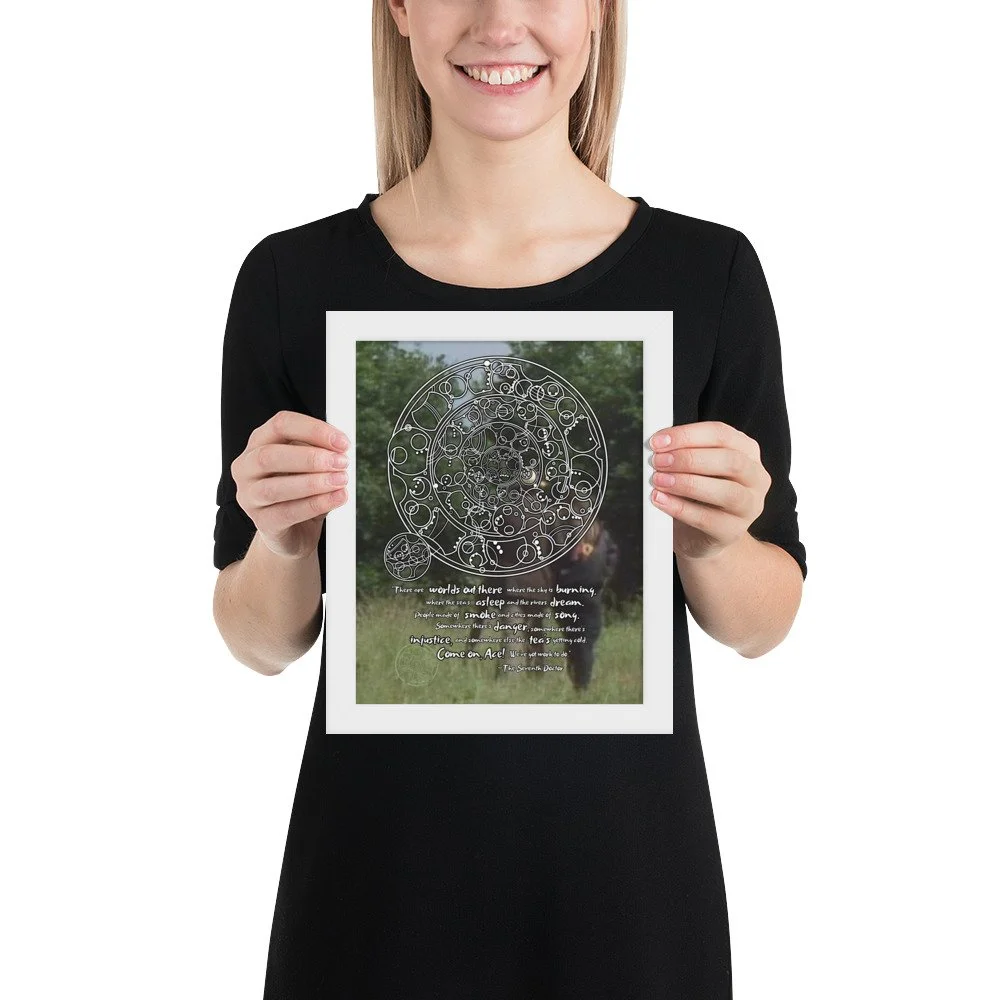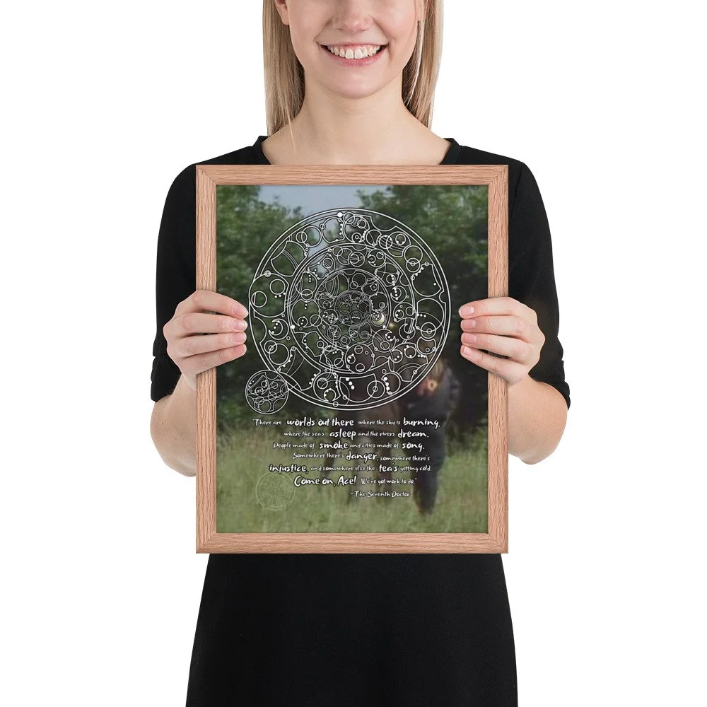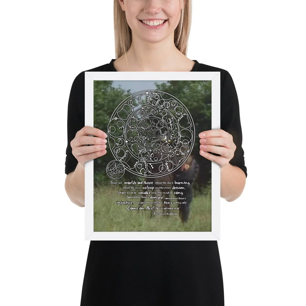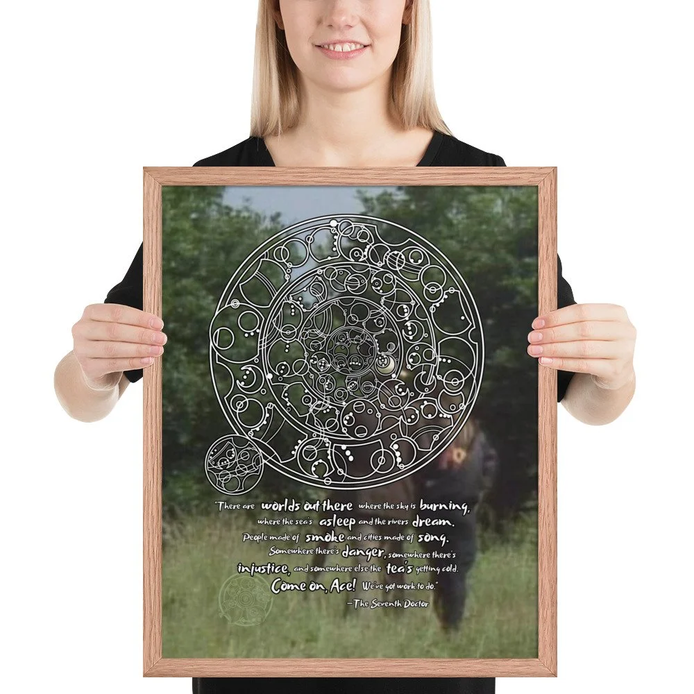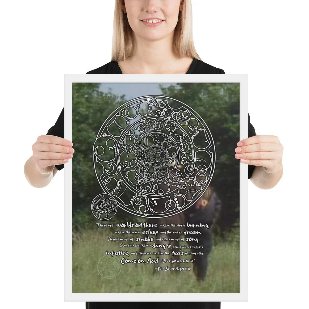 Bring home the 7th Doctor's spirit of adventure with his famous monologue from "Survival" - the final words spoken in the classic era of Doctor Who. This print features Sylvester McCoy and Sophie Aldred walking into the background. "There are worlds out there where the sky is burning, where the sea's asleep, and the rivers dream. People made of smoke and cities made of song. Somewhere there's danger, somewhere there's injustice, and somewhere else the tea's getting cold. Come on, Ace! We've got work to do."