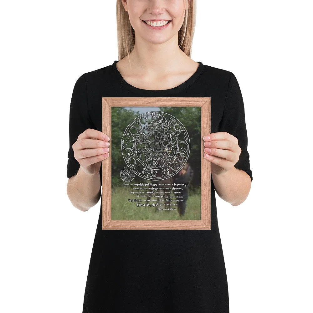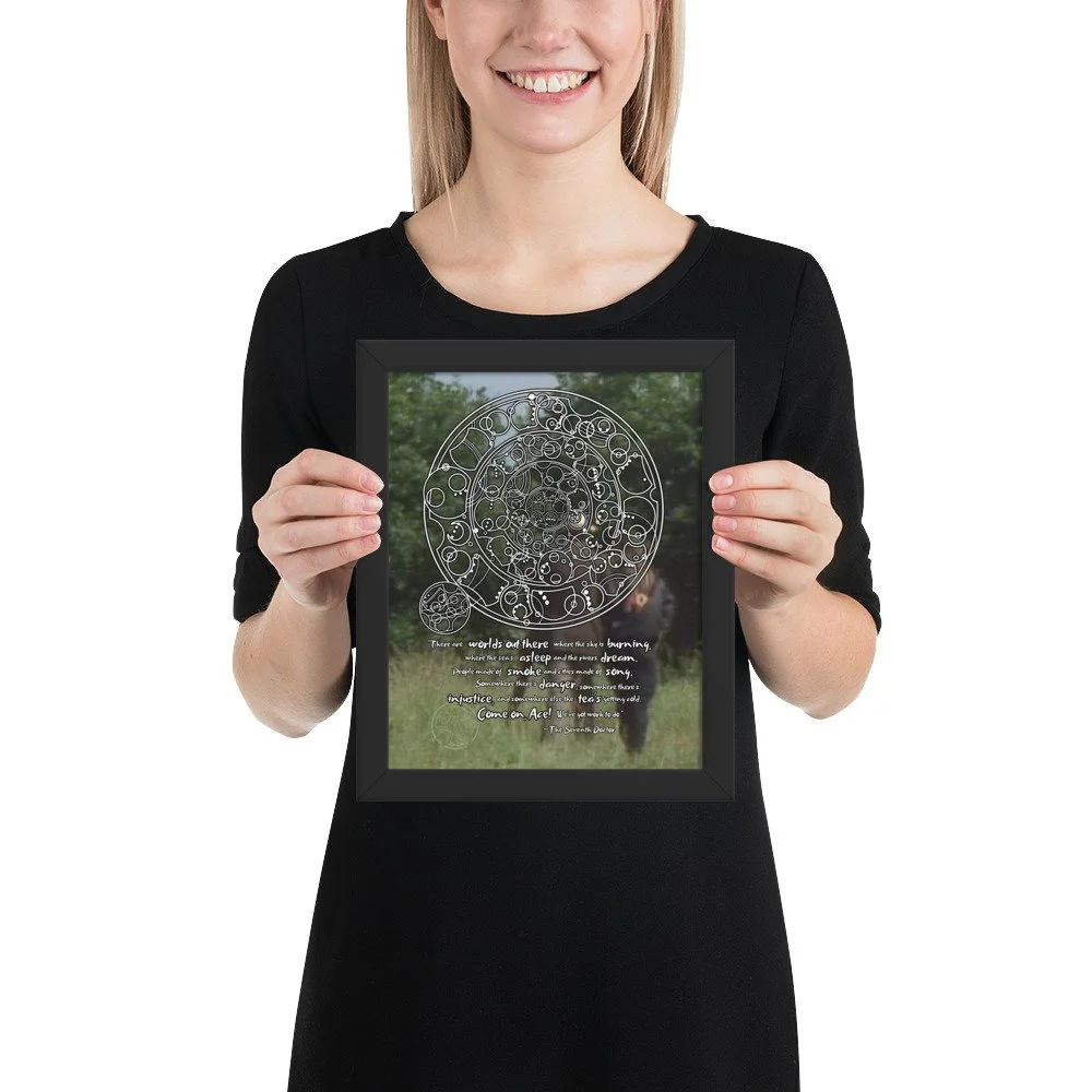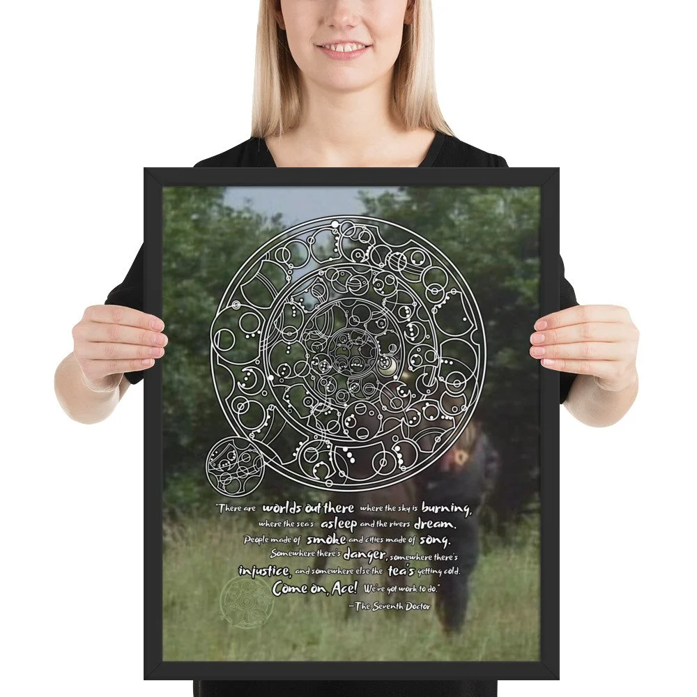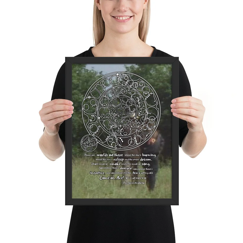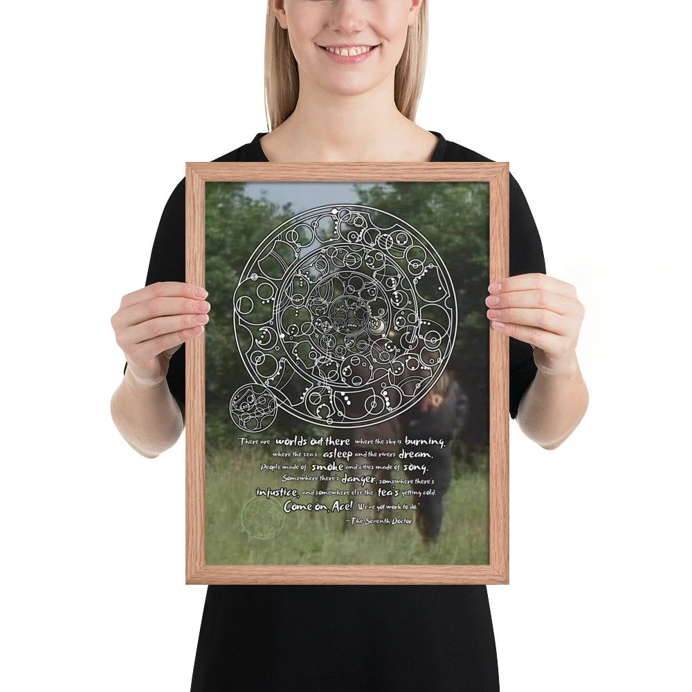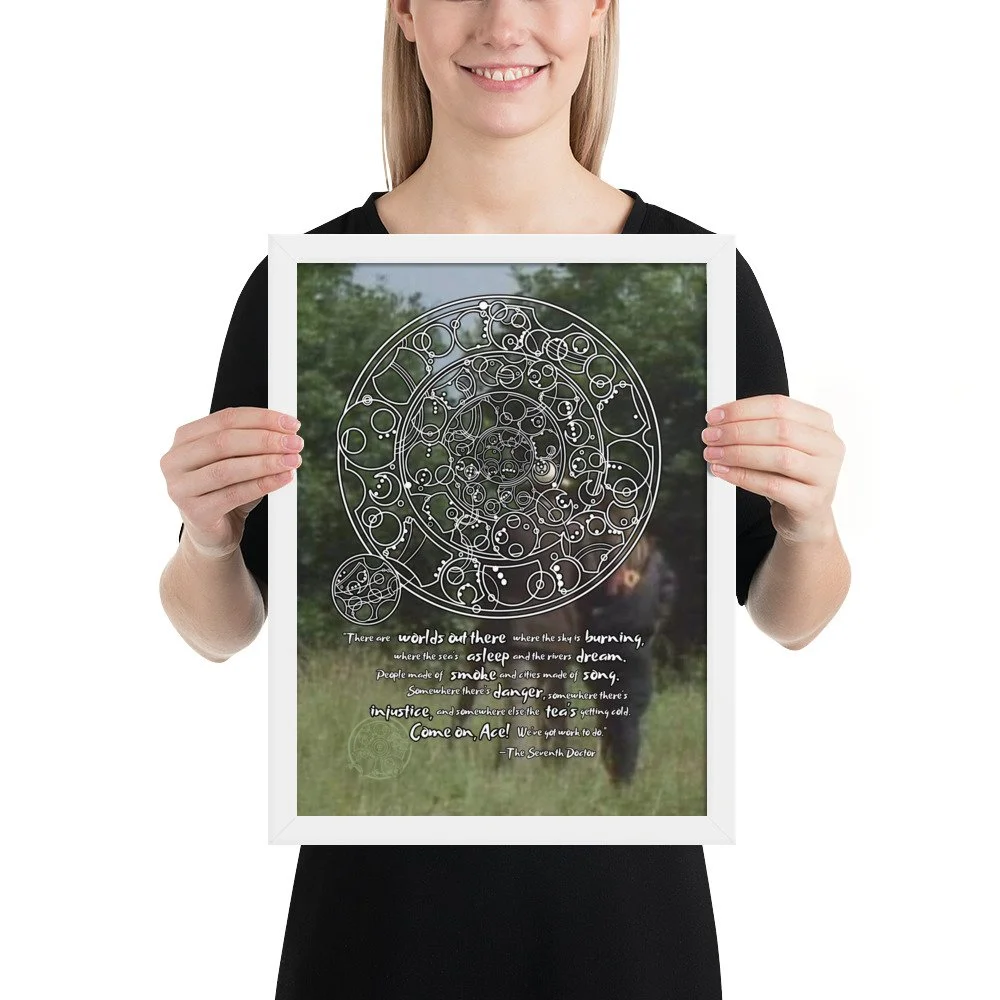 Doctor Who 7th Doctor Quote in Circular Gallifreyan Framed Poster - 7th Doctor and Ace background - "There are worlds out there where the sky is burning..."