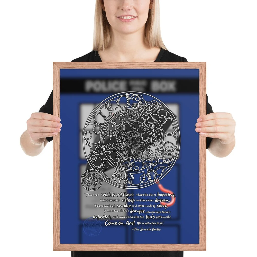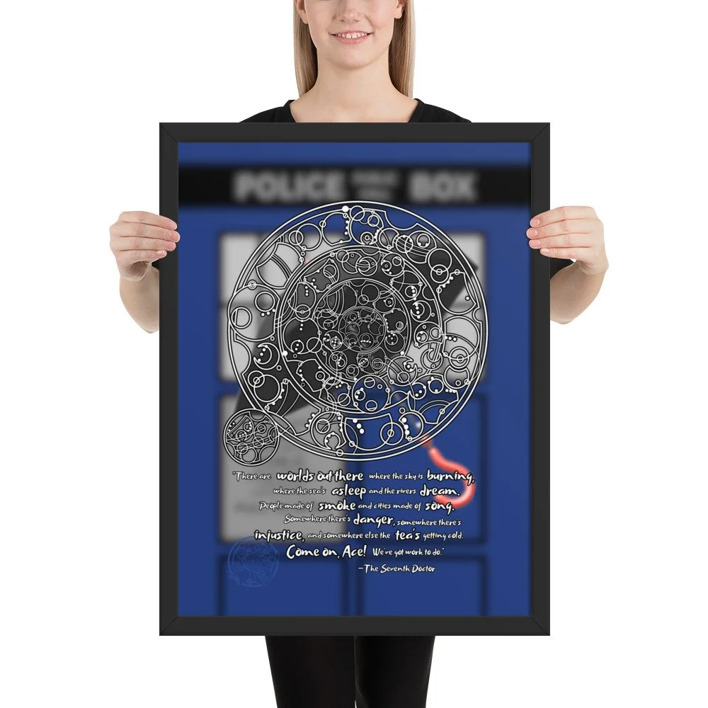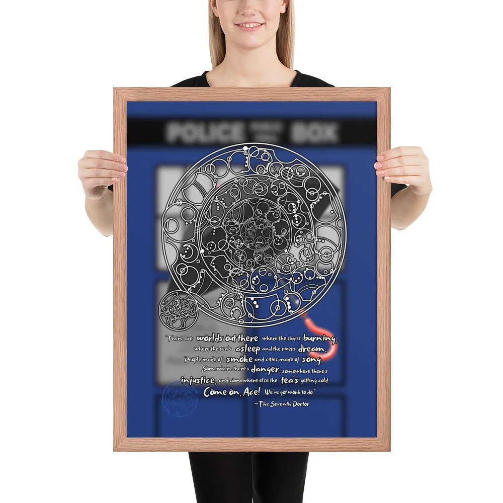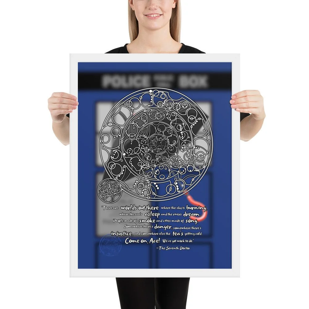 Bring home the 7th Doctor's spirit of adventure with his famous monologue from "Survival" - the final words spoken in the classic era of Doctor Who. This print features a TARDIS background and Sylvester McCoy's signature umbrella. "There are worlds out there where the sky is burning, where the sea's asleep, and the rivers dream. People made of smoke and cities made of song. Somewhere there's danger, somewhere there's injustice, and somewhere else the tea's getting cold. Come on, Ace! We've got work to do."