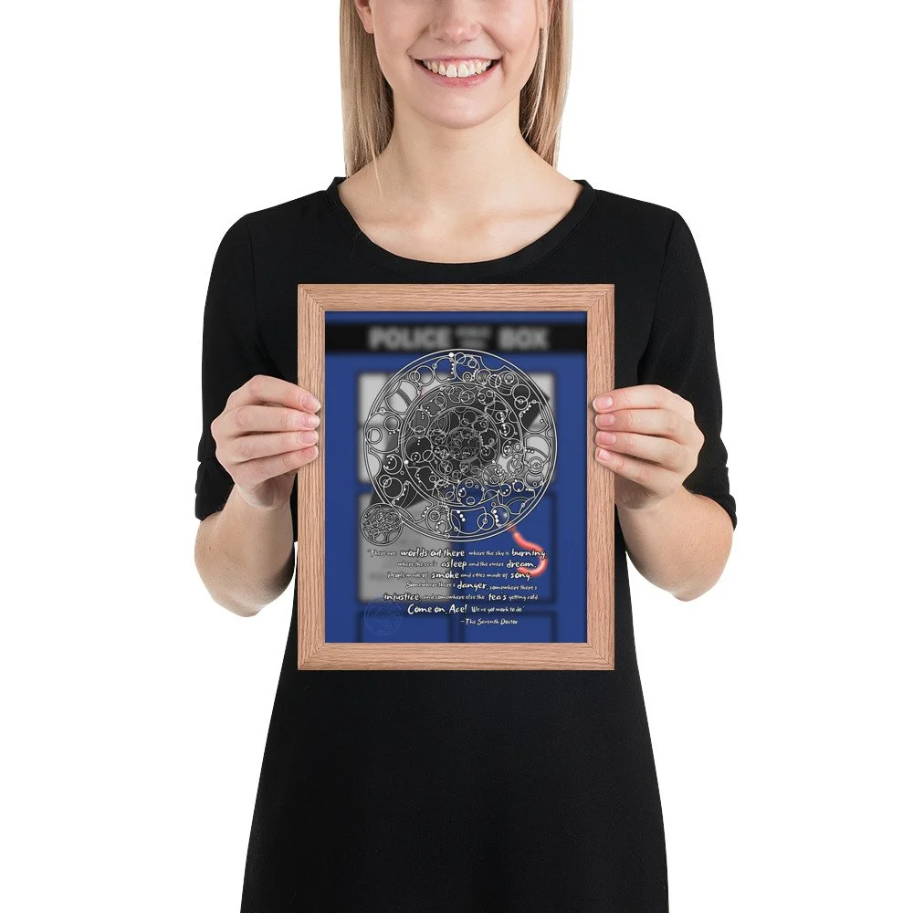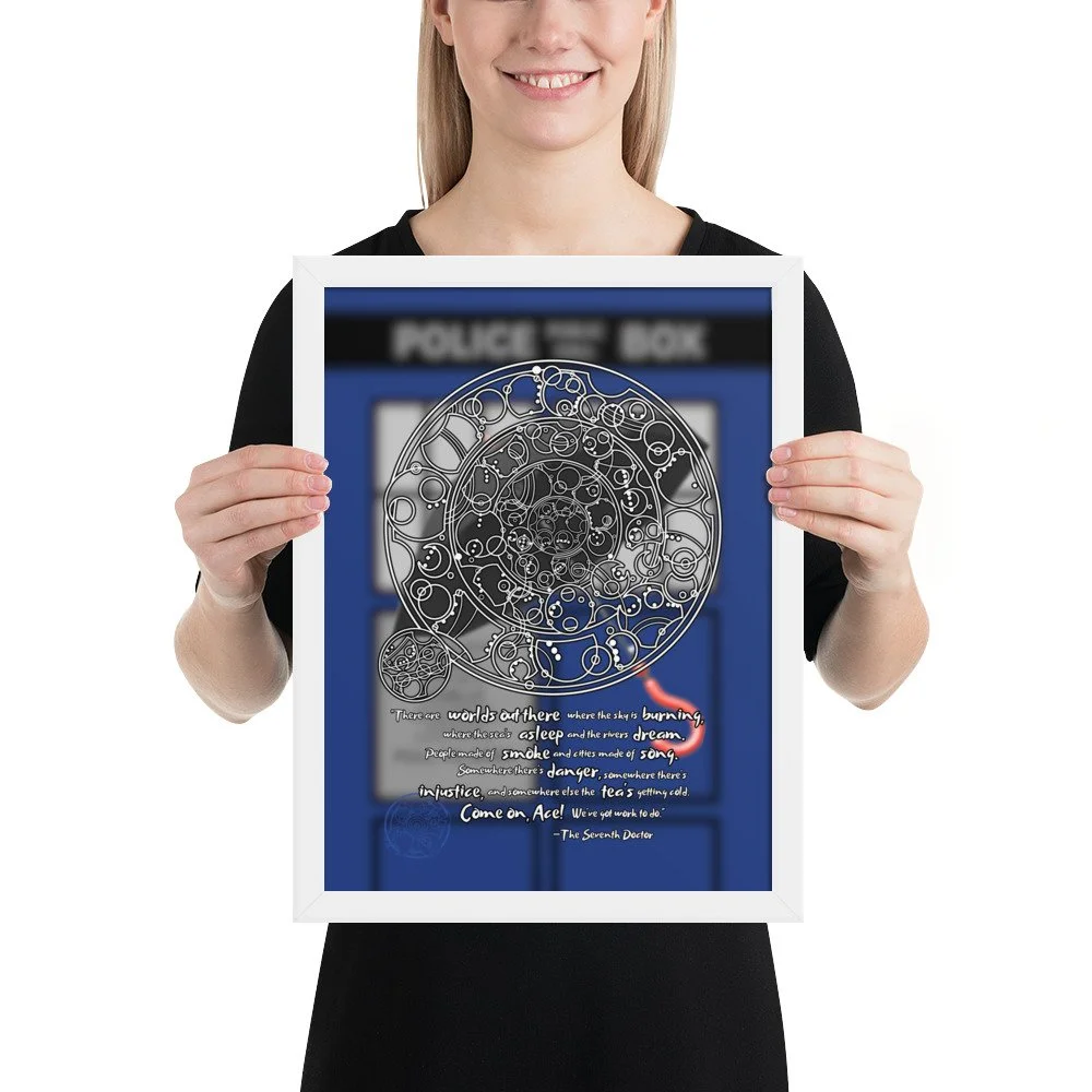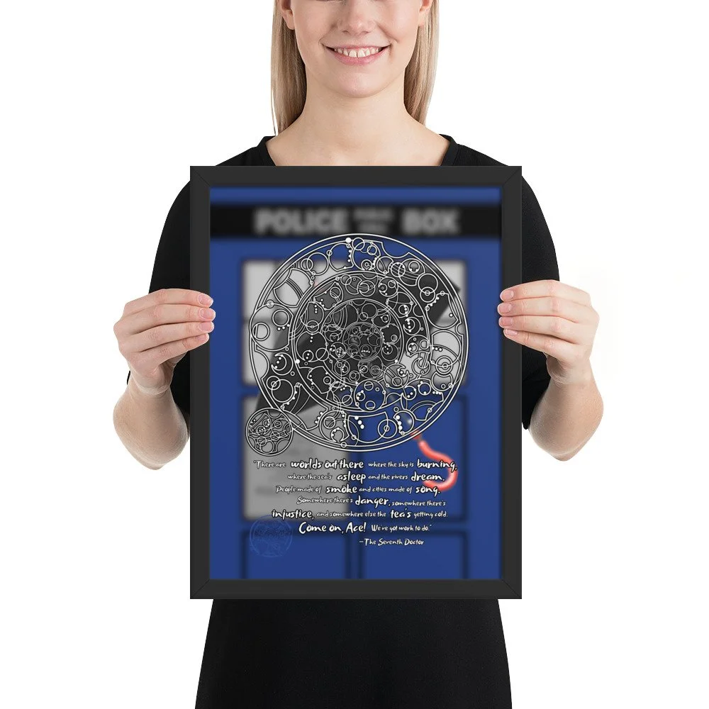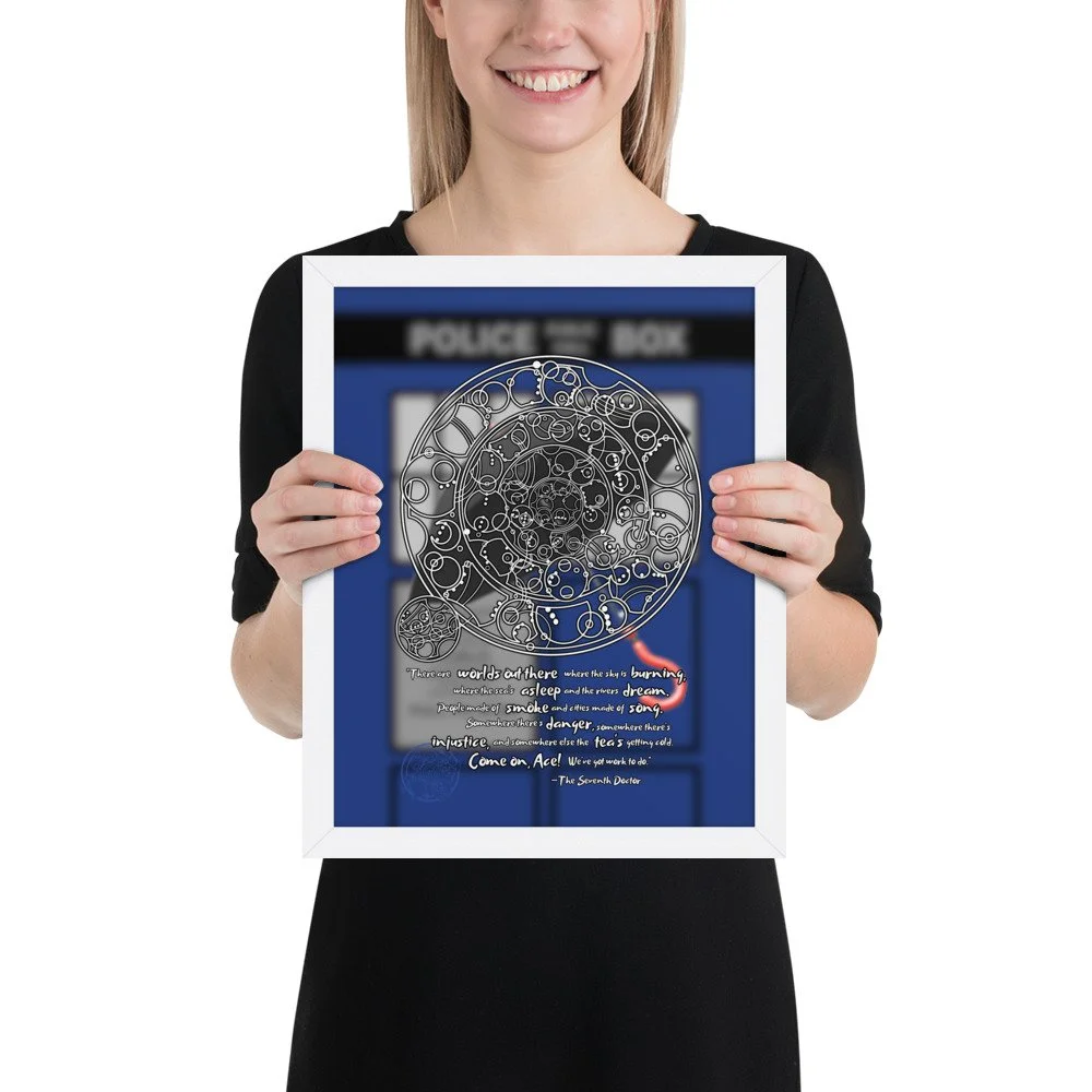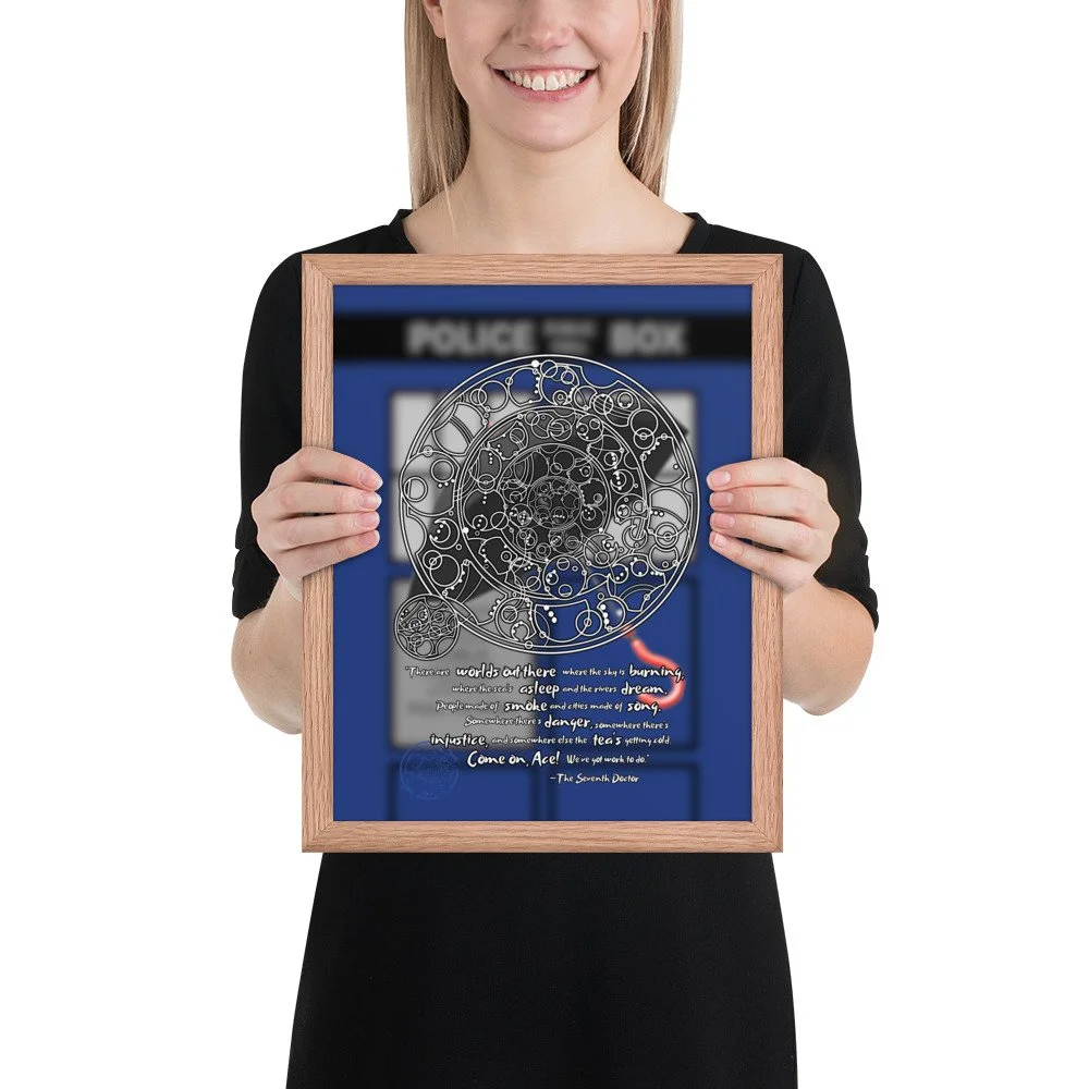 Bring home the 7th Doctor's spirit of adventure with his famous monologue from "Survival" - the final words spoken in the classic era of Doctor Who. This print features a TARDIS background and Sylvester McCoy's signature umbrella. "There are worlds out there where the sky is burning, where the sea's asleep, and the rivers dream. People made of smoke and cities made of song. Somewhere there's danger, somewhere there's injustice, and somewhere else the tea's getting cold. Come on, Ace! We've got work to do."