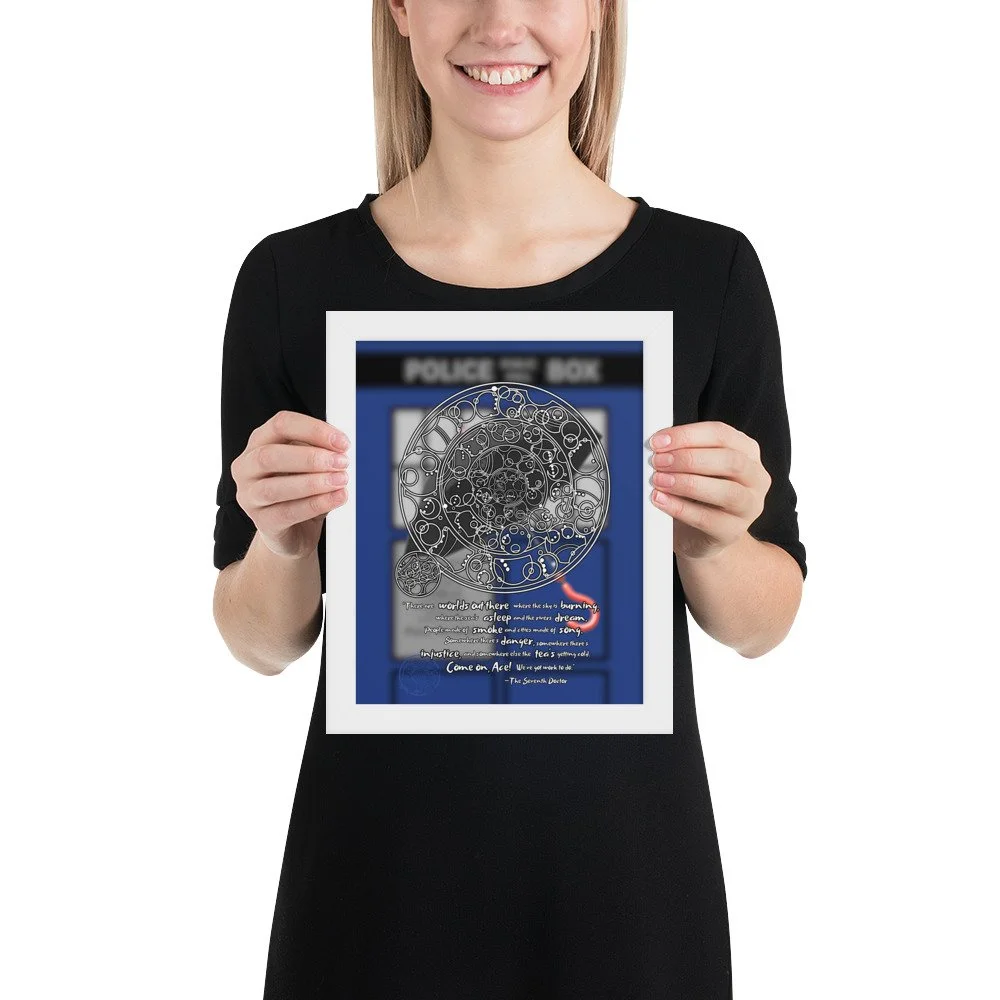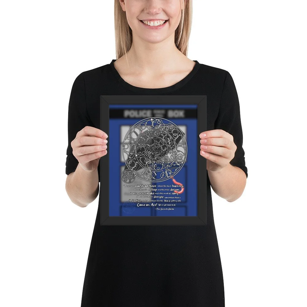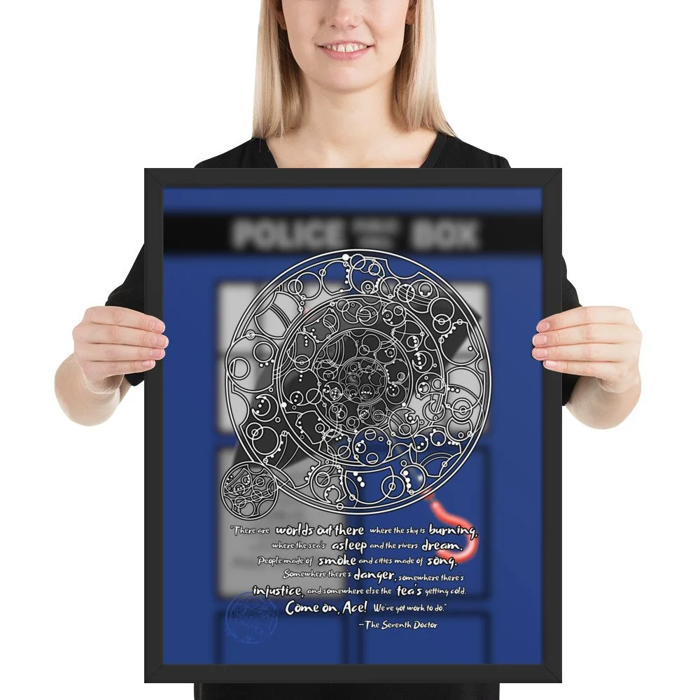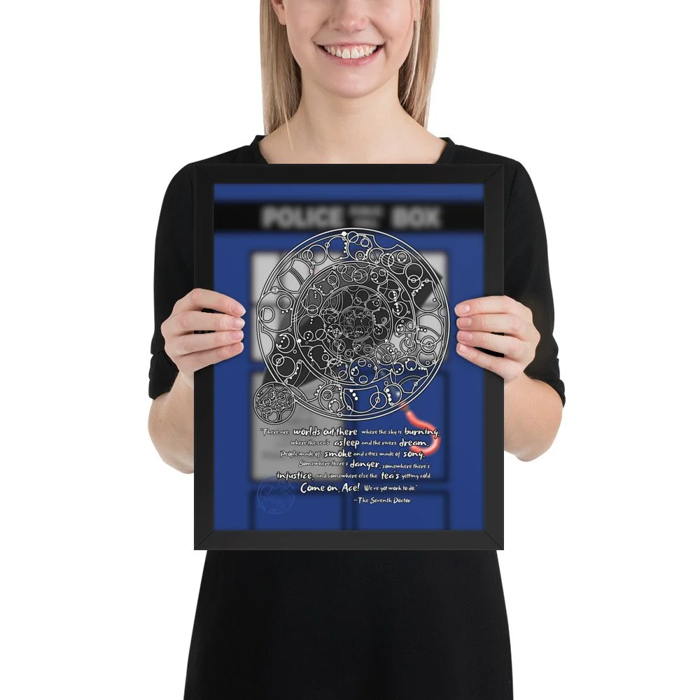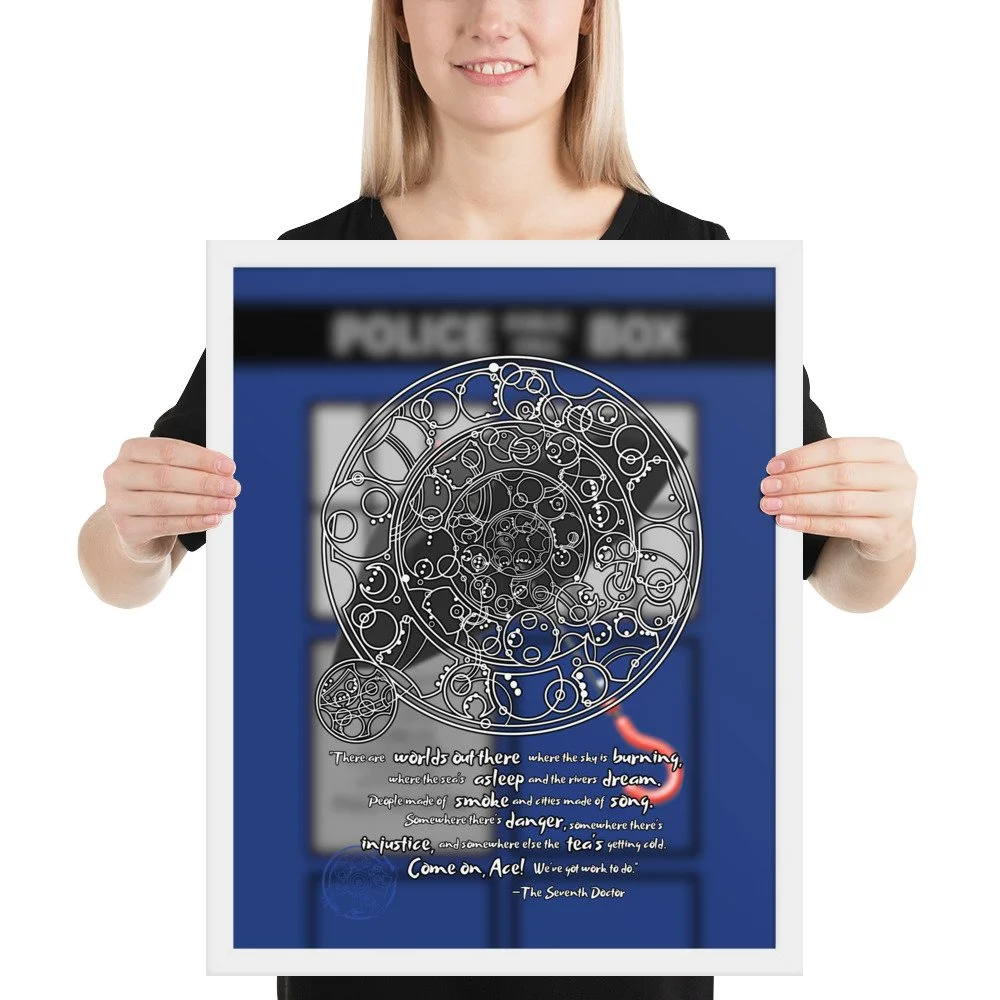 Doctor Who 7th Doctor Quote in Circular Gallifreyan Framed Poster - TARDIS and umbrella background - "There are worlds out there where the sky is burning..."
