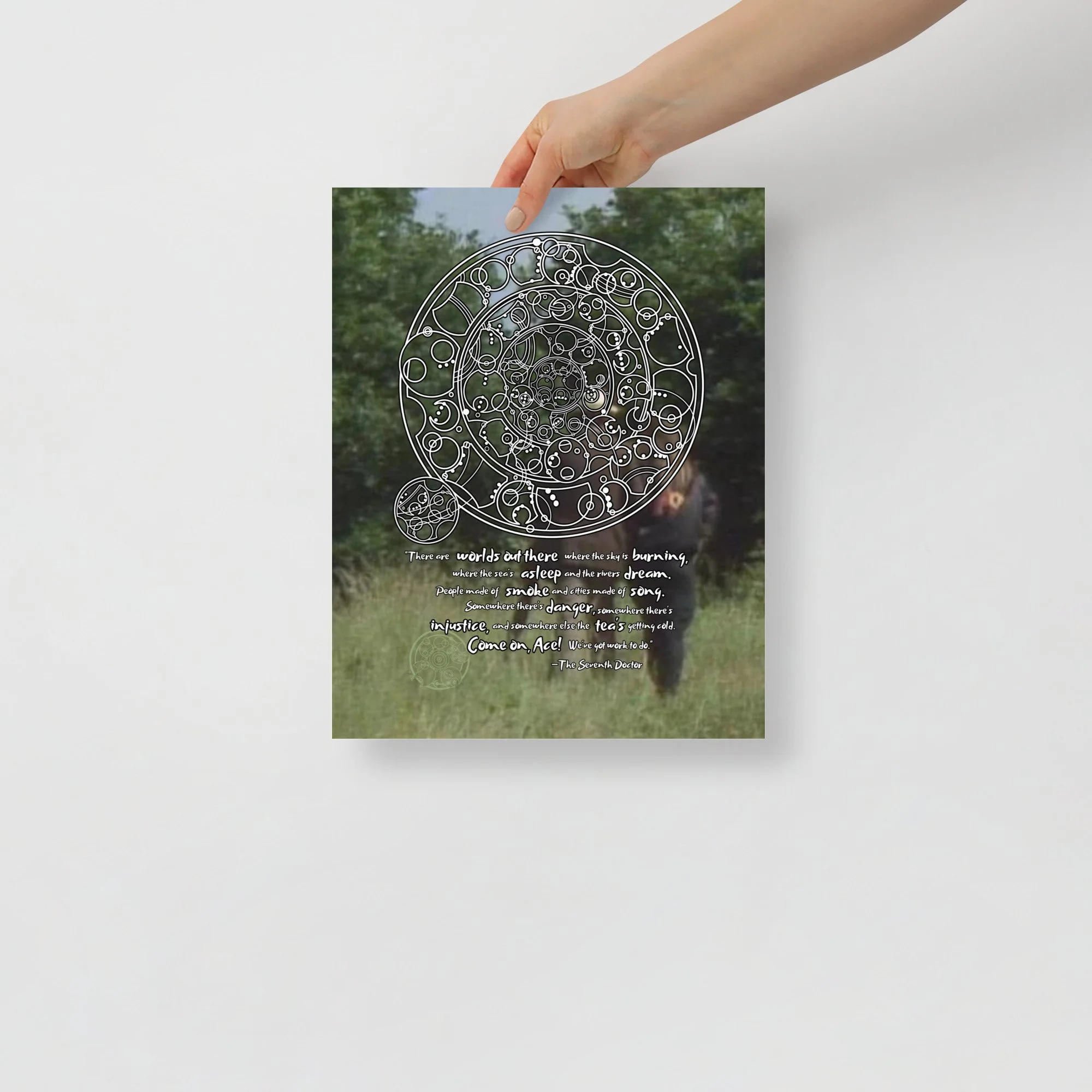 Doctor Who 7th Doctor Quote in Circular Gallifreyan Poster - 7th Doctor and Ace background - "There are worlds out there where the sky is burning..."