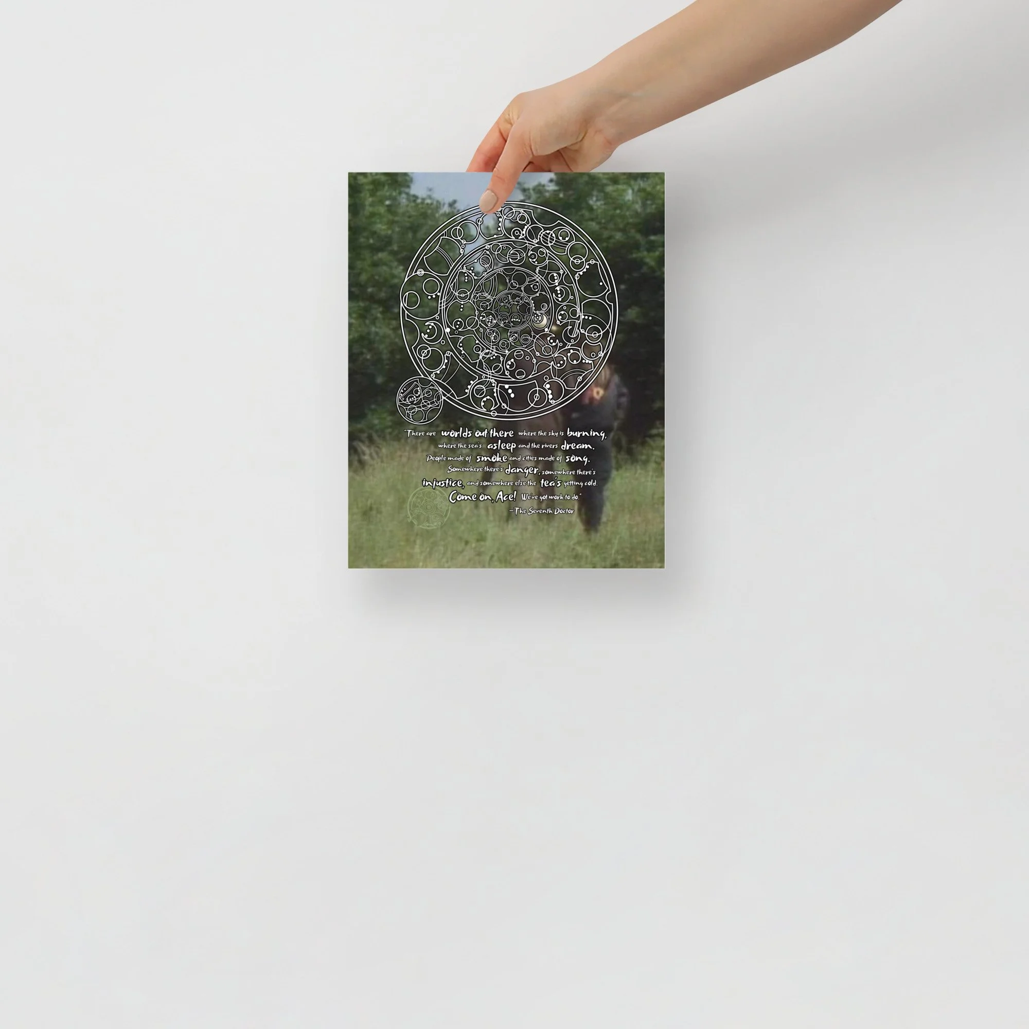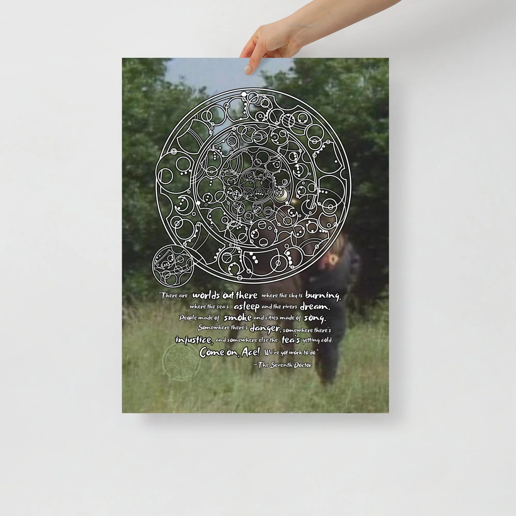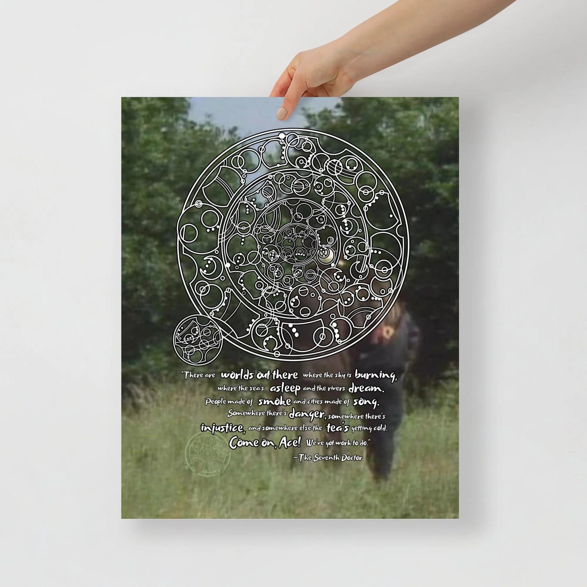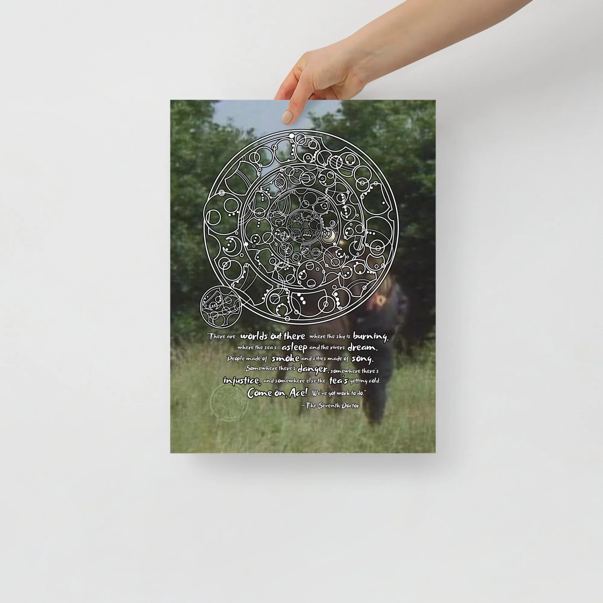 Bring home the 7th Doctor's spirit of adventure with his famous monologue from "Survival" - the final words spoken in the classic era of Doctor Who. This print features Sylvester McCoy and Sophie Aldred walking into the background. "There are worlds out there where the sky is burning, where the sea's asleep, and the rivers dream. People made of smoke and cities made of song. Somewhere there's danger, somewhere there's injustice, and somewhere else the tea's getting cold. Come on, Ace! We've got work to do."