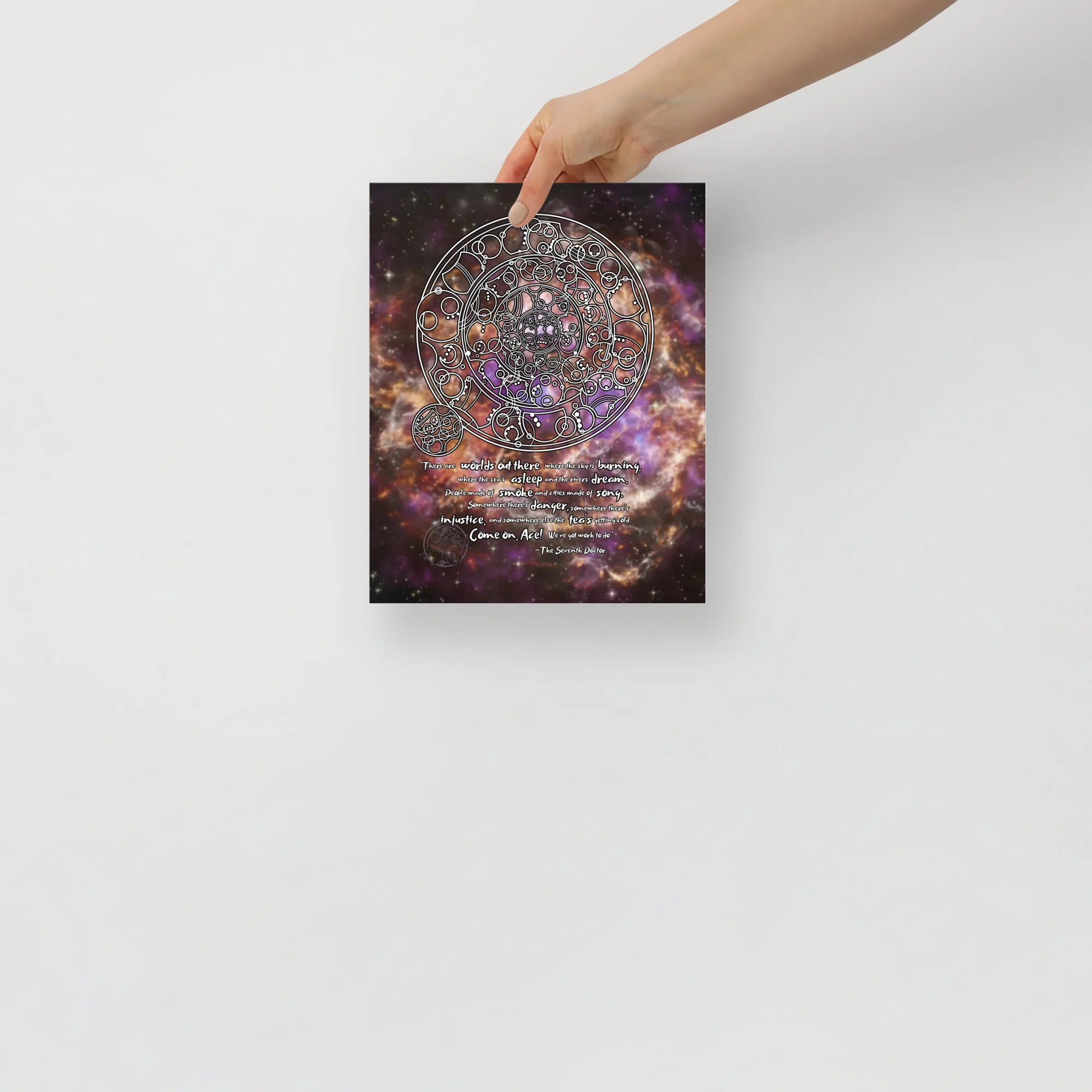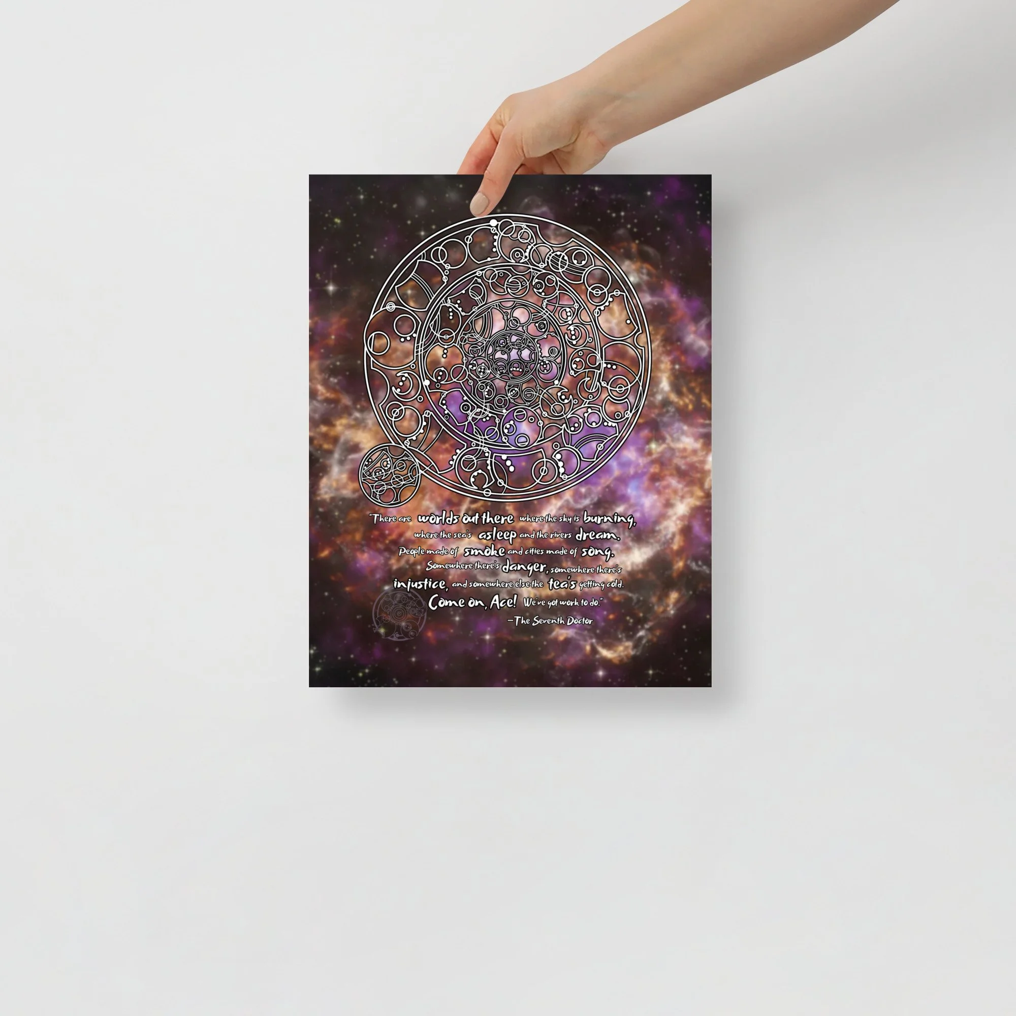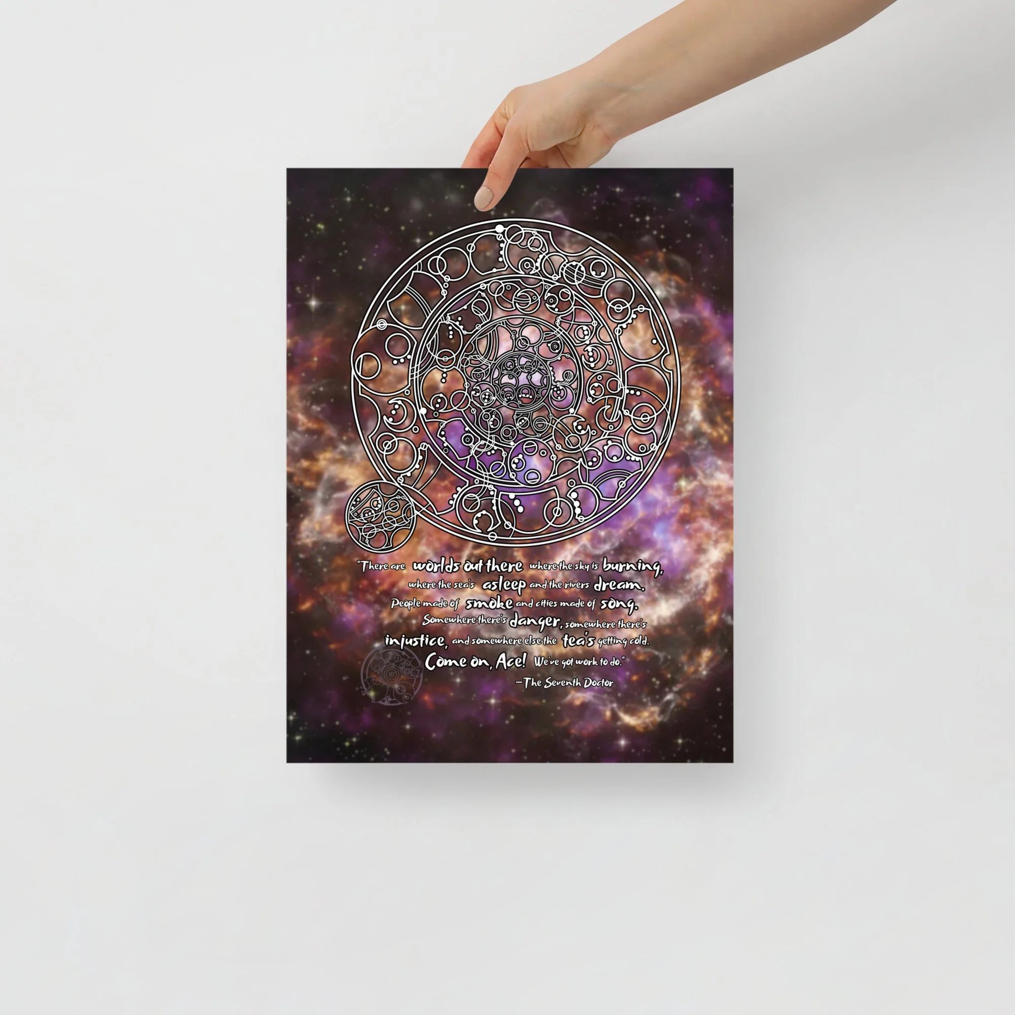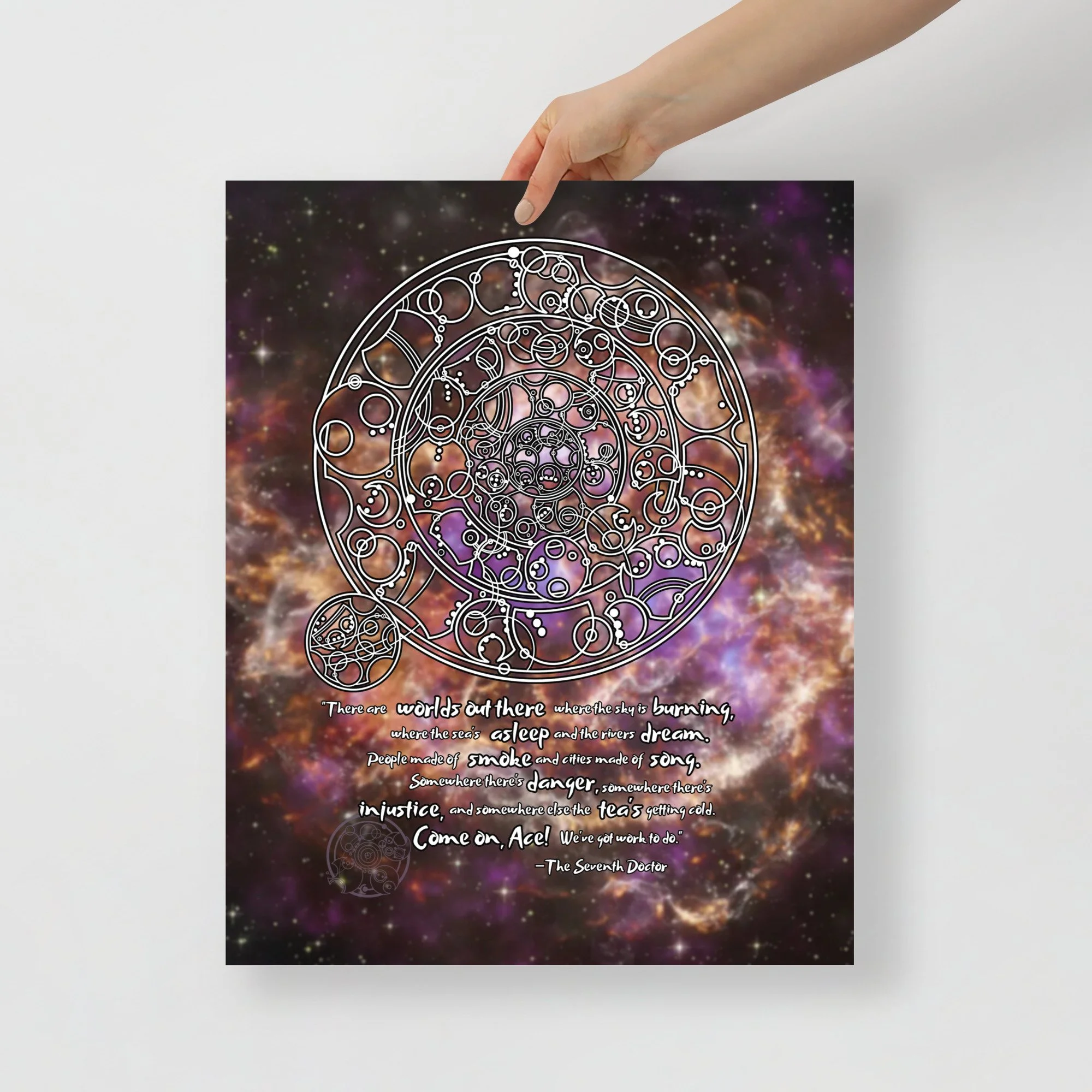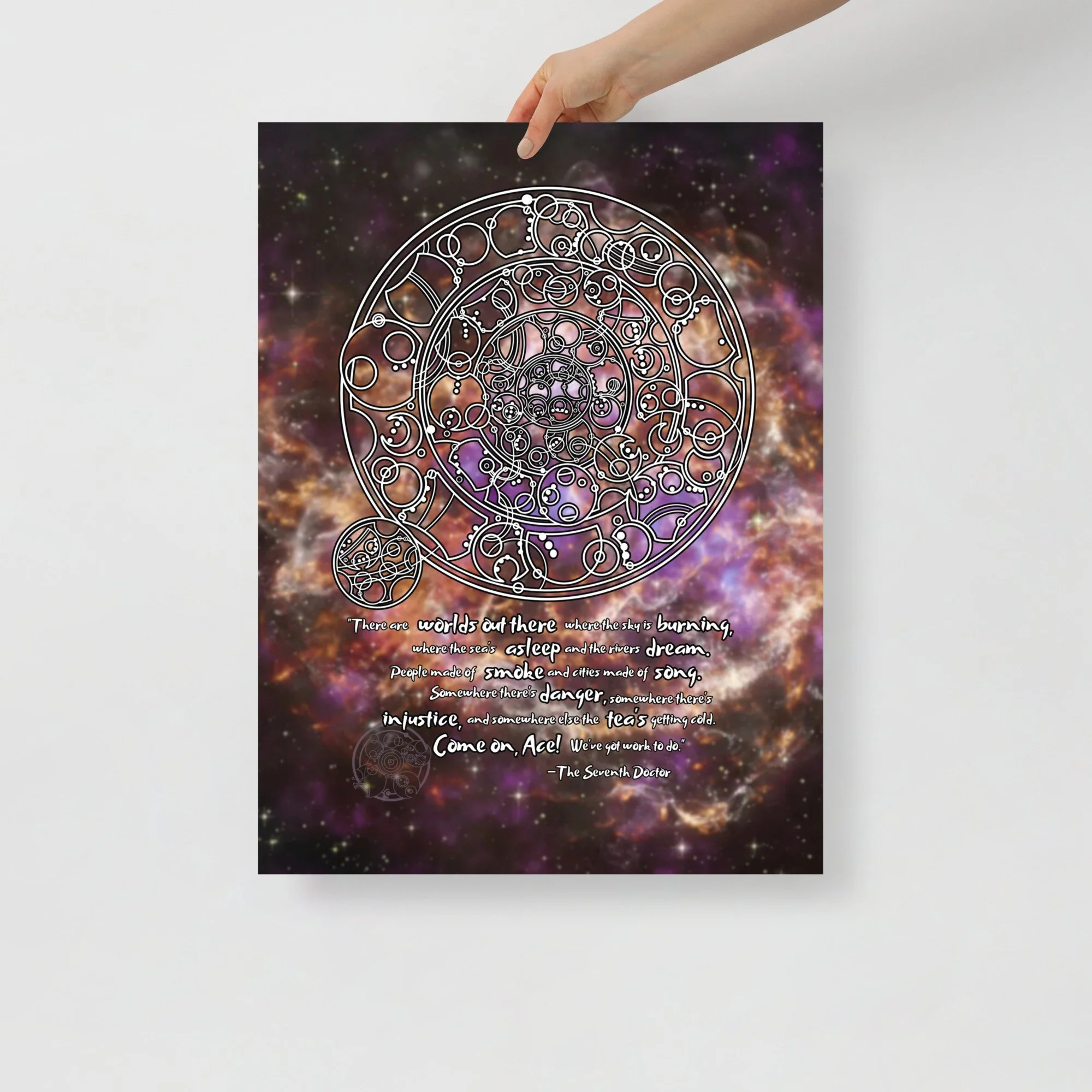 Bring home the 7th Doctor's spirit of adventure with his famous monologue from "Survival" - the final words spoken in the classic era of Doctor Who. This print features a starfield background. "There are worlds out there where the sky is burning, where the sea's asleep, and the rivers dream. People made of smoke and cities made of song. Somewhere there's danger, somewhere there's injustice, and somewhere else the tea's getting cold. Come on, Ace! We've got work to do."