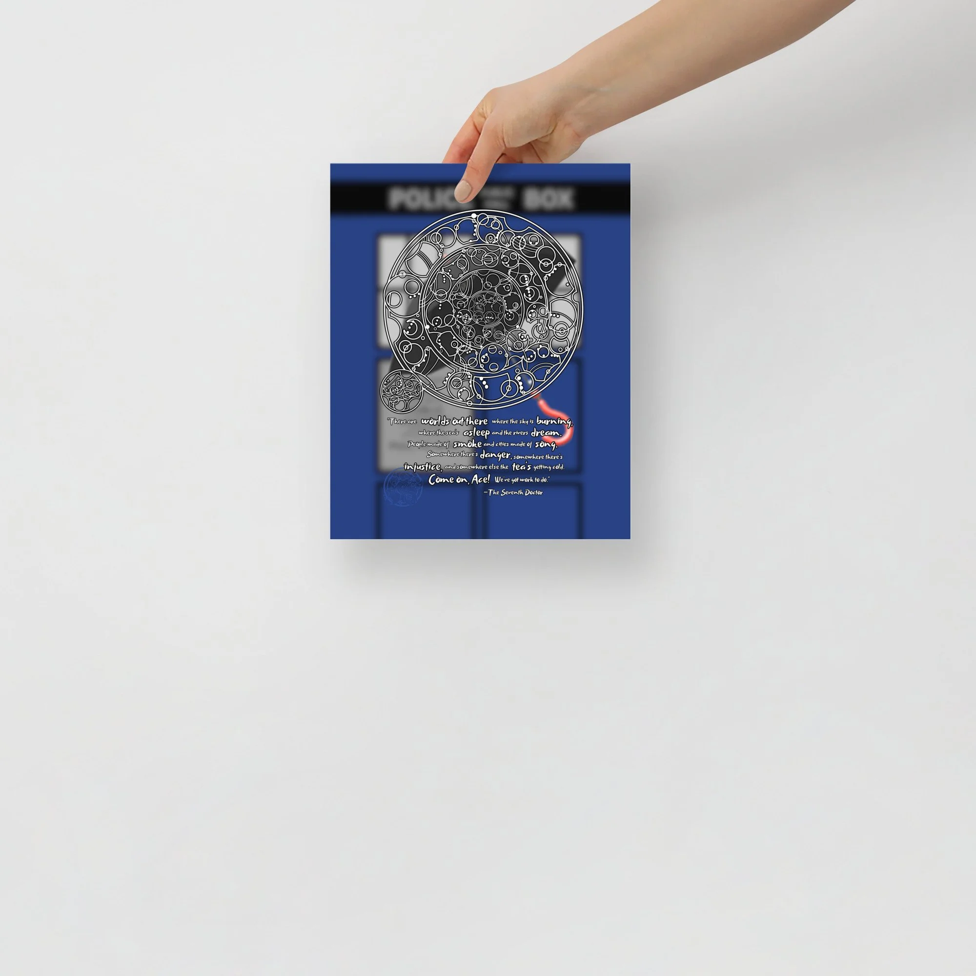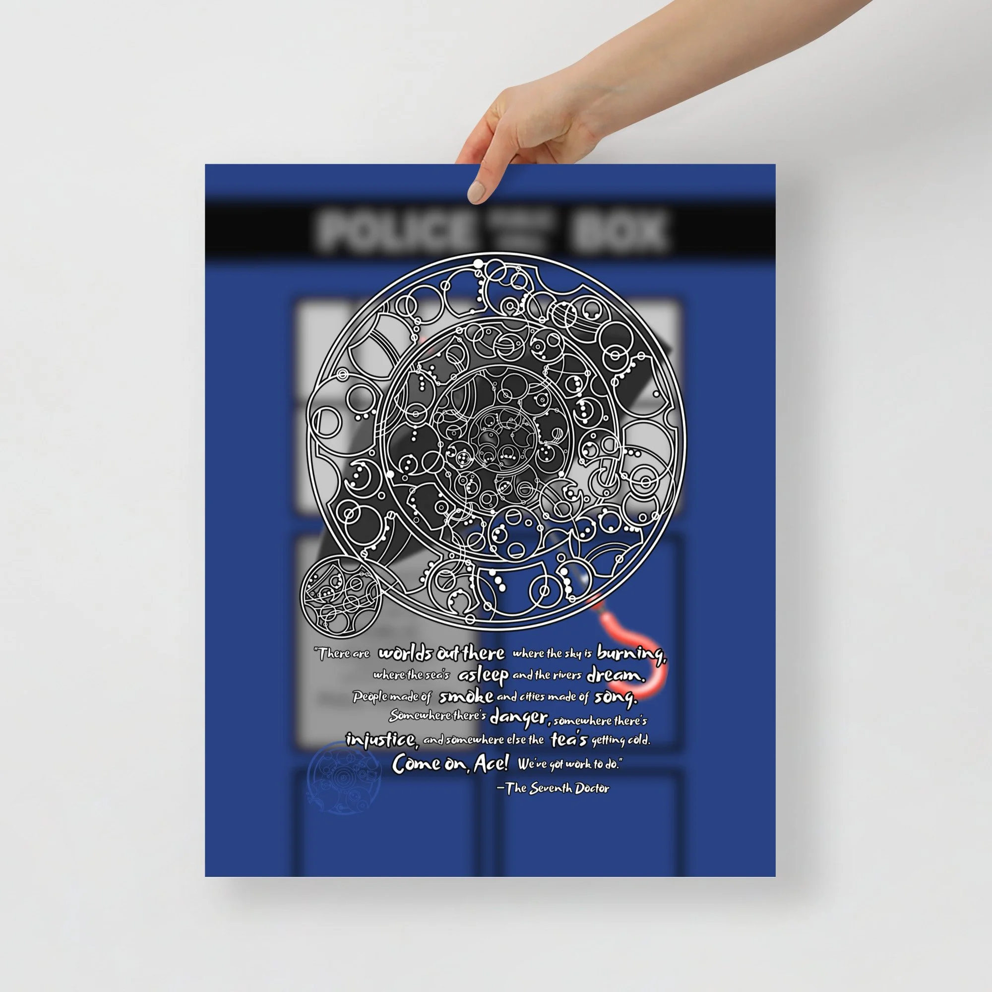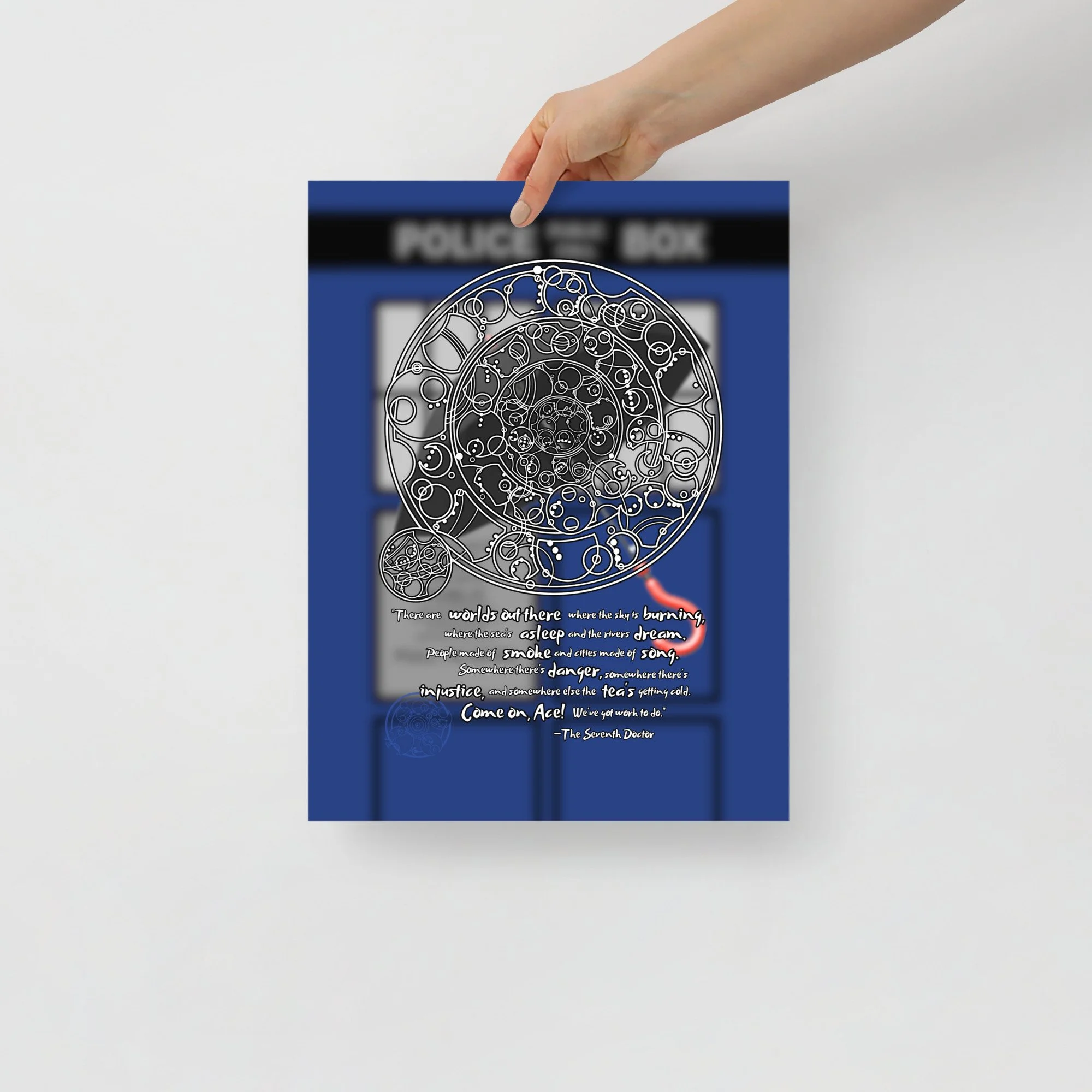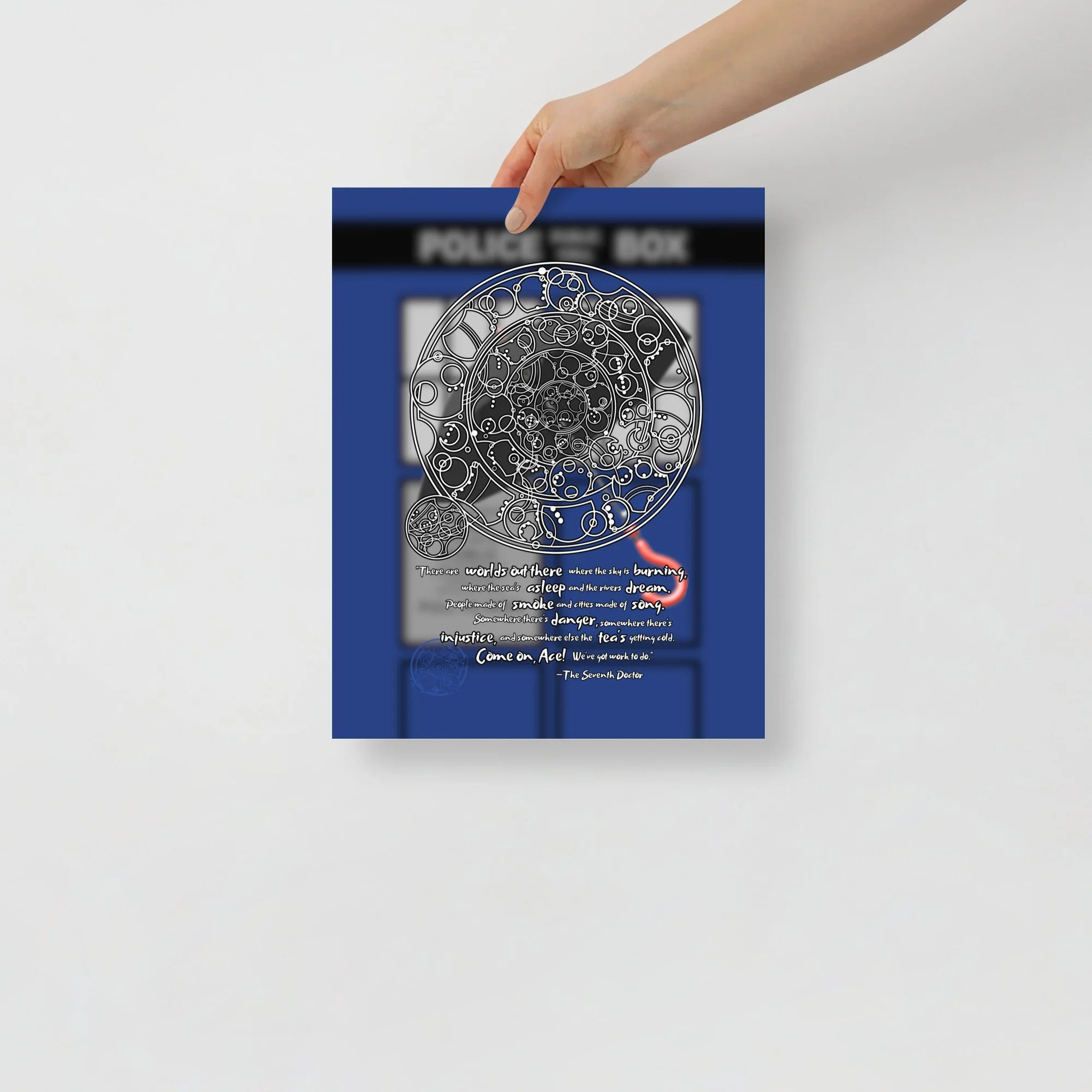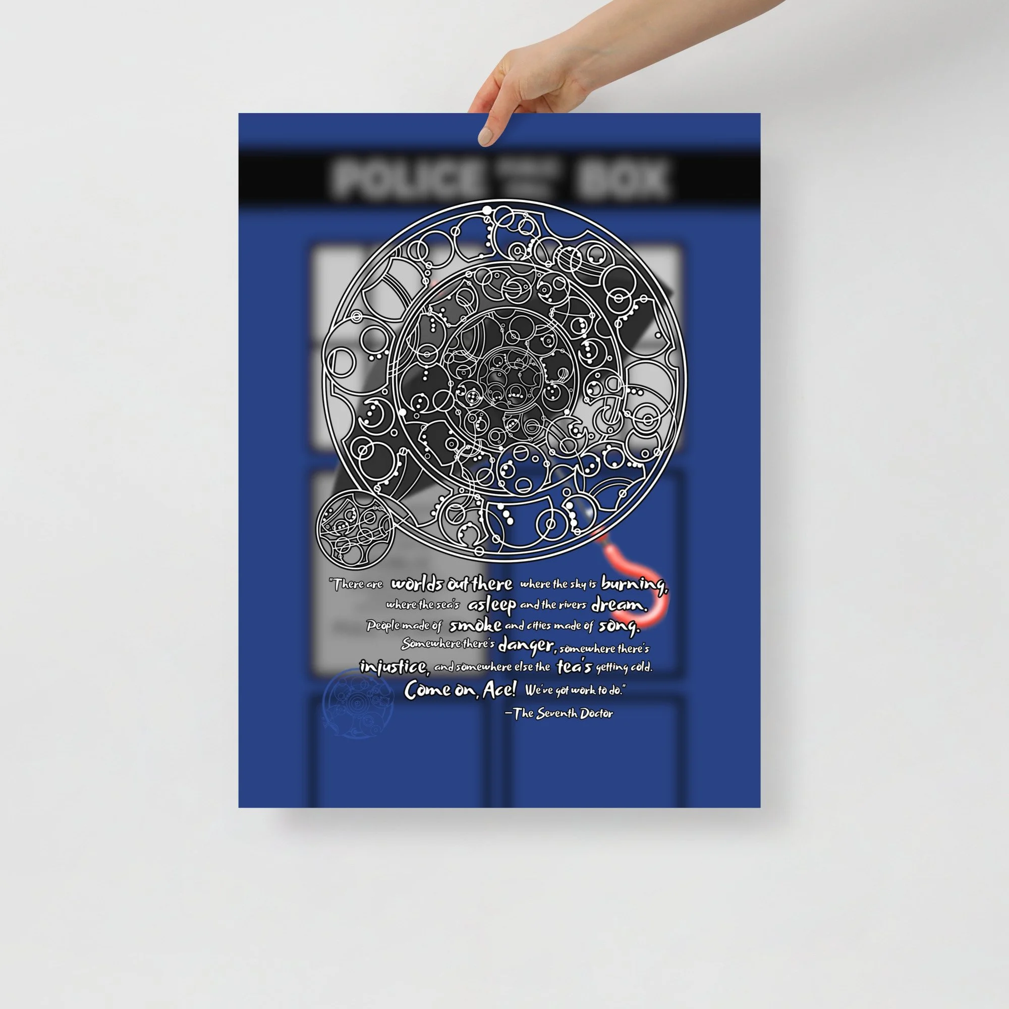 Bring home the 7th Doctor's spirit of adventure with his famous monologue from "Survival" - the final words spoken in the classic era of Doctor Who. This print features a TARDIS background and Sylvester McCoy's signature umbrella. "There are worlds out there where the sky is burning, where the sea's asleep, and the rivers dream. People made of smoke and cities made of song. Somewhere there's danger, somewhere there's injustice, and somewhere else the tea's getting cold. Come on, Ace! We've got work to do."